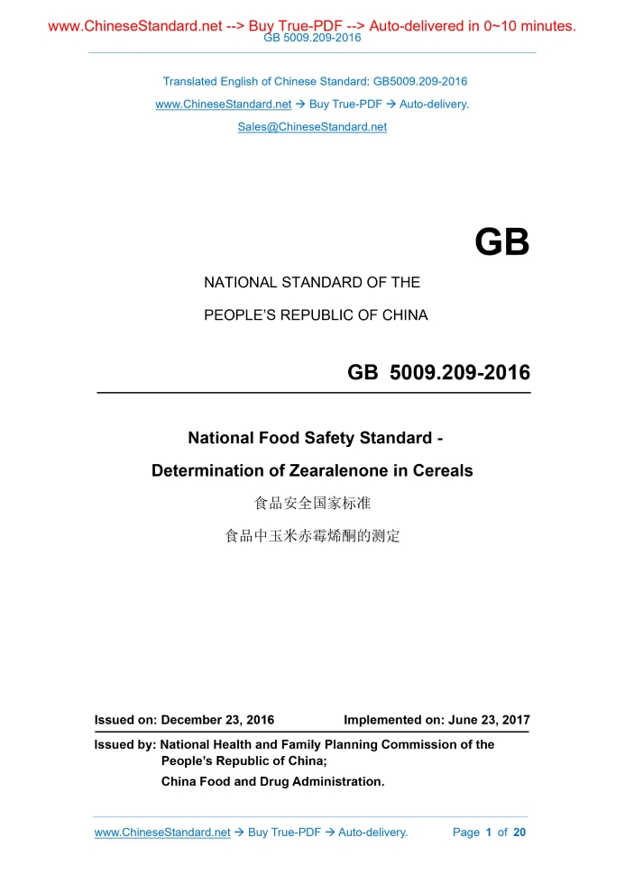 GB 5009.209-2016: National food safety standard - Determination of Zearalenone in Cereals Delivery: 9 seconds. True-PDF full-copy in English & invoice will be downloaded + auto-delivered via email. See step-by-step procedure Status: Valid GB 5009.209: Historical versions