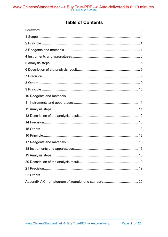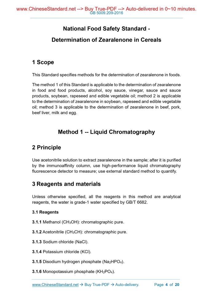 Similar standardsGB 5009.209-2016: National food safety standard - Determination of Zearalenone in Cereals---This is an excerpt. Full copy of true-PDF in English version (including equations, symbols, images, flow-chart, tables, and figures etc.), auto-downloaded/delivered in 9 seconds, can be purchased online: https://www.ChineseStandard.net/PDF.aspx/GB5009.209-2016NATIONAL STANDARD OF THE PEOPLE’S REPUBLIC OF CHINA National Food Safety Standard - Determination of Zearalenone in Cereals ISSUED ON: DECEMBER 23, 2016 IMPLEMENTED ON: JUNE 23, 2017 Issued by: National Health and Family Planning Commission of the People’s Republic of China; China Food and Drug Administration. Table of ContentsForeword ... 3 1 Scope ... 4 2 Principle ... 4 3 Reagents and materials ... 4 4 Instruments and apparatuses ... 6 5 Analysis steps ... 6 6 Description of the analysis result ... 9 7 Precision ... 9 8 Others ... 9 9 Principle ... 10 10 Reagents and materials ... 10 11 Instruments and apparatuses ... 11 12 Analysis steps ... 11 13 Description of the analysis result ... 12 14 Precision ... 13 15 Others ... 13 16 Principle ... 13 17 Reagents and materials ... 13 18 Instruments and apparatuses ... 15 19 Analysis steps ... 15 20 Description of the analysis result ... 19 21 Precision ... 19 22 Others ... 19 Appendix A Chromatogram of zearalenone standard ... 20 National Food Safety Standard - Determination of Zearalenone in Cereals1 ScopeThis Standard specifies methods for the determination of zearalenone in foods. The method 1 of this Standard is applicable to the determination of zearalenone in food and food products, alcohol, soy sauce, vinegar, sauce and sauce products, soybean, rapeseed and edible vegetable oil; method 2 is applicable to the determination of zearalenone in soybean, rapeseed and edible vegetable oil; method 3 is applicable to the determination of zearalenone in beef, pork, beef liver, milk and egg. Method 1 -- Liquid Chromatography2 PrincipleUse acetonitrile solution to extract zearalenone in the sample; after it is purified by the immunoaffinity column, use high-performance liquid chromatography fluorescence detector to measure; use external standard method to quantify. 3 Reagents and materials Unless otherwise specified, all the reagents in this method are analytical reagents, the water is grade-1 water specified by GB/T 6682. 3.1 Reagents 3.1.1 Methanol (CH3OH): chromatographic pure. 3.1.2 Acetonitrile (CH3CH): chromatographic pure. 3.1.3 Sodium chloride (NaCl). 3.1.4 Potassium chloride (KCl). 3.1.5 Disodium hydrogen phosphate (Na2HPO4). 3.1.6 Monopotassium phosphate (KH2PO4). glass-fiber filter paper to filter it until the filtrate is clarified; reserve the filtrate for later use. 5.1.4 Alcohol Take 20.0 g of degassed alcohol sample (alcohols which contain carbon dioxide, before using, shall be placed in a refrigerator at 4°C for 30 min, and filtered or ultrasonically degassed) or other alcohol samples which do not contain carbon dioxide in a 50 mL volumetric flask; use acetonitrile to fix-volume to the scale; shake well. Pipette 10.0 mL of the filtrate; add 40 mL of water; dilute and mix; use a glass-fiber filter paper to filter it until the filtrate is clarified; reserve the filtrate for later use. 5.2 Purification 5.2.1 Food and food products Connect the immunoaffinity column to a glass syringe; accurately transfer 10 mL (equivalent to 0.8 g of samples) of the filtrate in 5.1; inject into the glass syringe. Connect the air pressure pump to the glass syringe; adjust the pressure, so that the solution passes through the immunoaffinity column at a flow rate of 1 drop/s ~ 2 drops/s, until part of the air enters the affinity column. Use 5 mL of water to rinse the column for one time, at a flow rate of 1 drop/s ~ 2 drops/s, until part of the air enters the affinity column; discard all the effluent. Accurately add 1.5 mL of methanol to elute at a flow rate of about 1 drop/s. Collect the eluate in a glass test tube; use nitrogen to dry at 55°C or lower; then, use 1.0 mL of the mobile phase to dissolve the residue, which is for liquid chromatography determination. 5.2.2 Soy sauce, vinegar, sauce and sauce products, alcohol Connect the immunoaffinity column to a glass syringe; accurately transfer 10.0 mL of the filtrate in 5.1.2 or 5.1.4; inject into the glass syringe. Connect the air pressure pump to the glass syringe; adjust the pressure, so that the solution slowly passes through the immunoaffinity column at a flow rate of 1 drop/s ~ 2 drops/s, until part of the air enters the affinity column. Successively use 10 mL of PBS washing buffer and 10 mL of water to rinse the immunoaffinity column, at a flow rate of 1 drop/s ~ 2 drops/s, until the air enters the affinity column; discard all the effluent. Accurately add 1.0 mL of methanol to elute at a flow rate of about 1 drop/s. Collect the eluate in a glass test tube; use nitrogen to dry at 55°C or lower; then, use 1.0 mL of the mobile phase to dissolve the residue, which is for liquid chromatography determination. 5.2.3 Soybean, rapeseed, edible vegetable oil Connect the immunoaffinity column to a glass syringe; accurately transfer 10 mL of filtrate in 5.1.3; inject into the glass syringe. Connect the air pressure Method 2 -- Fluorescence spectrophotometry9 PrincipleUse acetonitrile solution to extract zearalenone in the sample; purify through the immunoaffinity column; then, add aluminum chloride solution for derivation. Use a fluorometer to determine the eluent.10 Reagents and materialsUnless otherwise specified, all the reagents in this method are analytical reagents, the water is grade-1 water specified by GB/T 6682. 10.1 Reagents 10.1.1 Acetonitrile (CH3CH): chromatographic pure. 10.1.2 Methanol (CH3OH): chromatographic pure. 10.1.3 Sodium chloride (NaCl). 10.1.4 Disodium hydrogen phosphate (Na2HPO4). 10.1.5 Monopotassium phosphate (KH2PO4). 10.1.6 Potassium chloride (KCl). 10.1.7 Tween-20 (C58H114O26). 10.1.8 Hydrochloric acid (HC