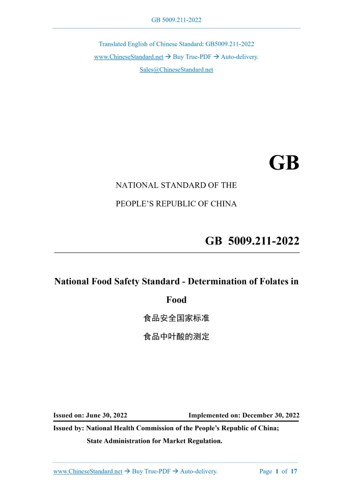 GB 5009.211-2022: National food safety standard - Determination of folates in food Delivery: 9 seconds. True-PDF full-copy in English & invoice will be downloaded + auto-delivered via email. See step-by-step procedure Status: Valid GB 5009.211: Historical versions