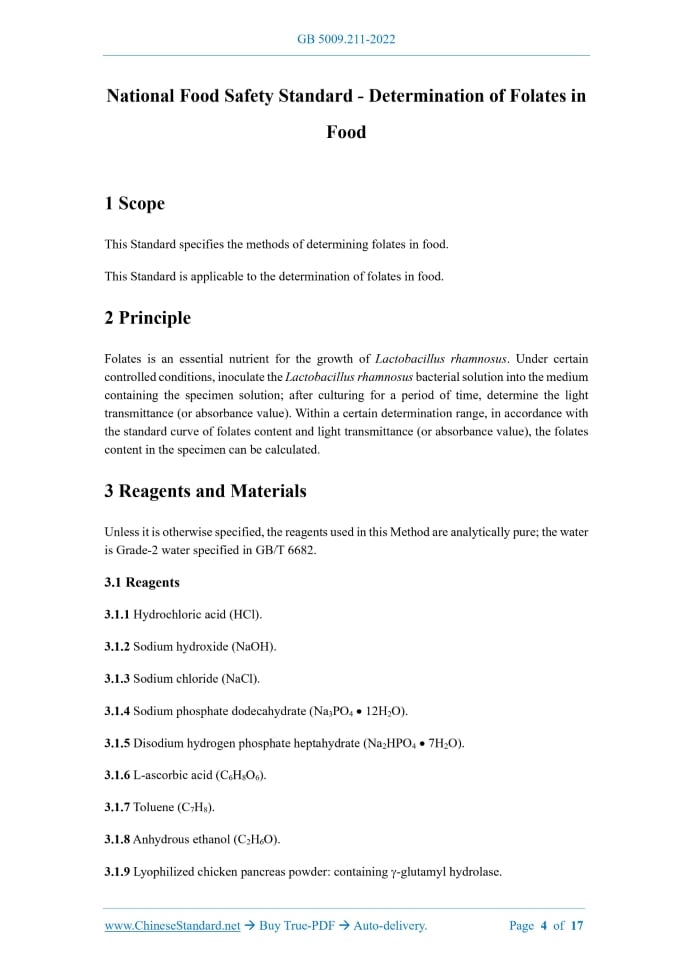 Similar standardsGB 5009.211-2022: National food safety standard - Determination of folates in food---This is an excerpt. Full copy of true-PDF in English version (including equations, symbols, images, flow-chart, tables, and figures etc.), auto-downloaded/delivered in 9 seconds, can be purchased online: https://www.ChineseStandard.net/PDF.aspx/GB5009.211-2022NATIONAL STANDARD OF THE PEOPLE’S REPUBLIC OF CHINA National Food Safety Standard - Determination of Folates in Food Issued on. JUNE 30, 2022 Implemented on. DECEMBER 30, 2022 Issued by. National Health Commission of the People’s Republic of China; State Administration for Market Regulation. Table of ContentsForeword... 3 1 Scope... 4 2 Principle... 4 3 Reagents and Materials... 4 4 Instruments and Equipment... 6 5 Preparation and Stock of Strains... 7 6 Analytical Procedures (all operations must be performed in the dark)... 7 7 Expression of Analytical Results... 10 8 Precision... 12 9 Others... 12 Appendix A Preparation of Culture Medium... 13ForewordThis Standard serves as a replacement of GB 5009.211-2014 National Food Safety Standard – Determination of Folates in Food. In comparison with GB 5009.211-2014, the main changes are as follows. ---the determination method with microplate is added; ---the requirements for precision are modified; ---Appendix A is modified. National Food Safety Standard - Determination of Folates in Food1 ScopeThis Standard specifies the methods of determining folates in food. This Standard is applicable to the determination of folates in food.2 PrincipleFolates is an essential nutrient for the growth of Lactobacillus rhamnosus. Under certain controlled conditions, inoculate the Lactobacillus rhamnosus bacterial solution into the medium containing the specimen solution; after culturing for a period of time, determine the light transmittance (or absorbance value). Within a certain determination range, in accordance with the standard curve of folates content and light transmittance (or absorbance value), the folates content in the specimen can be calculated.3 Reagents and MaterialsUnless it is otherwise specified, the reagents used in this Method are analytically pure; the water is Grade-2 water specified in GB/T 6682. 3.1 Reagents 3.1.1 Hydrochloric acid (HCl). 3.1.2 Sodium hydroxide (NaOH). 3.1.3 Sodium chloride (NaCl). 3.1.4 Sodium phosphate dodecahydrate (Na3PO4 12H2O). 3.1.5 Disodium hydrogen phosphate heptahydrate (Na2HPO4 7H2O). 3.1.6 L-ascorbic acid (C6H8O6). 3.1.7 Toluene (C7H8). 3.1.8 Anhydrous ethanol (C2H6O). 3.1.9 Lyophilized chicken pancreas powder. containing -glutamyl hydrolase. 3.2.3 Sodium hydroxide ethanol solution (0.01 mol/L). weigh-take 0.4 g of sodium hydroxide; use 20% ethanol solution to dissolve and reach a constant volume of 1 L; mix it up. 3.2.4 Sodium hydroxide solution (1 mol/L). weigh-take 40 g of sodium hydroxide; add water to dissolve and reach a constant volume of 1 L; mix it up. 3.2.5 Hydrochloric acid soaking solution. measure-take 100 mL of hydrochloric acid (concentration. 36% ~ 38%); mix it up with 50 times of water. 3.3 Culture Medium 3.3.1 Agar medium for strain stock. in accordance with A.1, prepare it. 3.4 Reference Substance Folates reference substance (C19H19N7O6, CAS. 59-30-3). purity 97%, or reference substances certified by the state and awarded with a reference substance certificate. 3.5 Preparation of Standard Solutions4 Instruments and Equipment4.1 Balance. with a division value of 0.1 mg and 1 mg. 4.3 Autoclave. 4.4 Vortex oscillator. 4.5 Centrifuge. 3,000 r/min. 4.6 Inoculating loops and needles. 4.8 Tissue shredder and grinder. 4.9 UV-visible spectrophotometer. 4.10 Ultra-clean workbench. 4.11 Ultrasonic oscillator. 4.12 Microplate reader. 4.13 Centrifuge tube. 4.14 Microplate (sterile). 4.15 Filter membrane (0.22 m). 4.16 Volumetric flask.5 Preparation and Stock of Strains5.1 Strains Lactobacillus rhamnosus (ATCC 7469) or equivalent strains. 5.3 Preparation of Inoculum One day before the experiment, take 2 mL of the folates standard working solution and mix it with 4 mL of the medium for folates determination, then, divide it into two test tubes.6 Analytical Procedures (all operations must be performed in the dark)6.2 Specimen Extraction 6.2.1 Direct extraction method When determining the content of folates added in the sample, the direct extraction method can be adopted. Accurately weigh-take 0.1 g ~ 2 g of solid specimen or 0.5 mL ~ 2 mL of liquid specimen, accurate to 0.001 g; transfer it into a conical flask. Add 80 mL of sodium hydroxide ethanol solution, with a stopper. Perform ultrasonic oscillation for 0.5 h ~ 4 h, until the specimen is completely dissolved or dispersed, then, transfer it into a 100 mL volumetric flask; use water to dilute to the scale. 6.2.2 Enzymatic extraction method The enzymatic extraction method should be adopted for the naturally occurring folates in food specimens, such as. cereals, potatoes, meat, eggs, dairy, fruits, vegetables, bacteria, algae, beans and nuts, etc. 6.3 Dilution In accordance with the folates content in the specimen, use water to appropriately dilute the specimen extract, so that the folates content in the specimen diluent is within the range of 0.2 ng/mL ~ 0.3 ng/mL. 6.4 Specimen Determination 6.4.1 Test tube method 6.4.1.1 Specimen and enzyme blank series tubes Take three test tubes; respectively add 1.0 mL, 2.0 mL and 3.0 mL of specimen diluent (Vx); add water to 5.0 mL; mix it up. Take another three test tubes; adopt the same method to add enzyme blank solution. For each gradient, perform 2 parallels. 6.4.1.4 Inoculation and culture After the series tubes used for determination are cooled down to room temperature, under the conditions of aseptic operation, add 40 L of inoculum to each 10 mL of the medium for folates determination; mix it up. Add 5 mL of the inoculated medium for folates determination to each determination tube; mix it up. Place it in a constant-temperature incubator at 36 C 