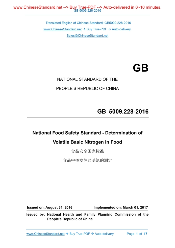 GB 5009.228-2016: National food safety standard - Determination of Volatile Basic Nitrogen in Food Delivery: 9 seconds. True-PDF full-copy in English & invoice will be downloaded + auto-delivered via email. See step-by-step procedure Status: Valid