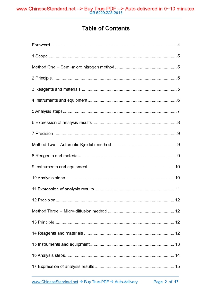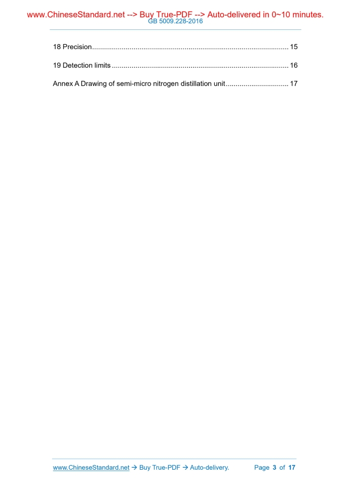 Similar standardsGB 5009.228-2016: National food safety standard - Determination of Volatile Basic Nitrogen in Food---This is an excerpt. Full copy of true-PDF in English version (including equations, symbols, images, flow-chart, tables, and figures etc.), auto-downloaded/delivered in 9 seconds, can be purchased online: https://www.ChineseStandard.net/PDF.aspx/GB5009.228-2016NATIONAL STANDARD OF THE PEOPLE’S REPUBLIC OF CHINA National Food Safety Standard - Determination of Volatile Basic Nitrogen in Food ISSUED ON: AUGUST 31, 2016 IMPLEMENTED ON: MARCH 01, 2017 Issued by: National Health and Family Planning Commission of the People's Republic of China Table of ContentsForeword ... 4 1 Scope ... 5 Method One -- Semi-micro nitrogen method ... 5 2 Principle ... 5 3 Reagents and materials ... 5 4 Instruments and equipment ... 6 5 Analysis steps ... 7 6 Expression of analysis results ... 8 7 Precision ... 9 Method Two -- Automatic Kjeldahl method ... 9 8 Reagents and materials ... 9 9 Instruments and equipment ... 10 10 Analysis steps ... 10 11 Expression of analysis results ... 11 12 Precision ... 12 Method Three -- Micro-diffusion method ... 12 13 Principle ... 12 14 Reagents and materials ... 12 15 Instruments and equipment ... 13 16 Analysis steps ... 14 17 Expression of analysis results ... 15 18 Precision ... 15 19 Detection limits ... 16 Annex A Drawing of semi-micro nitrogen distillation unit ... 17 National Food Safety Standard - Determination of Volatile Basic Nitrogen in Food1 ScopeThis Standard specifies determination methods for volatile basic nitrogen in food. This Standard is applicable to determination for volatile basic nitrogen in food that meats are main raw materials, fresh (frozen) animal meats, meat products and processed meat products, animal aquatic products and seafood as well as their conditioning products, pickled egg products such as preserved egg (century egg) and salted egg. Method One -- Semi-micro nitrogen method2 PrincipleVolatile basic nitrogen refers to that animal food, due to action of enzymes and bacteria, during corruption process, makes protein decompose so as to generate basic nitrogenous substances such as ammonia and amines. Volatile basic nitrogen is volatile. It is distilled in alkaline solution. Use boric acid solution to absorb. Use standard acid solution to titrate and calculate content of volatile basic nitrogen.3 Reagents and materialsUnless otherwise stated, reagents used in this method are analytically-pure and water is grade-three water specified in GB/T 6682. 3.1 Reagents 3.1.1 Magnesium oxide (MgO). 3.1.2 Boric acid (H3BO3). 3.1.3 Trichloroacetic acid (C2HCl3O2). 3.1.4 Hydrochloric acid (HCl) or sulfuric acid (H2SO4). 4.3 Stopper conical flask: 300 mL. 4.4 Semi-micro nitrogen determination device: as shown in Figure A.1. 4.5 Pipettes: 10.0 mL, 25.0 mL, 50.0 mL. 4.6 Microburette: 10 mL, minimum division is 0.01 mL.5 Analysis steps5.1 Semi-micro nitrogen determination device According to Figure A.1, install semi-micro nitrogen determination device. Before using, clean and check sealing of device. 5.2 Sample processing For fresh (frozen) meat: remove skin, fat, bones, tendons; take lean portion. For fresh (frozen) seafood and aquatic products: remove shell, skin, head, internal organs, bone spurs; take edible portion; grind and mix well. For finished products, directly grind and mix well. Minced meat, meat powder, dried meat floss, fish meal, dried fish floss, liquid sample can be used directly. For pickled eggs such as preserved egg (century egg) and salted egg, remove eggshell, remove egg membrane; according to a ratio of egg: water = 2:1, add water; use mixer to grind and mix well into homogenate. For fresh (frozen) sample, weigh 20 g of sample. For dried products such as meat powder, dried meat floss, fish meal, dried fish floss, weigh 10 g of sample, to the nearest of 0.001 g. For liquid sample, pipette 10.0 mL or 25.0 mL; place in stopper conical flask; accurately add 100.0 mL of water; shake from time to time; sample is evenly dispersed in sample solution; after 30 min of immersion, filter. For preserved egg sample, salted egg sample, weigh 15 g of egg homogenate (when calculating content, multiply egg homogenate mass by 2/3 and it shall be sample mass), to the nearest of 0.001 g; place in stopper conical flask; accurately add 100.0 mL of trichloroacetic acid solution; shake vigorously for 1 min; place for 15 min; after protein is precipitated, filter. Filtrate shall be used in time. When filtrate cannot be used in time, store in a refrigerator at 0°C~4°C for use. For special sample that is rich in protein gelatin, that is sticky, that is not easy to filter, it may use trichloroacetic acid solution to replace water for experiment. For sample that there are many foams during distillation process, it may add 1~2 drops of de- foaming silicone oil. 5.3 Determination Add 10 mL of boric acid solution, 5 drops of mixed indicators into receiving bottle. Insert the lower end of condenser tube into liquid surface. Accurately pipette 10.0 mL of filtrate. Inject into reaction chamber from small glass. Use 10 V0 - total volume of sample solution, in milliliters (mL); V0 = 100 in this Method; 100 - conversion factor that is used to convert calculation results to milligrams per hundred grams (mg/100g) or milligrams per hundred liters (mg/100mL). The experimental results are expressed as arithmetic mean values of two independent determination results obtained under repetitive conditions. The result retains three significant digits.7 PrecisionThe absolute difference between two independent determinations obtained under repeatability conditions shall not exceed 10% of the arithmetic mean. Method Two -- Automatic Kjeldahl method8 Reagents and materialsUnless otherwise stated, reagents used in this method are analytically-pure and water is grade-three water specified in GB/T 6682. 8.1 Reagents 8.1.1 Magnesium oxide (MgO). 8.1.2 Boric acid (H3BO3). 8