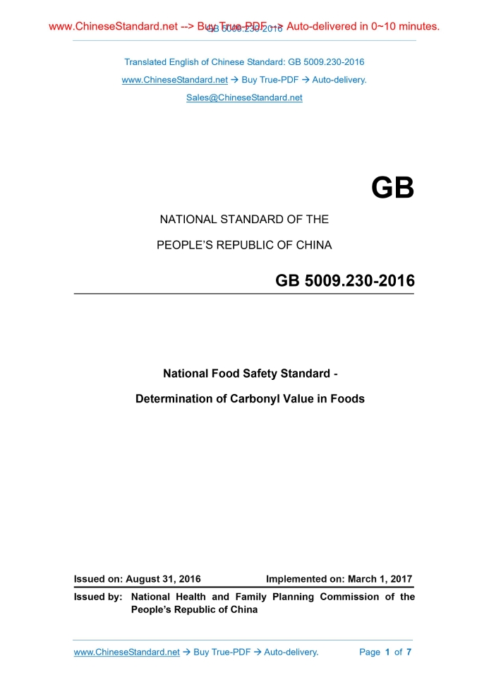 GB 5009.230-2016: National Food Safety Standard -- Determination of carbonyl value Delivery: 9 seconds. True-PDF full-copy in English & invoice will be downloaded + auto-delivered via email. See step-by-step procedure Status: Valid