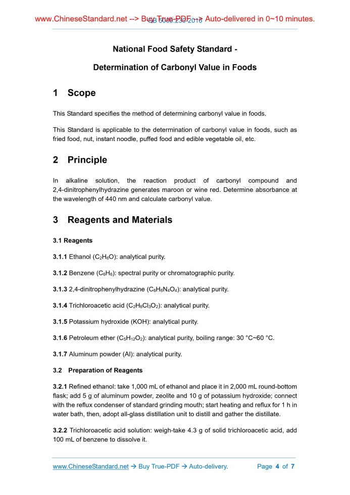 Similar standardsGB 5009.230-2016: National Food Safety Standard -- Determination of carbonyl value---This is an excerpt. Full copy of true-PDF in English version (including equations, symbols, images, flow-chart, tables, and figures etc.), auto-downloaded/delivered in 9 seconds, can be purchased online: https://www.ChineseStandard.net/PDF.aspx/GB5009.230-2016GB NATIONAL STANDARD OF THE PEOPLE’S REPUBLIC OF CHINA National Food Safety Standard - Determination of Carbonyl Value in Foods Issued on: AUGUST 31, 2016 Implemented on: MARCH 1, 2017 Issued by. National Health and Family Planning Commission of the People’s Republic of China Table of ContentsForeword ... 3 1 Scope ... 4 2 Principle ... 4 3 Reagents and Materials ... 4 4 Instruments and Equipment ... 5 5 Analytical Procedures ... 5 6 Expression of Analysis Results ... 6 7 Precision ... 7 National Food Safety Standard - Determination of Carbonyl Value in Foods1 ScopeThis Standard specifies the method of determining carbonyl value in foods. This Standard is applicable to the determination of carbonyl value in foods, such as fried food, nut, instant noodle, puffed food and edible vegetable oil, etc.2 PrincipleIn alkaline solution, the reaction product of carbonyl compound and 2,4-dinitrophenylhydrazine generates maroon or wine red. Determine absorbance at the wavelength of 440 nm and calculate carbonyl value.3 Reagents and Materials3.1 Reagents 3.1.1 Ethanol (C2H6O). analytical purity. 3.1.2 Benzene (C6H6). spectral purity or chromatographic purity. 3.1.3 2,4-dinitrophenylhydrazine (C6H6N4O4). analytical purity. 3.1.4 Trichloroacetic acid (C2H6Cl3O2). analytical purity. 3.1.5 Potassium hydroxide (KOH). analytical purity. 3.1.6 Petroleum ether (C5H12O2). analytical purity, boiling range. 30 °C~60 °C. 3.1.7 Aluminum powder (Al). analytical purity. 3.2 Preparation of Reagents 3.2.1 Refined ethanol. take 1,000 mL of ethanol and place it in 2,000 mL round-bottom flask; add 5 g of aluminum powder, zeolite and 10 g of potassium hydroxide; connect with the reflux condenser of standard grinding mouth; start heating and reflux for 1 h in water bath, then, adopt all-glass distillation unit to distill and gather the distillate. 3.2.2 Trichloroacetic acid solution. weigh-take 4.3 g of solid trichloroacetic acid, add 100 mL of benzene to dissolve it. evaporator under the room temperature; decompress and recover the reagent; use air-blowing drying oven to volatilize petroleum ether for 1 h under 50 °C, then, obtain grease for later determination. Store it in the refrigerator under 4 °C before usage. 5.2.3 Samples with low content of grease, such as bread and biscuit. weigh-take 250 g~300 g of mixed sample and place it in 500 mL wide-mouth bottle with a lid; add an appropriate amount of petroleum ether to soak the sample and place it for 14 h~18 h. Take quick filter paper to filter it; start rotary evaporation for 15 min with a rotary evaporator under the room temperature; decompress and recover the reagent; use air-blowing drying oven to volatilize petroleum ether for 1 h under 50 °C, then, obtain grease for later determination. Store it in the refrigerator under 4 °C before usage. 5.2.4 Samples with high content of water. add an appropriate amount of anhydrous sodium sulfate to make the sample granular; easily agglomerated sample. add 4 times~6 times of sea sand, mix it up, then, extract grease. 5.3 Determination Weigh-take 0.025 g~0.5 g (accurate to 0.1 mg) of grease sample. weigh-take 0.1 g of grease sample with carbonyl value < 30 meq/kg; weigh-take 0.05 g of grease sample with carbonyl value 30 meq/kg~60 meq/kg; weigh-take 0.025 g of grease sample with carbonyl value >60 meq/kg; place it in 25 mL tube with a plug, then, add 5 mL of benzene to dissolve the grease sample; add 3 mL of trichloroacetic acid solution and 5 mL of 2,4-dinitrophenylhydrazine solution; meticulously shake it and mix it up. Heat it up for 30 min in water bath at 60 °C; after reaction, take it out and use running water to cool it down to the room temperature. Slowly add 10 mL of potassium hydroxide-ethanol solution along the tube wall to turn it into two-liquid layer. Start vortex oscillation and mix it up, then, place it evenly for 10 min. Take 1 cm colorimetric cup and adjust the zero point with reagent blank; measure absorbance at the wavelength of 440 nm.6 Expression of Analysis ResultsCarbonyl value in the sample shall be calculated in accordance with Formula (1). Where. X - Carbonyl value (calculated by grease) of the sample, expressed in (meq/kg); A - The absorbance of the sample during determination; ......Source: Above contents are excerpted from the full-copy PDF -- translated/reviewed by: www.ChineseStandard.net / Wayne Zheng et al. Tips & Frequently Asked Questions:Question 1: How long will the true-PDF of English version of GB 5009.230-2016 be delivered?Answer: The full copy PDF of English version of GB 5009.230-2016 can be downloaded in 9 seconds, and it will also be emailed to you in 9 seconds (double mechanisms to ensure the delivery reliably), with PDF-invoice.Question 2: Can I share the purchased PDF of GB 5009.230-2016_English with my colleagues?Answer: Yes. The purchased PDF of GB 5009.230-2016_English will be deemed to be sold to your employer/organization who actually paid for it, including your colleagues and your employer's intranet.Question 3: Does the price include tax/VAT?Answer: Yes. Our tax invoice, downloaded/delivered in 9 seconds, includes all tax/VAT and complies with 100+ countries' tax regulations (tax exempted in 100+ countries) -- See Avoidance of Double Taxation Agreements (DTAs): List of DTAs signed between Singapore and 100+ countriesQuestion 4: Do you accept my currency other than USD?Answer: Yes. www.ChineseStandard.us -- GB 5009.230-2016 -- Click this link and select your country/currency to pay, the exact amount in your currency will be printed on the invoice. Full PDF will also be downloaded/emailed in 9 seconds.How to 