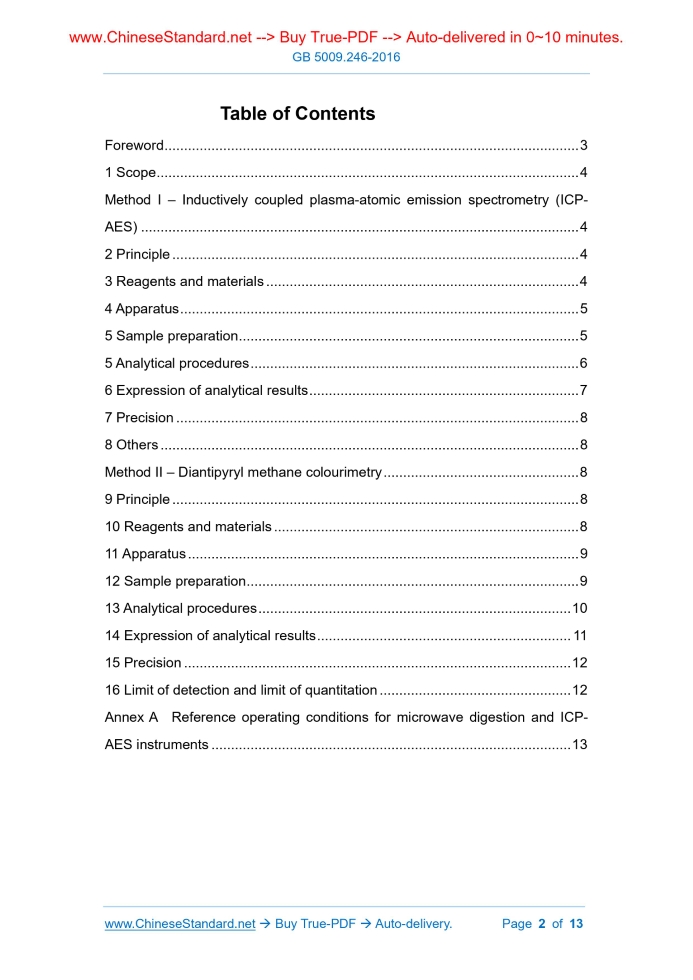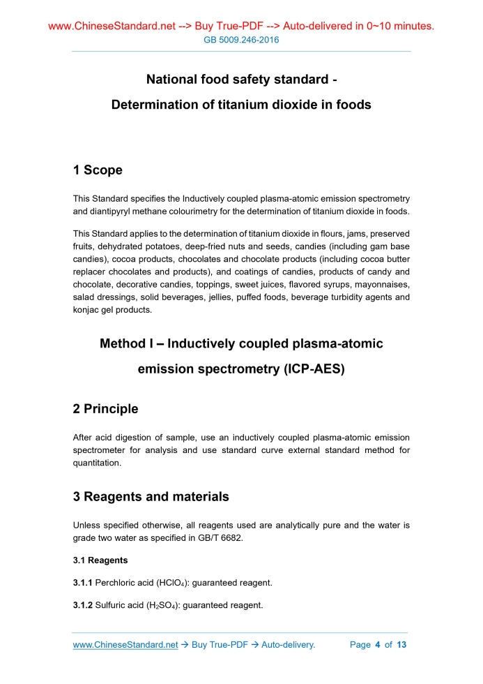 Similar standardsGB 5009.246-2016: National food safety standard - Determination of titanium dioxide in foods---This is an excerpt. Full copy of true-PDF in English version (including equations, symbols, images, flow-chart, tables, and figures etc.), auto-downloaded/delivered in 9 seconds, can be purchased online: https://www.ChineseStandard.net/PDF.aspx/GB5009.246-2016GB NATIONAL STANDARD OF THE PEOPLE’S REPUBLIC OF CHINA National food safety standard - Determination of titanium dioxide in foods Issued on: AUGUST 31, 2016 Implemented on: MARCH 1, 2017 Issued by. National Health and Family Planning Commission of the People’s Republic of China Table of ContentsForeword ... 3 1 Scope ... 4 Method I – Inductively coupled plasma-atomic emission spectrometry (ICP- AES) ... 4 2 Principle ... 4 3 Reagents and materials ... 4 4 Apparatus ... 5 5 Sample preparation ... 5 5 Analytical procedures ... 6 6 Expression of analytical results ... 7 7 Precision ... 8 8 Others ... 8 Method II – Diantipyryl methane colourimetry ... 8 9 Principle ... 8 10 Reagents and materials ... 8 11 Apparatus ... 9 12 Sample preparation ... 9 13 Analytical procedures ... 10 14 Expression of analytical results ... 11 15 Precision ... 12 16 Limit of detection and limit of quantitation ... 12 Annex A Reference operating conditions for microwave digestion and ICP- AES instruments ... 13 National food safety standard - Determination of titanium dioxide in foods1 ScopeThis Standard specifies the Inductively coupled plasma-atomic emission spectrometry and diantipyryl methane colourimetry for the determination of titanium dioxide in foods. This Standard applies to the determination of titanium dioxide in flours, jams, preserved fruits, dehydrated potatoes, deep-fried nuts and seeds, candies (including gam base candies), cocoa products, chocolates and chocolate products (including cocoa butter replacer chocolates and products), and coatings of candies, products of candy and chocolate, decorative candies, toppings, sweet juices, flavored syrups, mayonnaises, salad dressings, solid beverages, jellies, puffed foods, beverage turbidity agents and konjac gel products. Method I – Inductively coupled plasma-atomic emission spectrometry (ICP-AES)2 PrincipleAfter acid digestion of sample, use an inductively coupled plasma-atomic emission spectrometer for analysis and use standard curve external standard method for quantitation.3 Reagents and materialsUnless specified otherwise, all reagents used are analytically pure and the water is grade two water as specified in GB/T 6682. 3.1 Reagents 3.1.1 Perchloric acid (HClO4). guaranteed reagent. 3.1.2 Sulfuric acid (H2SO4). guaranteed reagent. 3.1.3 Nitric acid (HNO3). guaranteed reagent. 3.1.4 Ammonium sulfate [(NH4)2SO4]. 3.2 Preparation of reagents 3.2.1 Sulfuric acid solution (5 + 95). measure 50 mL of sulfuric acid; add slowly into 950 mL of water; mix up. 3.2.2 Mixed acid [perchloric acid + nitric acid (1 + 9)]. measure 100 mL of perchloric acid; add slowly into 900 mL of nitric acid; mix up. 3.3 Standard substance Titanium dioxide (TiO2). primary reagent or spectrographically pure. 3.4 Preparation of standard solutions 3.4.1 Titanium standard stock solution (1,000 μg/mL). weigh 0.167 g of titanium dioxide; add 5 g of ammonium sulfate; add 10 mL of sulfuric acid; heat to dissolve; allow to cool; transfer to a volumetric flask of 100 mL; dilute to scale; mix up. Or use a standard solution which has passes the national certification and awarded the certificate of a standard substance. 3.4.2 Titanium standard using solution (10.0 μg/mL). absorb 1.00 mL of titanium standard stock solution to pour into a volumetric flask of 100 mL; use sulfuric acid solution (5 + 95) to dilute to scale. 3.4.3 Titanium standard serial working solutions. absorb 0.000 mL, 0.500 mL, 2.00 mL, 5.00 mL, 10.0 mL and 20.0 mL of titanium standard using solution; pour respectively into a volumetric flask of 100 mL; use sulfuric acid solution (5 + 95) to dilute to scale; prepare the titanium serial standard working solutions of 0.000 μg/mL, 0.050 μg/mL, 0.200 μg/mL, 0.500 μg/mL, 1.00 μg/mL and 2.00 μg/mL.4 Apparatus4.1 Inductively coupled plasma-atomic emission spectrometer. 4.2 Microwave digestion system. 4.3 Analytical balance. sensitivity 0.1 mg.5 Sample preparation5.1 Solid and semisolid sample 10.2.1 Mixed solution [perchloric acid + nitric acid (1 + 9)]. measure 100 mL of perchloric acid; slowly add into 900 mL of nitric acid; mix up. 10.2.2 Hydrochloric acid solution (1 + 1). measure 100 mL of hydrochloric acid; slowly add into 100 mL of water; mix up. 10.2.3 Hydrochloric acid solution (1 + 23). measure 10 mL of hydrochloric acid; slowly add into 230 mL of water; mix up. 10.2.4 Sulfuric acid solution (2 + 98). measure 20 mL of sulfuric acid; slowly add into 980 mL of water; mix up. 10.2.5 Ascorbic acid solution (2%). weigh 2 g of ascorbic acid; use water to dissolve before diluting to 100 mL; prepare immediately prior to use. 10.2.6 Diantipyryl methane solution (5%). weigh 5 g of diantipyryl methane; use hydrochloric acid solution (1 + 23) (10.2.3) to dissolve and dilute to 100 mL. 10.3 Standard substance Titanium dioxide (TiO2). primary reagent or spectrographically pure. 10.4 Preparation of standard solutions 10.4.1 Titanium standard stock solution (1,000 μg/mL). weigh 0.167 g of titanium dioxide; add 5 g of ammonium sulfate; add 10 mL of sulfuric acid; heat to dissolve; allow to cool; transfer to a volumetric flask of 100 mL; dilute to scale; mix up. Or use a standard solution which has passes the national certification and awarded the certificate of a standard substance. 10.4.2 Titanium standard using solution (10 μg/mL). absorb 1.00 mL of titanium standard stock solution (10.4.1) to pour into a volumetric flask of 100 mL; use sulfuric acid (2 + 98) to dilute to scale.11 Apparatus11.1 Ultraviolet spectrophotometer. 11.2 Microwave digestion system. 11.3 Analytical balance. sensitivity 1 mg.12 