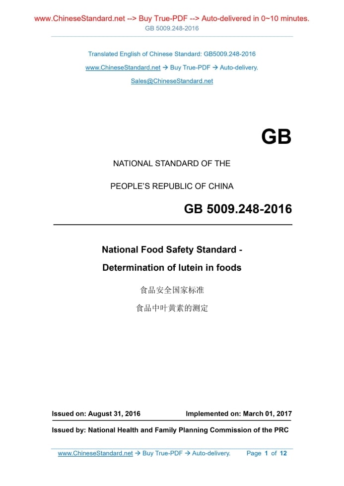 GB 5009.248-2016: National food safety standard - Determination of lutein in foods Delivery: 9 seconds. True-PDF full-copy in English & invoice will be downloaded + auto-delivered via email. See step-by-step procedure Status: Valid