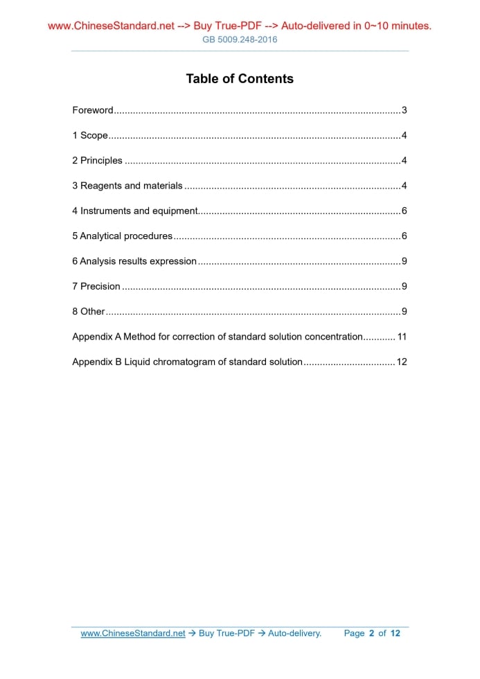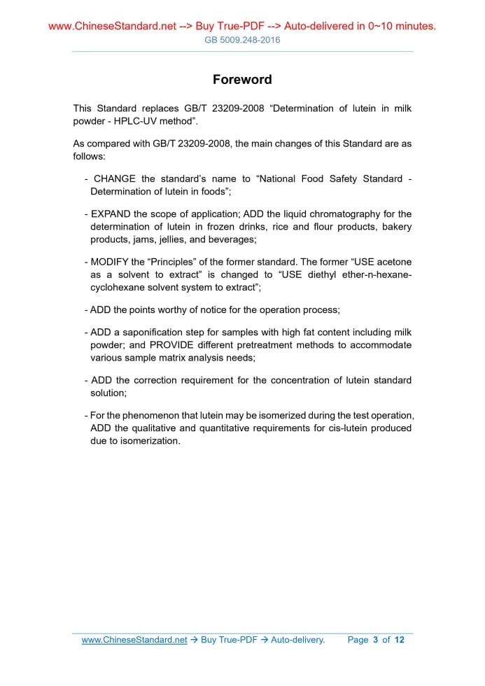Similar standardsGB 5009.248-2016: National food safety standard - Determination of lutein in foods---This is an excerpt. Full copy of true-PDF in English version (including equations, symbols, images, flow-chart, tables, and figures etc.), auto-downloaded/delivered in 9 seconds, can be purchased online: https://www.ChineseStandard.net/PDF.aspx/GB5009.248-2016GB NATIONAL STANDARD OF THE PEOPLE’S REPUBLIC OF CHINA National Food Safety Standard - Determination of lutein in foods Issued on. AUGUST 31, 2016 Implemented on. MARCH 01, 2017 Issued by. National Health and Family Planning Commission of the PRC Table of ContentsForeword... 3 1 Scope... 4 2 Principles... 4 3 Reagents and materials... 4 4 Instruments and equipment... 6 5 Analytical procedures... 6 6 Analysis results expression... 9 7 Precision... 9 8 Other... 9 Appendix A Method for correction of standard solution concentration... 11 Appendix B Liquid chromatogram of standard solution... 12ForewordThis Standard replaces GB/T 23209-2008 “Determination of lutein in milk powder - HPLC-UV method”. As compared with GB/T 23209-2008, the main changes of this Standard are as follows. - CHANGE the standard’s name to “National Food Safety Standard - Determination of lutein in foods”; - EXPAND the scope of application; ADD the liquid chromatography for the determination of lutein in frozen drinks, rice and flour products, bakery products, jams, jellies, and beverages; - MODIFY the “Principles” of the former standard. The former “USE acetone as a solvent to extract” is changed to “USE diethyl ether-n-hexane- cyclohexane solvent system to extract”; - ADD the points worthy of notice for the operation process; - ADD a saponification step for samples with high fat content including milk powder; and PROVIDE different pretreatment methods to accommodate various sample matrix analysis needs; - ADD the correction requirement for the concentration of lutein standard solution; - For the phenomenon that lutein may be isomerized during the test operation, ADD the qualitative and quantitative requirements for cis-lutein produced due to isomerization. National Food Safety Standard - Determination of lutein in foods1 ScopeThis Standard specifies the liquid chromatography for the determination of lutein in foods. This Standard applies to liquid chromatography determination of lutein in infant formula, dairy products, frozen drinks, rice and flour products, bakery products, jams, jellies, and beverages.2 PrinciplesAfter foods with high fat content (fat content of not less than 3% on a dry basis) are saponified with potassium hydroxide solution at room temperature to free lutein, then USE diethyl ether-n-hexane-cyclohexane (40+40+20, volume ratio) to extract; USE liquid chromatography to separate; USE UV-detector or diode array detector to detect; and USE external standard method for quantification. Lutein in the samples of the other foods is directly extracted by diethyl ether-n- hexane-cyclohexane (40+40+20, volume ratio). After the extract is purified by a neutral alumina solid phase extraction cartridge, USE liquid chromatography to separate; USE UV-detector or diode array detector to detect; and USE external standard method for quantification.3 Reagents and materialsUnless otherwise stated, the reagents used in this method are of analytically pure; the water is Grade I water specified in GB/T 6682. 3.1 Reagents 3.1.1 Cyclohexane (C6H12). chromatographically pure. 3.1.2 Diethyl ether [(C2H5)2O]. chromatographically pure. 3.1.7 Potassium hydroxide (KOH). 3.1.8 Iodine (I2). 3.2 Preparation of reagents 3.2.1 10% potassium hydroxide solution. WEIGH 10 g of potassium hydroxide (3.1.7); ADD water to dissolve and dilute to 100 mL. 3.2.2 20% potassium hydroxide solution. WEIGH 20 g of potassium hydroxide (3.1.7); ADD water to dissolve and dilute to 100 mL. 3.2.3 Extraction solvent. WEIGH 1 g of BHT (3.1.6); USE 200 mL of cyclohexane (3.1.1) to dissolve; ADD 400 mL of diethyl ether (3.1.2) and 400 mL of n-hexane (3.1.3), and MIX well. 3.3 Standard Lutein (CAS number. 127-40-2), with a purity of not less than 98.0%. 3.4 Preparation of standard solutions 3.4.1 Standard stock solution (50 μg/mL). Accurately WEIGH 5 mg (accurate to 0.01 mg) of lutein (3.1.3); USE 0.1% BHT ethanol solution (3.2.4) to dissolve and dilute to 100 mL. This standard stock solution can be stored for six months by filling nitrogen and avoiding light in a refrigerator of -20 °C or below. 3.4.2 Standard working solutions. accurately PIPETTE 0.050 mL, 0.100 mL, 0.200 mL, 0.400 mL, 1.00 mL of standard stock solution of lutein (3.4.1) into 5 25 mL brown volumetric flasks; USE 0.1% BHT ethanol solution (3.2.4) to dilute to volume; and OBTAIN a series of standard working solutions having concentrations of 0.100 μg/mL, 0.200 μg/mL, 0.400 μg/mL, 0.800 μg/mL, and 2.00 μg/mL.4 Instruments and equipment4.1 Liquid chromatograph, with diode array detector or UV-detector. 4.2 UV-visible spectrophotometer. 4.3 Analytical balance. The sensitivity is 0.01 mg and 0.01 g. 4.7 Decompression concentrator. 4.8 Solid phase extraction plant. 4.9 Centrifuge. The speed is not less than 4500 r/min.5 Analytical proceduresNote. Because lutein is sensitive to light, unless otherwise stated, all test operations shall be performed in a yellow or red light source environment with no UV light below 500 nm. 5.1 Sample preparation A certain number of samples are pulverized, homogenized, and divided as required, and stored in a sample bottle. The prepared sample shall be filled with nitrogen and sealed; and stored in a refrigerator at -20 °C or below. 5.2 Extraction 5.2.1 Foods with high fat content (such as infant formula, milk powder, ice cream, bakery nuts, etc.) 5.3 Instrument reference conditions 5.3.1 Chromatographic column. C30 column, 5 μm, 250 mm×4.6 mm (inner diameter) or equivalent; 5.3.2 Column temperature. 30 °C; 5.3.3 Mobile phase. methanol/water (88+12, volume ratio, containing 0.1% 