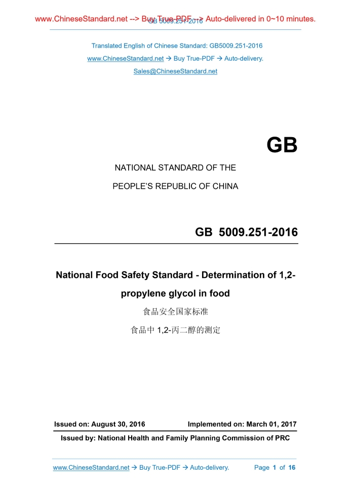 GB 5009.251-2016: National food safety standard - Determination of 1,2-propylene glycol in food Delivery: 9 seconds. True-PDF full-copy in English & invoice will be downloaded + auto-delivered via email. See step-by-step procedure Status: Valid