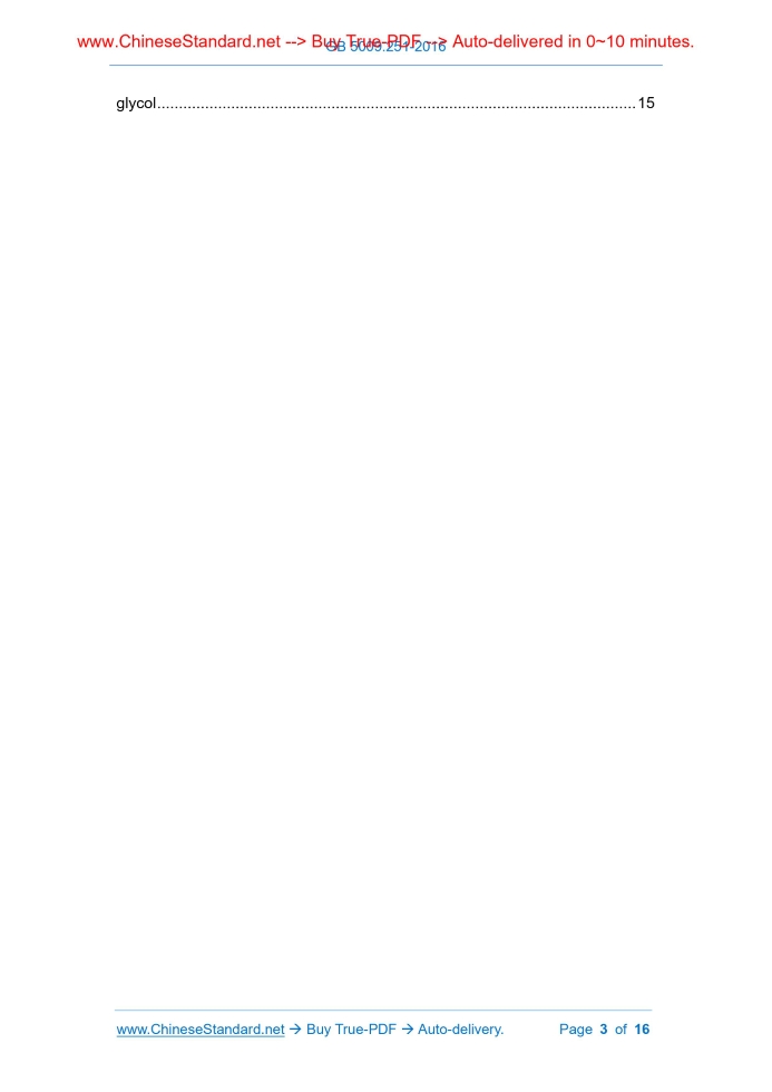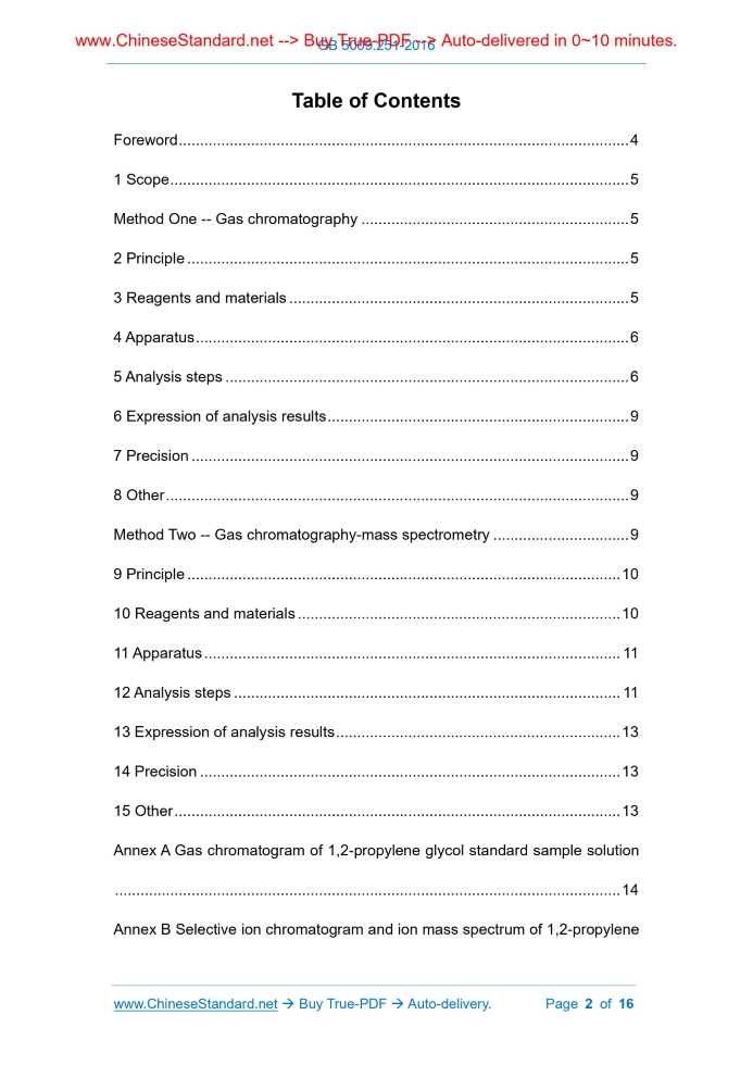 Similar standardsGB 5009.251-2016: National food safety standard - Determination of 1,2-propylene glycol in food---This is an excerpt. Full copy of true-PDF in English version (including equations, symbols, images, flow-chart, tables, and figures etc.), auto-downloaded/delivered in 9 seconds, can be purchased online: https://www.ChineseStandard.net/PDF.aspx/GB5009.251-2016GB NATIONAL STANDARD OF THE PEOPLE’S REPUBLIC OF CHINA National Food Safety Standard - Determination of 1,2- propylene glycol in food Issued on. AUGUST 30, 2016 Implemented on. MARCH 01, 2017 Issued by. National Health and Family Planning Commission of PRC Table of ContentsForeword... 4 1 Scope... 5 Method One -- Gas chromatography... 5 2 Principle... 5 3 Reagents and materials... 5 4 Apparatus... 6 5 Analysis steps... 6 6 Expression of analysis results... 9 7 Precision... 9 8 Other... 9 Method Two -- Gas chromatography-mass spectrometry... 9 9 Principle... 10 10 Reagents and materials... 10 11 Apparatus... 11 12 Analysis steps... 11 13 Expression of analysis results... 13 14 Precision... 13 15 Other... 13 Annex A Gas chromatogram of 1,2-propylene glycol standard sample solution ... 14 Annex B Selective ion chromatogram and ion mass spectrum of 1,2-propylene glycol... 15ForewordThis Standard replaces GB/T 23813-2009 “Determination of 1,2-propanediol in foods”, NY/T 1662-2008 “Determination of 1,2-propylene glycol in milk and dairy products - Gas chromatography method”. Compared with GB/T 23813-2009, the main deviations in this Standard are as follows. - modified the standard name as “National Food Safety Standard - Determination of 1, 2-propylene glycol in food”; - added the pretreatment method for milk tablets; - modified the pretreatment methods for milk powder, butter, cream, liquid milk; - added the limit of quantitation of the method. National Food Safety Standard - Determination of 1,2- propylene glycol in food1 ScopeThis Standard specifies the methods that use gas chromatography and gas chromatography-mass spectrometry to determine 1,2-propylene glycol in food. Method One of this Standard is applicable to the determination of 1,2-propylene glycol in pastries, puffed food, cream, cheese, soy products, milk tablets, wet noodle products, frozen drinks, liquid milk, vegetable protein drinks, milk powder, butter, cream. Method Two is applicable to the determination of 1,2- propylene glycol in pastries, puffed food, cheese, soy products, milk tablets, wet noodle products. Method One -- Gas chromatography2 Principle1,2-propylene glycol in the specimen is extracted by absolute ethanol. After the extract is filtered, use gas chromatography to determine. Characterize by retention time. Quantify by external standard method.3 Reagents and materialsUnless otherwise stated, the reagents used in this method are analytically pure, the water is grade two water specified in GB/T 6682. 3.1 Reagents 3.1.1 Anhydrous ethanol (C2H5OH). 3.2 Preparation of reagent 3.2.1 N-hexane saturated acetonitrile solution. Take the same volume of acetonitrile and n-hexane. Place in a separatory funnel. Oscillate. Perform static layering. Take the lower layer solution. 3.2.2 Acetonitrile saturated n-hexane solution. Take the same volume of acetonitrile and n-hexane. Place in a separatory funnel. Oscillate. Perform static layering. Take the upper layer solution. 3.4 Preparation of standard solution 3.4.1 1,2-propylene glycol standard stock solution (10.0 mg/mL). Accurately weigh 1 g of 1,2-propylene glycol standard sample (to the nearest of 0.0001g). Use absolute ethanol to dissolve and transfer to a 100mL volumetric flask. Set volume to the scale. The mass concentration of 1,2-propylene glycol of this solution is 10.0 mg/mL. Store in a refrigerator at 4°C. It shall be valid for 3 months.4 Apparatus4.1 Gas chromatograph (GC). equipped with hydrogen flame ionization detector (FID). 4.4 Vortex mixer. 4.5 Cyclotron oscillator. 4.6 Centrifuge. rotating speed≥8000 r/min.5 Analysis steps5.1 Preparation of specimen 5.1.1 Pastries, puffed food, cheese, soy products, milk tablets The specimen is crushed by the mincer. Accurately weigh 5 g of well-mixed specimen (to the nearest of 0.01g) to a 100mL stoppered conical flask. Add into 50.0 mL of absolute ethanol. Vortex and mix for 2min, then perform oscillation extraction for 40min. After standing for 1h, use 0.45μm organic phase filter membrane to filter. The filtrate obtained is put into gas chromatograph for analysis. 5.1.3 Frozen drinks A solid specimen is placed in a dry beaker to unfreeze. After melting, use a glass rod to smash and stir evenly. The liquid specimen is put at room temperature and shaken evenly. 5.1.4 Liquid milk, vegetable protein drinks Accurately weigh 10 g of well-mixed specimen (to the nearest of 0.01g) into a 50mL stoppered colorimetric tube. Use absolute ethanol to set volume. Vortex and mix for 2min. After standing for 1h (centrifuge at 8000 r/min for 5min if necessary), use 0.45μm organic phase filter membrane to filter. The filtrate obtained is put into gas chromatograph for analysis. 5.1.5 Milk powder Accurately weigh 2 g of well-mixed specimen (to the nearest of 0.01g) into a 50mL stoppered colorimetric tube. Use 8 mL of 40°C water to dissolve and well mix. Use absolute ethanol to set volume. Vortex and mix for 2min. After standing for 1h (centrifuge at 8000 r/min for 5min if necessary), use 0.45μm organic phase filter membrane to filter. The filtrate obtained is put into gas chromatograph for analysis. 5.1.6 Butter, cream Accurately weigh 2 g of well-mixed specimen (to the nearest of 0.01g) into a 50mL stoppered colorimetric tube. Use 6 mL of hexane to dissolve and well mix. Add into 20 mL of n-hexane saturated acetonitrile solution. 5.2 Instrument reference conditions 5.2.1 Chromatographic column. bonded/crosslinked polyethylene glycol stationary phase quartz capillary column, 60m × 0.25mm, 0.25μm, or equivalent column. 5.2.2 Carrier gas. high purity nitro