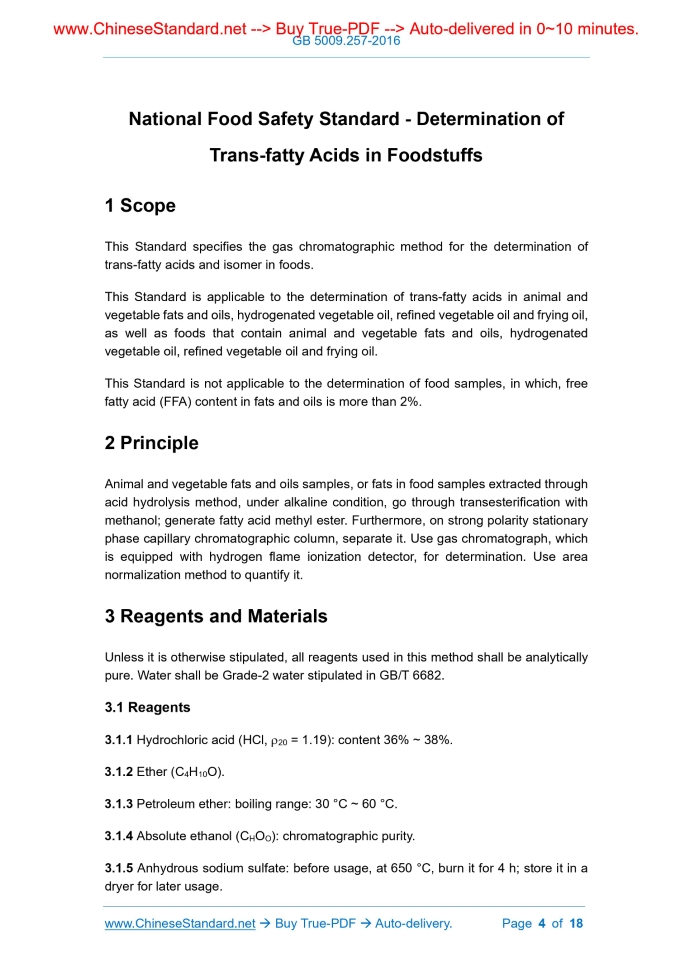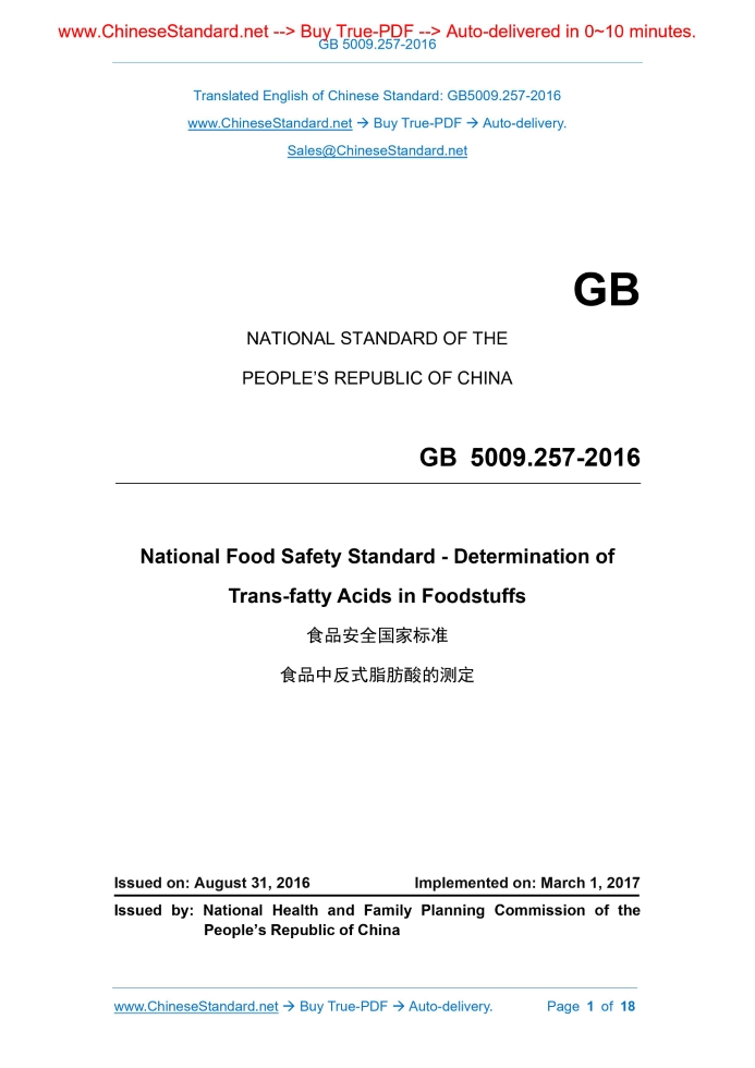GB 5009.257-2016: National food safety standard - Determination of Trans-fatty Acids in Foodstuffs Delivery: 9 seconds. True-PDF full-copy in English & invoice will be downloaded + auto-delivered via email. See step-by-step procedure Status: Valid