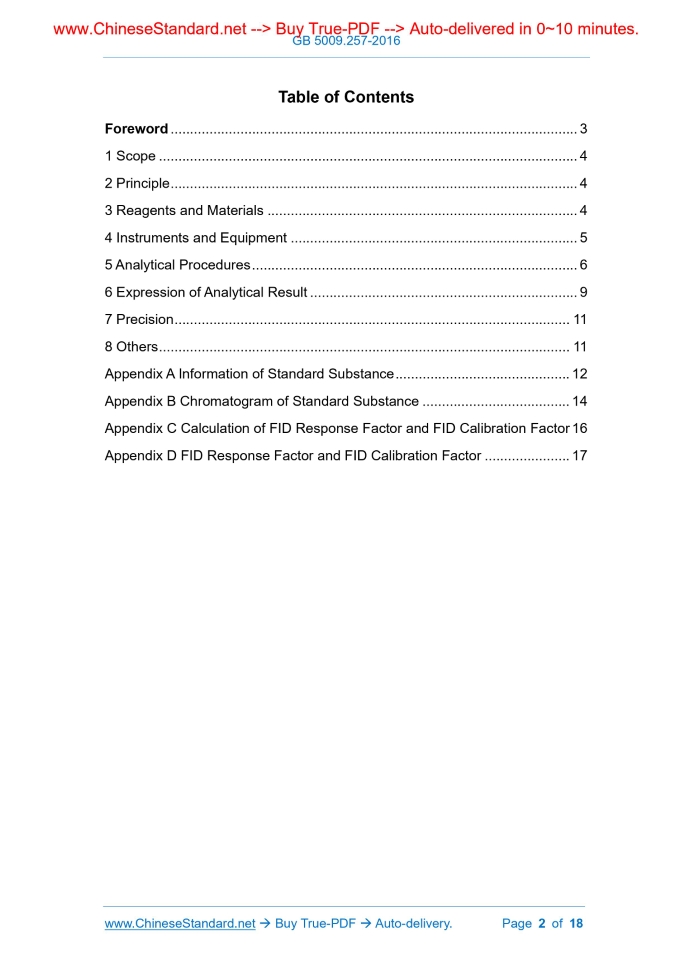 Similar standardsGB 5009.257-2016: National food safety standard - Determination of Trans-fatty Acids in Foodstuffs---This is an excerpt. Full copy of true-PDF in English version (including equations, symbols, images, flow-chart, tables, and figures etc.), auto-downloaded/delivered in 9 seconds, can be purchased online: https://www.ChineseStandard.net/PDF.aspx/GB5009.257-2016NATIONAL STANDARD OF THE PEOPLE’S REPUBLIC OF CHINA National Food Safety Standard - Determination of Trans-fatty Acids in Foodstuffs Issued on. AUGUST 31, 2016 Implemented on. MARCH 1, 2017 Issued by. National Health and Family Planning Commission of the People’s Republic of China Table of ContentsForeword... 3 1 Scope... 4 2 Principle... 4 3 Reagents and Materials... 4 4 Instruments and Equipment... 5 5 Analytical Procedures... 6 6 Expression of Analytical Result... 9 7 Precision... 11 8 Others... 11 Appendix A Information of Standard Substance... 12 Appendix B Chromatogram of Standard Substance... 14 Appendix C Calculation of FID Response Factor and FID Calibration Factor 16 Appendix D FID Response Factor and FID Calibration Factor... 17ForewordThis Standard serves as a replacement of GB/T 22110-2008 Determination of Trans- fatty Acids in Foods - Gas Chromatographic Method; GB/T 22507-2008 Animal and Vegetable Fats and Oils - Determination of the Content of Trans-fatty Acid Isomers of Vegetable Fats and Oils - Gas Chromatographic Method; SN/T 1945-2007 Determination of Trans-fatty Acids in Foods - Capillary Gas Chromatography. In comparison with the standards being replaced by this Standard, there are certain main changes as follows. ---The title of this Standard is modified into “National Food Safety Standard - Determination of Trans-fatty Acids in Foodstuffs”; ---The scope of application is extended to animal fats and oils, and foods containing animal fats and oils; ---The analyte is extended to 15 kinds of fatty acid, for example, C16.1t ~ C22.1t. National Food Safety Standard - Determination of Trans-fatty Acids in Foodstuffs1 ScopeThis Standard specifies the gas chromatographic method for the determination of trans-fatty acids and isomer in foods. This Standard is applicable to the determination of trans-fatty acids in animal and vegetable fats and oils, hydrogenated vegetable oil, refined vegetable oil and frying oil, as well as foods that contain animal and vegetable fats and oils, hydrogenated vegetable oil, refined vegetable oil and frying oil. This Standard is not applicable to the determination of food samples, in which, free fatty acid (FFA) content in fats and oils is more than 2%.2 PrincipleAnimal and vegetable fats and oils samples, or fats in food samples extracted through acid hydrolysis method, under alkaline condition, go through transesterification with methanol; generate fatty acid methyl ester. Furthermore, on strong polarity stationary phase capillary chromatographic column, separate it. Use gas chromatograph, which is equipped with hydrogen flame ionization detector, for determination. Use area normalization method to quantify it.3 Reagents and MaterialsUnless it is otherwise stipulated, all reagents used in this method shall be analytically pure. Water shall be Grade-2 water stipulated in GB/T 6682. 3.1 Reagents 3.2 Preparation of Reagents Potassium hydroxide - methanol solution (2 mol/L). weigh-take 13.2 g of potassium hydroxide; dissolve it in 80 mL of methanol. Cool it down to room temperature. Use methanol to reach a constant volume of 100 mL. 3.3 Standard Substance Fatty acid methyl ester standard substance. please refer to Table A.1 for the type of fatty acid methyl ester standard substance. Purity shall be > 99%. 3.4 Preparation of Standard Solutions 3.4.1 Fatty acid methyl ester standard stock solution. respectively and accurately weigh-take 100 mg (accurate to 0.1 mg) of trans-fatty acid methyl ester standard substances; place them in 25 mL beaker. Respectively use isooctane to dissolve them, then, transfer them into 10 mL volumetric flask. Accurately reach the volume of 10 mL. The concentration of the standard stock solutions is 10 mg/mL.4 Instruments and Equipment4.1 Gas chromatograph. equipped with hydrogen flame ionization detector. 4.2 Constant-temperature water bath kettle. 4.3 Vortex oscillator. 4.7 Round-bottomed flask. 200 mL. Before usage, place it in 100 °C oven to reach a constant weight. 4.8 Rotary evaporator. 4.9 Balance. division value. 0.1 g, 0.1 mg.5 Analytical Procedures5.1 Sample Preparation 5.1.1 Solid sample Take 500 g of representative test sample. Use a grinder to grind and mix it up. Evenly divide it into two parts. Respectively load them into clean containers. Seal them up; 5.1.2 Semi-solid lipid sample Take 500 g of representative sample. Place it in a beaker. At 60 °C ~ 70 °C water bath, melt it. Thoroughly mix it up. After cooling it down, evenly divide it into two parts. Respectively load them into clean containers. Seal them up; 5.2 Analytical Procedure 5.2.1 Animal and vegetable fats and oils Weigh-take 60 mg of fats and oils; place it in a 10 mL test tube with a stopper. Add 2 mL of isooctane to thoroughly dissolve it. Add 0.2 mL of potassium hydroxide-methanol solution. Conduct vortex mixing for 1 min. Place it till the mixed liquid in the test tube becomes pellucid. 5.2.2 Foods containing fats and oils (except from animal and vegetable fats and oils) 5.2.2.1 Determination of fats in foods Solid and semi-solid lipid sample. weigh-take 2.0 g (accurate to 0.01 g; the weighing amount of different foods may be properly adjusted, so as to guarantee that fat mass in foods is not less than 0.125 g) of homogeneous sample. Place it in a 50 mL test tube. Add 8 mL of water to thoroughly mix it up. Then, add 10 mL of hydrochloric acid to evenly mix it up. Liquid sample. weigh-take 10.00 g of homogeneous sample, then, place it in a 50 mL test tube. Add 10 mL of hydrochloric acid to evenly mix it up. Place the above-mentioned test tube into 60 °C ~ 70
