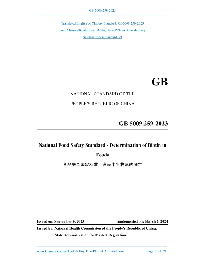 GB 5009.259-2023: National food safety standard - Determination of biotin in foods Delivery: 9 seconds. True-PDF full-copy in English & invoice will be downloaded + auto-delivered via email. See step-by-step procedure Status: Valid GB 5009.259: Historical versions