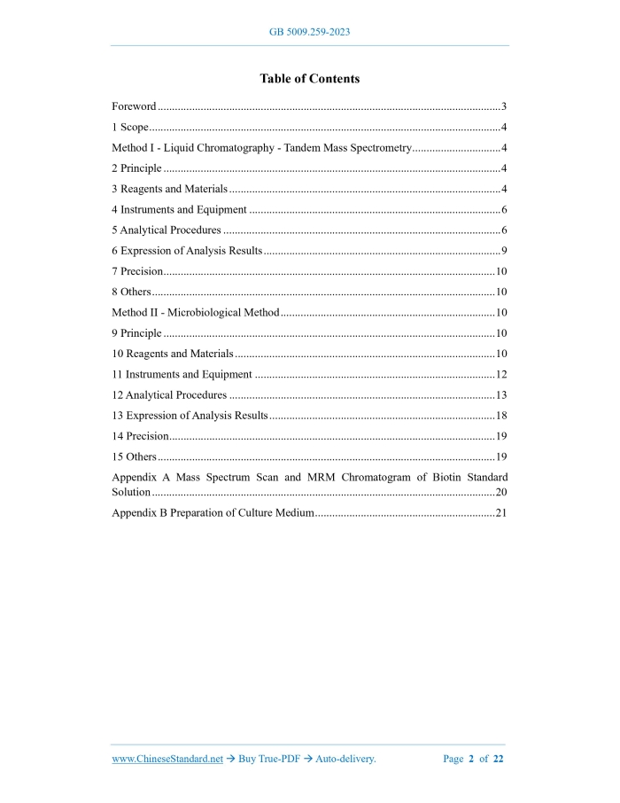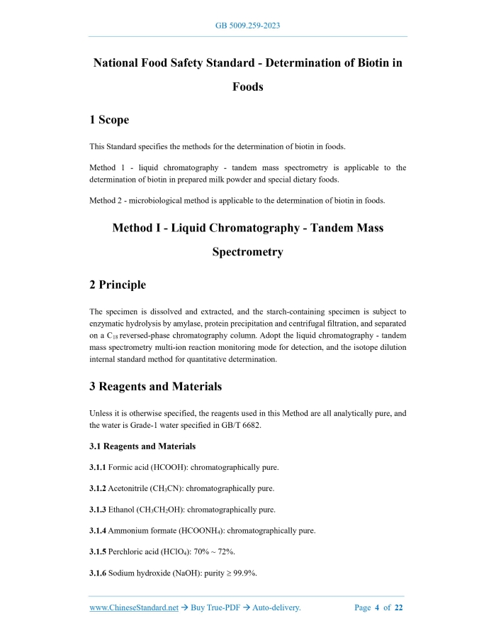 Similar standardsGB 5009.259-2023: National food safety standard - Determination of biotin in foods---This is an excerpt. Full copy of true-PDF in English version (including equations, symbols, images, flow-chart, tables, and figures etc.), auto-downloaded/delivered in 9 seconds, can be purchased online: https://www.ChineseStandard.net/PDF.aspx/GB5009.259-2023GB NATIONAL STANDARD OF THE PEOPLE’S REPUBLIC OF CHINA National Food Safety Standard - Determination of Biotin in Foods Issued on. SEPTEMBER 6, 2023 Implemented on. MARCH 6, 2024 Issued by. National Health Commission of the People’s Republic of China; State Administration for Market Regulation. Table of ContentsForeword... 3 1 Scope... 4 Method I - Liquid Chromatography - Tandem Mass Spectrometry... 4 2 Principle... 4 3 Reagents and Materials... 4 4 Instruments and Equipment... 6 5 Analytical Procedures... 6 6 Expression of Analysis Results... 9 7 Precision... 10 8 Others... 10 Method II - Microbiological Method... 10 9 Principle... 10 10 Reagents and Materials... 10 11 Instruments and Equipment... 12 12 Analytical Procedures... 13 13 Expression of Analysis Results... 18 14 Precision... 19 15 Others... 19 Appendix A Mass Spectrum Scan and MRM Chromatogram of Biotin Standard Solution... 20 Appendix B Preparation of Culture Medium... 21ForewordThis Standard serves as a replacement of GB 5009.259-2016 National Food Safety Standard - Determination of Biotin in Foods. In comparison with GB 5009.259-2016, the main changes are as follows. ---Method 1 “Liquid Chromatography - Tandem Mass Spectrometry” is added, and the “Microbiological Method” is adjusted to Method 2; ---The microplate culture method is added to Method 2 - “Microbiological Method”; ---The scope of application, sample category and pre-treatment method of the Standard are modified; ---The expression of the drawing of standard curve and the preparation of sample extracting solution is modified; ---The detection limit, quantitation limit and linear range are modified. National Food Safety Standard - Determination of Biotin in Foods1 ScopeThis Standard specifies the methods for the determination of biotin in foods. Method 1 - liquid chromatography - tandem mass spectrometry is applicable to the determination of biotin in prepared milk powder and special dietary foods. Method 2 - microbiological method is applicable to the determination of biotin in foods. Method I - Liquid Chromatography - Tandem Mass Spectrometry2 PrincipleThe specimen is dissolved and extracted, and the starch-containing specimen is subject to enzymatic hydrolysis by amylase, protein precipitation and centrifugal filtration, and separated on a C18 reversed-phase chromatography column. Adopt the liquid chromatography - tandem mass spectrometry multi-ion reaction monitoring mode for detection, and the isotope dilution internal standard method for quantitative determination.3 Reagents and MaterialsUnless it is otherwise specified, the reagents used in this Method are all analytically pure, and the water is Grade-1 water specified in GB/T 6682. 3.1 Reagents and Materials 3.1.3 Ethanol (CH3CH2OH). chromatographically pure. 3.1.4 Ammonium formate (HCOONH4). chromatographically pure. 3.1.5 Perchloric acid (HClO4). 70% ~ 72%. 3.1.6 Sodium hydroxide (NaOH). purity 99.9%. 3.1.7 Amylase. Taka-amylase, CAS. 9001-19-8, enzyme activity 100 U/mg. 3.2 Preparation of Reagents 3.3 Reference Material 3.5 Preparation of Isotope Internal Standard Solutions 3.6 Preparation of Standard Series of Working Solutions Respectively and accurately draw-take an appropriate amount of biotin standard working solution into 10 mL volumetric flasks, accurately add 150 L of biotin-D4 isotope internal standard working solution (1 g/mL), use mobile phase A to reach a constant volume to the scale, so that the mass concentration of the standard series of biotin is respectively. 1.0 ng/mL, 2.0 ng/mL, 5.0 ng/mL, 10 ng/mL, 15 ng/mL, 20 ng/mL and 25 ng/mL. The mass concentration of isotope in each series of solution is 15 ng/mL. Prepare them right before use.4 Instruments and Equipment4.1 Liquid chromatograph - tandem mass spectrometer. 4.2 Balance. with a division value of 0.001 g and 0.01 mg, respectively. 4.4 pH meter. with an accuracy of 0.01. 4.5 Ultrasonic oscillator. 4.6 Vortex mixer. 600 r/min ~ 3,200 r/min. 4.8 2 mm aperture test sieve (optional).5 Analytical Procedures5.1 Sample Preparation 5.1.1 Solid samples The sampling size needs to be greater than 0.5 kg. Use a high-speed pulverizer to pulverize non-uniform samples, until all of them pass through a 2 mm aperture test sieve. After evenly mixing, divide the samples to 100 g and store in a wide-mouth bottle. Seal it and reserve it for testing. For uniform samples, directly evenly mix them and reserve them for testing. 5.1.2 Semi-solid samples The sampling size needs to be greater than 0.5 kg. At least 3 packages (from the same batch) need to be collected. After all samples are homogenized and evenly mixed in a container, store any 100 g of them in a wide-mouth bottle. Seal it and reserve it for testing. 5.1.3 Liquid samples The sampling size needs to be greater than 0.5 L. At least 3 packages (from the same batch) need to be collected. After all samples are evenly mixed in a container, store any 100 mL of them in a wide-mouth bottle. Seal it and reserve it for testing. 5.2 Pre-treatment of Samples 5.3 Reference Conditions of Instrument Determination 5.4 Qualitative Determination The selected ions all appear, and in the same detection batch, compared with the relative abundance of the standard solution of an equivalent concentration, the relative abundance of two daughter ions of biotin in the sample shall have an allowable deviation of not exceeding the range specified in Table 3. 5.5 Drawing of Standard Curve In accordance with the concentration from low to high, successively inject the biotin standard series of working solutions into the liquid chromatograph - tandem mass sp