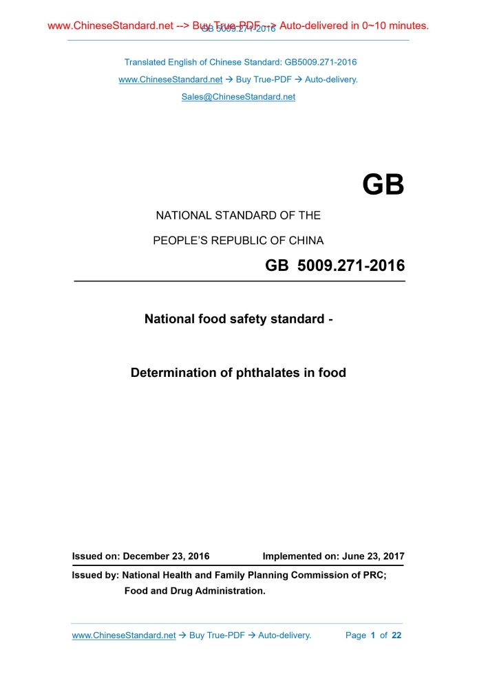 GB 5009.271-2016: National food safety standard - Determination of phthalates in food Delivery: 9 seconds. True-PDF full-copy in English & invoice will be downloaded + auto-delivered via email. See step-by-step procedure Status: Valid