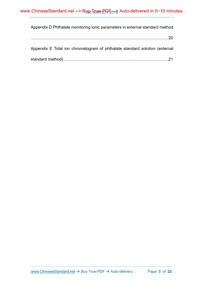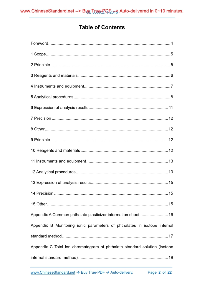 Similar standardsGB 5009.271-2016: National food safety standard - Determination of phthalates in food---This is an excerpt. Full copy of true-PDF in English version (including equations, symbols, images, flow-chart, tables, and figures etc.), auto-downloaded/delivered in 9 seconds, can be purchased online: https://www.ChineseStandard.net/PDF.aspx/GB5009.271-2016GB NATIONAL STANDARD OF THE PEOPLE’S REPUBLIC OF CHINA National food safety standard - Determination of phthalates in food Issued on. DECEMBER 23, 2016 Implemented on. JUNE 23, 2017 Issued by. National Health and Family Planning Commission of PRC; Food and Drug Administration. Table of ContentsForeword... 4 1 Scope... 5 2 Principle... 5 3 Reagents and materials... 6 4 Instruments and equipment... 7 5 Analytical procedures... 8 6 Expression of analysis results... 11 7 Precision... 12 8 Other... 12 9 Principle... 12 10 Reagents and materials... 12 11 Instruments and equipment... 13 12 Analytical procedures... 13 13 Expression of analysis results... 15 14 Precision... 15 15 Other... 15 Appendix A Common phthalate plasticizer information sheet... 16 Appendix B Monitoring ionic parameters of phthalates in isotope internal standard method... 17 Appendix C Total ion chromatogram of phthalate standard solution (isotope internal standard method)... 19 Appendix D Phthalate monitoring ionic parameters in external standard method ... 20 Appendix E Total ion chromatogram of phthalate standard solution (external standard method)... 21ForewordThis standard replaces GB/T 21911-2008 “Determination of phthalate esters in foods” and SN/T 3147-2012 “Determination of phthalates in exported foods”. As compared with GB/T 21911-2008, the main changes of this standard are as follows. - CHANGE the standard name to “National food safety standard - Determination of phthalates in food”; - ADD two target compounds. diallyl phthalate and diisononyl phthalate; - ADD the isotope internal standard method for quantification as the method I; - MODIFY the pre-processing method; - MODIFY the method detection limit. National food safety standard - Determination of phthalates in food1 ScopeThe first method of this standard specifies the method for the determination of the contents of 16 phthalate esters in food by gas chromatography-mass spectrometry (GC-MS); the second method specifies the method for the determination of the contents of 18 phthalates in foods gas chromatography- mass spectrometry (GC-MS). The first method of this standard applies to the determination and confirmation, by the internal standard method, of the contents of Dimethyl phthalate (DMP), Diethyl phthalate (DEP), Diisobutyl phthalate (DIBP), Dibutyl phthalate (DBP), Bis (2-methoxyethyl) phthalate (DMEP), Bis(4-methyl-2-pentyl) phthalate (BMPP), Bis(2-ethoxyethyl) phthalate (DEEP), Dipentyl phthalate (DPP), Dihexyl phthalate (DHXP), Benzylbutyl phthalate (BBP), Bis (2-n-butoxyethyl) phthalate (DBEP), Dicyclohexyl phthalate (DCHP), Bis (2-ethylhexyl) phthalate (DEHP), Diphenylphthalate (DPhP), Di-n-octylphthalate (DNOP) and Dinonyl phthalate (DNP) in foods; the second method is applicable to the determination and confirmation, by the external standard method, of the contents of Dimethyl phthalate (DMP), Diethyl phthalate (DEP), Diallyl phthalate (DAP), Diisobutyl phthalate (DIBP), Dibutyl phthalate (DBP), Bis (2-methoxyethyl) phthalate (DMEP), Bis(4-methyl-2-pentyl) phthalate (BMPP), Bis(2-ethoxyethyl) phthalate (DEEP), Dipentyl phthalate (DPP), Dihexyl phthalate (DHXP), Benzylbutyl phthalate (BBP), Bis (2-n-butoxyethyl) phthalate (DBEP), Dicyclohexyl phthalate (DCHP), Bis (2-ethylhexyl) phthalate (DEHP), Diphenylphthalate (DPhP), Di-n-octylphthalate (DNOP), Diisononyl ortho- phthalate (DINP), Dinonyl phthalate (DNP) in foods. Method I -- Gas chromatography - Mass spectrometry - Isotope internal standard method2 PrincipleThe deuterated phthalate is added to the specimen as an internal standard, various foods are extracted and purified, and then determined by gas chromatography-mass spectrometry. The characteristic selective ion monitoring scan mode (SIM) is used, the ratio of the retention time to the abundance of the qualitative ion fragments is used for qualitative, the isotope internal standard method is used for quantification.3 Reagents and materialsUnless otherwise stated, the reagents used in this method are chromatographically pure, the water is the grade II water as specified in GB/T 6682. 3.1 Reagents 3.1.1 n-Hexane (C6H14). 3.2 Standard substance 3.2.1 The 16 phthalate standard substances The mixed liquid standard substance of Dimethyl phthalate (DMP), Diethyl phthalate (DEP), Diisobutyl phthalate (DIBP), Dibutyl phthalate (DBP), Bis (2- methoxyethyl) phthalate (DMEP), Bis(4-methyl-2-pentyl) phthalate (BMPP), Bis(2-ethoxyethyl) phthalate (DEEP), Dipentyl phthalate (DPP), Dihexyl phthalate (DHXP), Benzylbutyl phthalate (BBP), Bis (2-n-butoxyethyl) phthalate (DBEP), Dicyclohexyl phthalate (DCHP), 3.3 Standard solution preparation 3.3.1 The 16 phthalate standard intermediate solutions (10 μg/mL). accurately PIPETTE 1 mL of phthalate standard substance (1000 μg/mL) into a 100 mL volumetric flask, USE the n-hexane to make its volume reach to the mark. 3.3.2 Phthalate internal standard solution of 16 deuterated isotopes (100 μg/mL).4 Instruments and equipmentNote. After washing the glassware, it is rinsed 3 times with distilled water, it is soaked in acetone for 1 hour, baked at 200 °C for 2 hours, and cooled to room temperature to prepare for use. 4.5 Ultrasonic generator. 4.6 Centrifuge. Speed ≥ 4000 r/min. 4.7 Crusher. 4.8 Solid phase extraction (SPE) device. 4.9 Solid phase extraction column. PSA/Silica composite packed glass column (1000 mg, 6 mL).5 Analytical procedures5.1 Specimen preparation 5.2 Specimen processing 5.2.1 Liquid specimen 5.2.1.1 Liquid specimen A. liquid milk, beverage, soy sauce, vinegar, liquor, honey, etc. 5.2.1.2 Liquid specimen B. vegetable oil