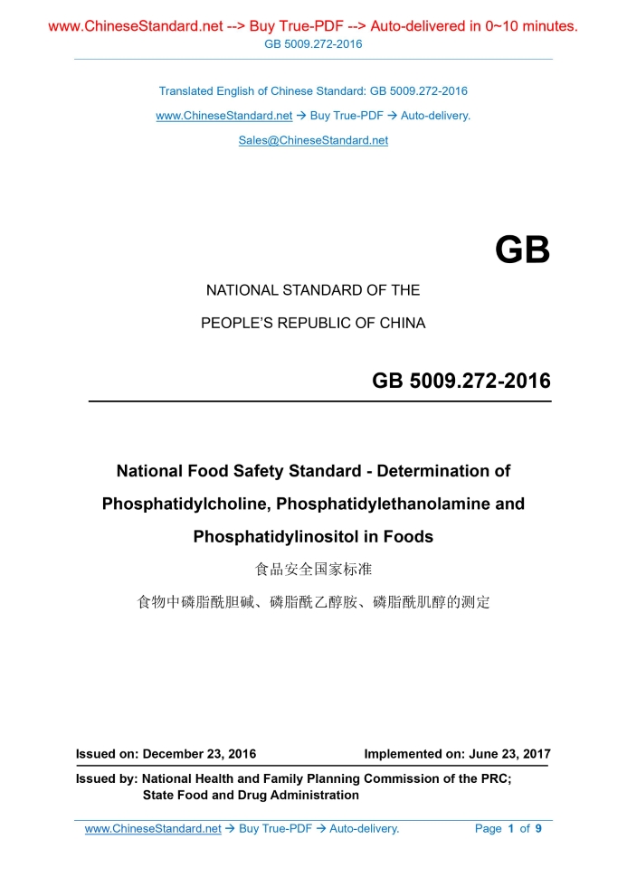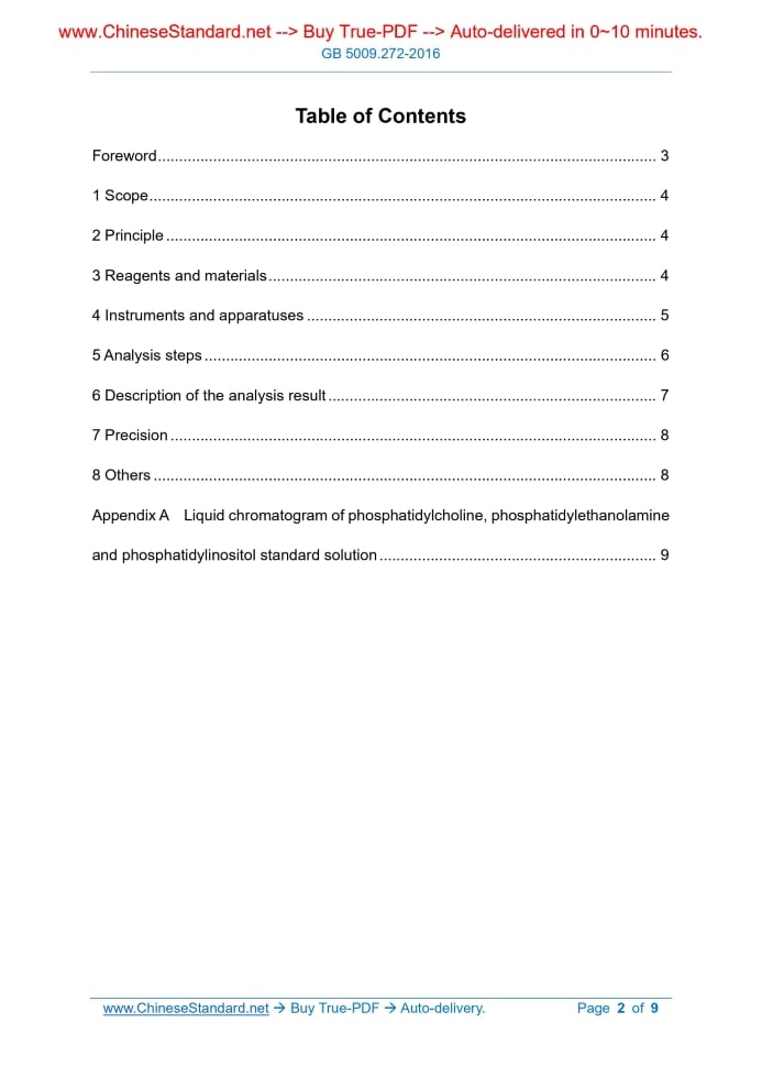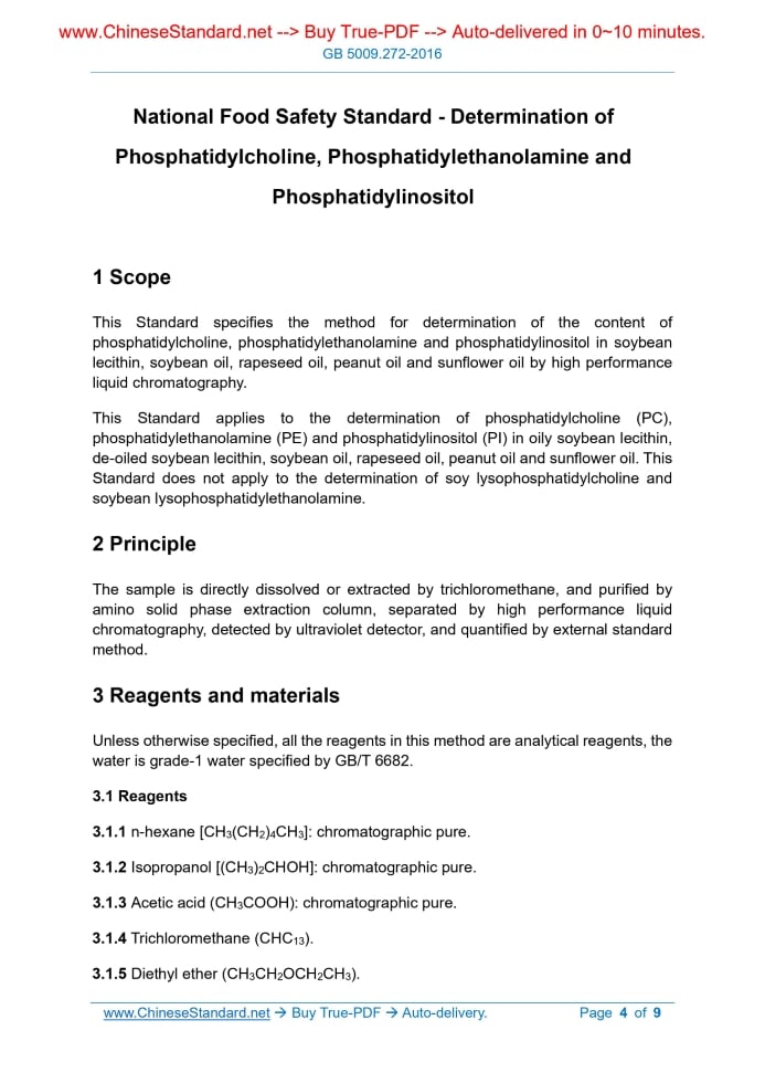 GB 5009.272-2016: Determination of phosphatidylethanolamine, phosphatidylinositol and phosphatidylcholine of soybean phospholipids Delivery: 9 seconds. True-PDF full-copy in English & invoice will be downloaded + auto-delivered via email. See step-by-step procedure Status: Valid
