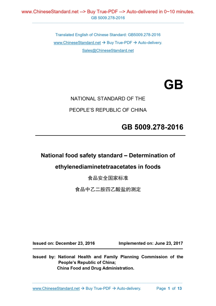 GB 5009.278-2016: National food safety standard - Determination of ethylenediaminetetraacetates in foods Delivery: 9 seconds. True-PDF full-copy in English & invoice will be downloaded + auto-delivered via email. See step-by-step procedure Status: Valid