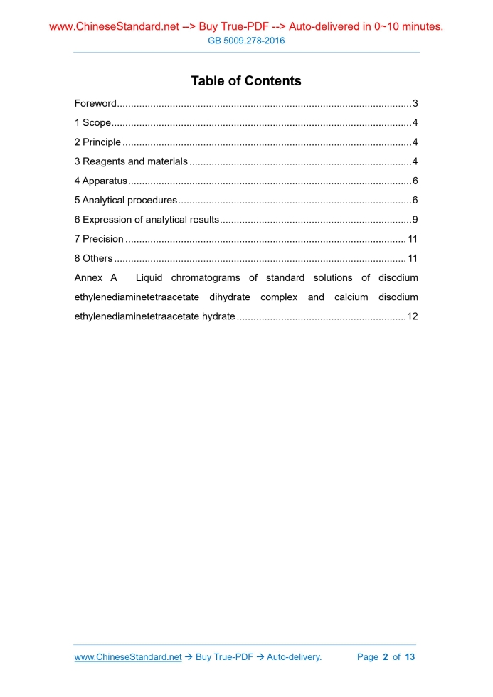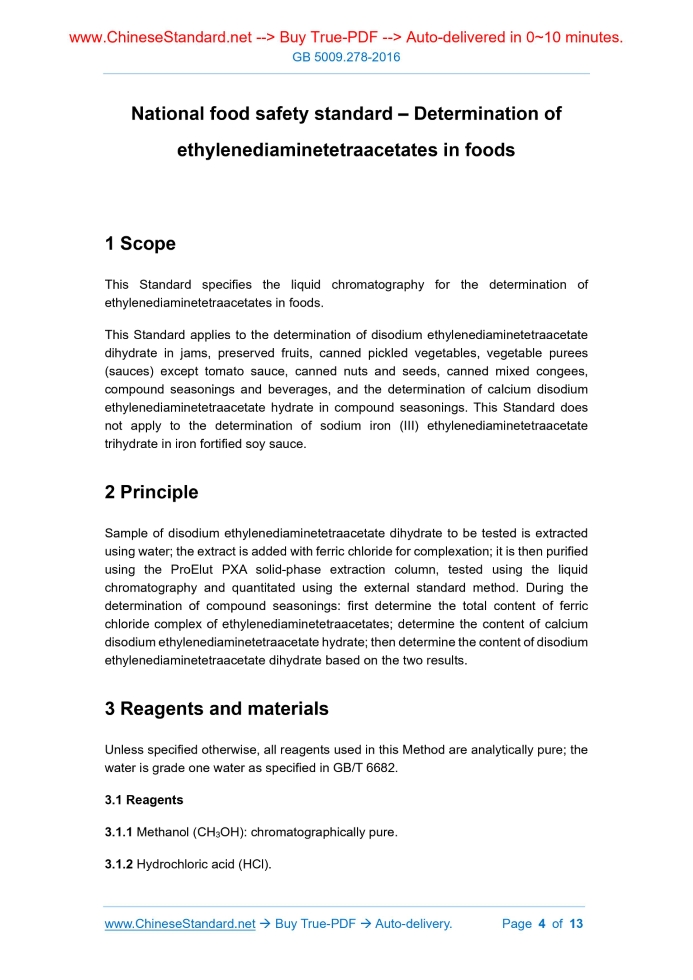 Similar standardsGB 5009.278-2016: National food safety standard - Determination of ethylenediaminetetraacetates in foods---This is an excerpt. Full copy of true-PDF in English version (including equations, symbols, images, flow-chart, tables, and figures etc.), auto-downloaded/delivered in 9 seconds, can be purchased online: https://www.ChineseStandard.net/PDF.aspx/GB5009.278-2016 GB NATIONAL STANDARD OF THE PEOPLE’S REPUBLIC OF CHINA National food safety standard – Determination of ethylenediaminetetraacetates in foods Issued on: DECEMBER 23, 2016 Implemented on: JUNE 23, 2017 Issued by. National Health and Family Planning Commission of the People’s Republic of China; China Food and Drug Administration. Table of ContentsForeword ... 3 1 Scope ... 4 2 Principle ... 4 3 Reagents and materials ... 4 4 Apparatus ... 6 5 Analytical procedures ... 6 6 Expression of analytical results ... 9 7 Precision ... 11 8 Others ... 11 Annex A Liquid chromatograms of standard solutions of disodium ethylenediaminetetraacetate dihydrate complex and calcium disodium ethylenediaminetetraacetate hydrate ... 12 National food safety standard – Determination of ethylenediaminetetraacetates in foods1 ScopeThis Standard specifies the liquid chromatography for the determination of ethylenediaminetetraacetates in foods. This Standard applies to the determination of disodium ethylenediaminetetraacetate dihydrate in jams, preserved fruits, canned pickled vegetables, vegetable purees (sauces) except tomato sauce, canned nuts and seeds, canned mixed congees, compound seasonings and beverages, and the determination of calcium disodium ethylenediaminetetraacetate hydrate in compound seasonings. This Standard does not apply to the determination of sodium iron (III) ethylenediaminetetraacetate trihydrate in iron fortified soy sauce.2 PrincipleSample of disodium ethylenediaminetetraacetate dihydrate to be tested is extracted using water; the extract is added with ferric chloride for complexation; it is then purified using the ProElut PXA solid-phase extraction column, tested using the liquid chromatography and quantitated using the external standard method. During the determination of compound seasonings. first determine the total content of ferric chloride complex of ethylenediaminetetraacetates; determine the content of calcium disodium ethylenediaminetetraacetate hydrate; then determine the content of disodium ethylenediaminetetraacetate dihydrate based on the two results.3 Reagents and materialsUnless specified otherwise, all reagents used in this Method are analytically pure; the water is grade one water as specified in GB/T 6682. 3.1 Reagents 3.1.1 Methanol (CH3OH). chromatographically pure. 3.1.2 Hydrochloric acid (HCl). working solutions of 0.5 μg/mL, 2.0 μg/mL, 5.0 μg/mL, 10.0 μg/mL and 50.0 μg/mL. 3.4.3 Calcium disodium ethylenediaminetetraacetate hydrate standard solution. accurately weigh an appropriate amount of calcium disodium ethylenediaminetetraacetate hydrate standard substance; use water to dissolve and make up to a brown volumetric flask of 100 mL to obtain a standard stock solution of concentration 10 mg/mL; transfer the solution to a receiver for storage below 4°C. 3.4.4 Calcium disodium ethylenediaminetetraacetate hydrate standard serial solutions. absorb 1 volume of calcium disodium ethylenediaminetetraacetate hydrate standard solution and 9 volumes of water to dilute to a standard medium solution of concentration 1 mg/mL. Then use water to dilute the calcium disodium ethylenediaminetetraacetate hydrate standard solution to serial standard working solutions of 1.0 μg/mL, 10.0 μg/mL, 20.0 μg/mL, 50.0 μg/mL and 100.0 μg/mL.4 Apparatus4.1 Liquid chromatograph. equipped with an ultraviolet detector. 4.2 Electronic balance. sensitivities 0.1 mg and 0.01 g. 4.3 Centrifugal machine. rotational speed ≥ 7,500 r/min. 4.4 Vortex oscillator. 4.5 Ultrasonic cleaner. 4.6 pH meter. accuracy 0.01. 4.7 24-hole solid phase extraction apparatus. 4.8 Micropore filter membrane. 0.45 μm. 4.9 ProElut PXA solid phase extraction column. 150 mg/6 mL or equivalent. The main ingredient of PXA is quaternary ammonium groups bonded on the copolymer of polystyrene and divinyl benzene containing hydrophilic groups.5 Analytical procedures5.1 Sample preparation 5.1.1 Solid sample Use a pulverizer to crush sample; mix up before loading into a clean container; seal and mark the container. Sample having a high content of sugar needs to be frozen (only referring to compound seasonings) 5.2.2.1 Extraction As in 5.2.1.1. 5.2.2.2 Purification Use in succession 5 mL of methanol and 5 mL of water to activate the PXA column; pass all solution to be purified through the column; use in succession 5 mL of water and 5 mL of methanol to rinse; drain; use 5 mL of 5% formic acid-methanol aqueous solution for elution; drain; collect the eluant to make up to 5 mL; filter; determine on a liquid chromatograph. 5.3 Instrument reference conditions a) chromatographic column. Plus-C18 column, 250 mm in length, 4.6 mm in inner diameter and 5.0 μm in grain size, or an equivalent chromatographic column; b) moving phase for the detection of disodium ethylenediaminetetraacetate dihydrate complex. methanol. tetrabutylammonium bromide-sodium acetate mixed solution (pH 4.0) = 15.85; c) moving phase for the detection of calcium disodium ethylenediaminetetraacetate hydrate. tetrabutylammonium bromide-sodium acetate mixed solution (pH 2.5) = 15.85; d) flow rate. 0.8 mL/min; e) column temperature. 35°C; f) wavelength. 254 nm; g) volume of sample. 10 μL. 5.4 Plotting of standard curve 5.4.1 Determination of total content of ethylenediaminetetraacetates Absorb respectively 0 μL, 25 μL, 100 μL, 250 μL, 500 μL and 2,500 μL of disodium ethylenediaminetetraacetate dihydrate standard medium solution of concentration 1 mg/mL to pour into a colourimetric tube of 50 mL; add 25 mL of water and 1.0 mL of ferric chloride solution; use vortex to mix up; 