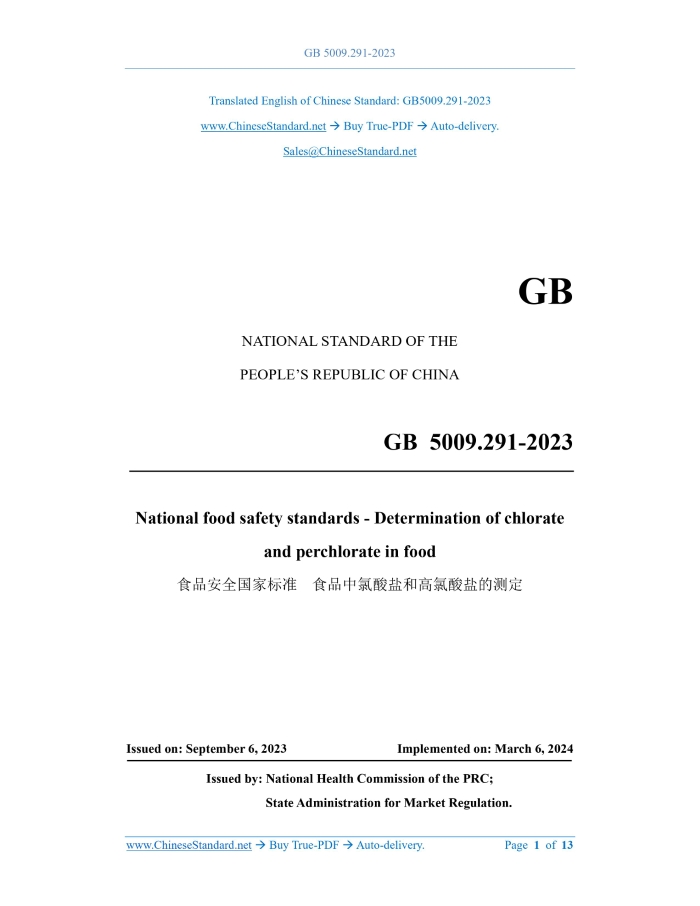 GB 5009.291-2023: National food safety standard - Determination of chlorate and perchlorate in foods Delivery: 9 seconds. True-PDF full-copy in English & invoice will be downloaded + auto-delivered via email. See step-by-step procedure Status: Valid