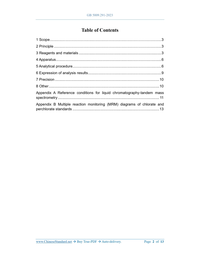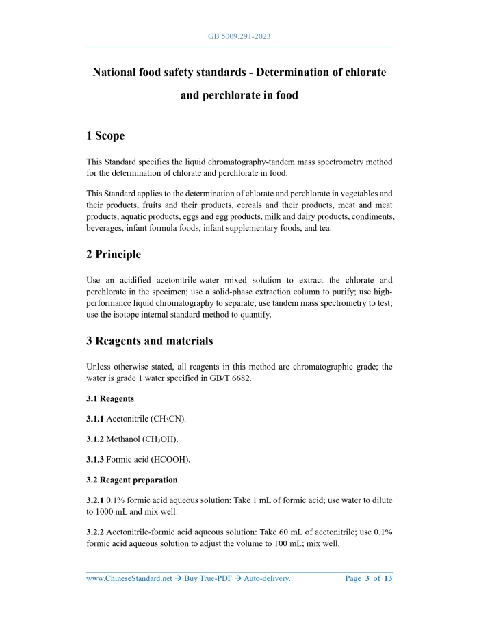 Similar standardsGB 5009.291-2023: National food safety standard - Determination of chlorate and perchlorate in foods---This is an excerpt. Full copy of true-PDF in English version (including equations, symbols, images, flow-chart, tables, and figures etc.), auto-downloaded/delivered in 9 seconds, can be purchased online: https://www.ChineseStandard.net/PDF.aspx/GB5009.291-2023 GB NATIONAL STANDARD OF THE PEOPLE’S REPUBLIC OF CHINA National food safety standards - Determination of chlorate and perchlorate in food Issued on: SEPTEMBER 6, 2023 Implemented on: MARCH 6, 2024 Issued by. National Health Commission of the PRC; State Administration for Market Regulation. Table of Contents1 Scope... 3 2 Principle... 3 3 Reagents and materials... 3 4 Apparatus... 6 5 Analytical procedure... 6 6 Expression of analysis results... 9 7 Precision... 10 8 Other... 10 Appendix A Reference conditions for liquid chromatography-tandem mass spectrometry... 11 Appendix B Multiple reaction monitoring (MRM) diagrams of chlorate and perchlorate standards... 13 National food safety standards - Determination of chlorate and perchlorate in food1 ScopeThis Standard specifies the liquid chromatography-tandem mass spectrometry method for the determination of chlorate and perchlorate in food. This Standard applies to the determination of chlorate and perchlorate in vegetables and their products, fruits and their products, cereals and their products, meat and meat products, aquatic products, eggs and egg products, milk and dairy products, condiments, beverages, infant formula foods, infant supplementary foods, and tea.2 PrincipleUse an acidified acetonitrile-water mixed solution to extract the chlorate and perchlorate in the specimen; use a solid-phase extraction column to purify; use high- performance liquid chromatography to separate; use tandem mass spectrometry to test; use the isotope internal standard method to quantify.3 Reagents and materialsUnless otherwise stated, all reagents in this method are chromatographic grade; the water is grade 1 water specified in GB/T 6682. 3.1 Reagents 3.1.1 Acetonitrile (CH3CN). 3.1.2 Methanol (CH3OH). 3.1.3 Formic acid (HCOOH). 3.2 Reagent preparation 3.2.1 0.1% formic acid aqueous solution. Take 1 mL of formic acid; use water to dilute to 1000 mL and mix well. 3.2.2 Acetonitrile-formic acid aqueous solution. Take 60 mL of acetonitrile; use 0.1% formic acid aqueous solution to adjust the volume to 100 mL; mix well. 3.3 Standards 3.3.1 Sodium chlorate (NaClO3, CAS number. 7775-09-9). Purity is >99%; or a standard certified by the state and granted the reference material certificate. 3.3.2 Sodium perchlorate (NaClO4, CAS number. 7601-89-0). Purity is >99%; or a standard certified by the state and granted the reference material certificate. 3.3.3 18O3-chlorate (chlorate isotope internal standard). 100 μg/mL (calculated as 18O3- chlorate). 3.3.4 18O4-perchlorate (perchlorate isotope internal standard). 100 μg/mL (calculated as 18O4-perchlorate). 3.4 Preparation of standard solutions 3.4.1 Chlorate standard stock solution (1.0 mg/mL, calculated as chlorate). Accurately weigh 1.2801 g of sodium chlorate; use water to dissolve and dilute to 1000 mL; mix well. Store it at 2 °C~8 °C. The validity period is 1 year. 3.4.2 Perchlorate standard stock solution (1.0 mg/mL, calculated as perchlorate). Accurately weigh 1.2300 g of sodium perchlorate; use water to dissolve and dilute to 1000 mL; mix well. Store it at 2 °C~8 °C. The validity period is 1 year. Note. The standard stock solutions of chlorate and perchlorate can use standards certified by the state and granted the reference material certificate. 3.4.3 Perchlorate standard stock intermediate solution (100 μg/mL). Accurately pipette 10.0 mL of perchlorate standard stock solution; place it in a 100 mL volumetric flask; use water to dilute and make up to volume; mix well; transfer the solution to a reagent bottle. Store it at 2 °C~8 °C. The validity period is 1 year. 3.4.4 Chlorate and perchlorate mixed standard intermediate solution. Respectively pipette 1.00 mL of chlorate standard stock solution AND 1.00 mL of perchlorate standard stock intermediate solution; place them in the same 100 mL volumetric flask. Use water to dilute and make up to volume; shake well; prepare a mixed standard intermediate solution with mass concentrations of chlorate and perchlorate of 10 μg/mL and 1.0 μg/mL respectively; transfer the solution to a reagent bottle. Store it at 2 °C~8 °C. The validity period is 3 months. 3.4.5 Chlorate and perchlorate mixed standard use solution Ⅰ. Pipette 1.00 mL of chlorate and perchlorate mixed standard intermediate solution; place it in a 10 mL volumetric flask. Use water to dilute and make up to volume; shake well; prepare a mixed standard use solution with mass concentrations of chlorate and perchlorate of 1000 ng/mL and 100 ng/mL respectively; transfer the solution to a reagent bottle. Store it at 2 °C~8 °C. The validity period is 1 month. 3.4.6 Chlorate and perchlorate mixed standard use solution II. Pipette 1.00 mL of chlorate and perchlorate mixed standard use solution I; place it in a 10 mL volumetric flask. Use water to dilute and make up to volume; shake well; prepare a mixed standard use solution with mass concentrations of chlorate and perchlorate of 100 ng/mL and 10 ng/mL respectively; transfer the solution to a reagent bottle. Store it at 2 °C~8 °C. The validity period is 1 month. 3.4.7 Chlorate and perchlorate isotope internal-standard mixed standard intermediate solution. Pipette 0.50 mL of chlorate isotope internal standard AND 50 μL of perchlorate isotope internal standard; place them in the same 10 mL volumetric flask. Use water to dilute and make up to volume; shake well; prepare a mixed standard intermediate solution with mass concentrations of chlorate internal standard and perchlorate internal standard of 5.0 μg/mL and 0.50 μg/mL, respectively. Store it at 2 °C~8 °C. The validit