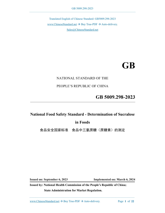 GB 5009.298-2023: National food safety standard - Determination of sucralose in foods Delivery: 9 seconds. True-PDF full-copy in English & invoice will be downloaded + auto-delivered via email. See step-by-step procedure Status: Valid