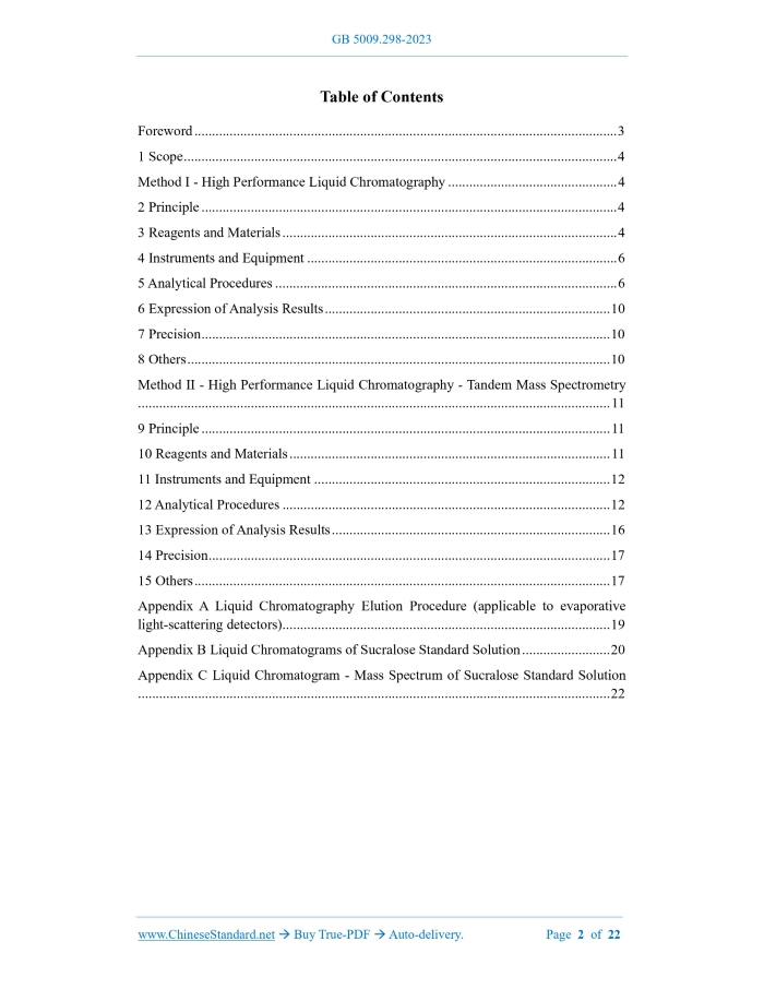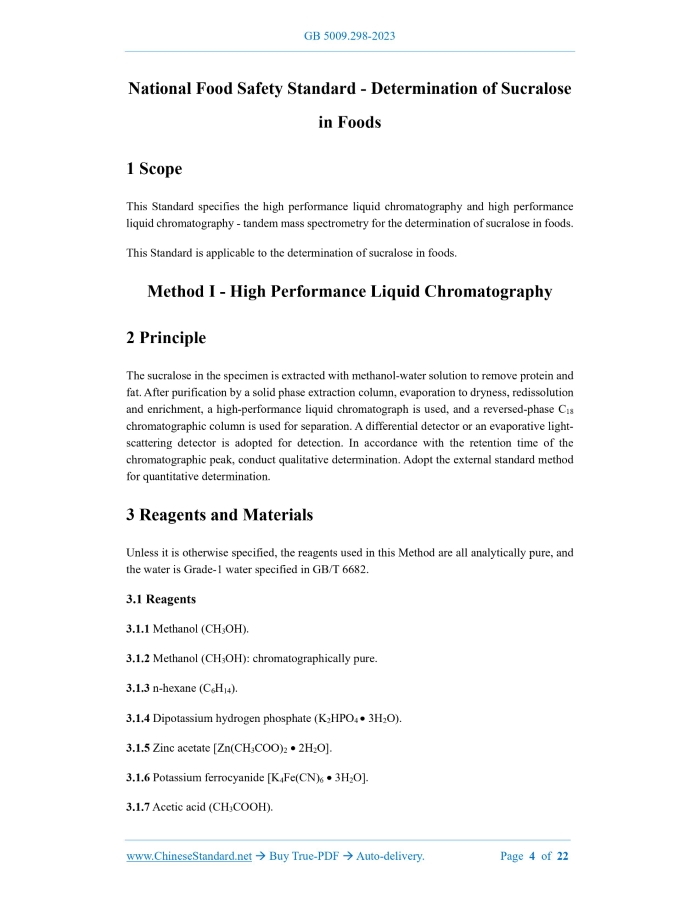Similar standardsGB 5009.298-2023: National food safety standard - Determination of sucralose in foods---This is an excerpt. Full copy of true-PDF in English version (including equations, symbols, images, flow-chart, tables, and figures etc.), auto-downloaded/delivered in 9 seconds, can be purchased online: https://www.ChineseStandard.net/PDF.aspx/GB5009.298-2023GB NATIONAL STANDARD OF THE PEOPLE’S REPUBLIC OF CHINA National Food Safety Standard - Determination of Sucralose in Foods Issued on: SEPTEMBER 6, 2023 Implemented on: MARCH 6, 2024 Issued by. National Health Commission of the People’s Republic of China; State Administration for Market Regulation. Table of ContentsForeword... 3 1 Scope... 4 Method I - High Performance Liquid Chromatography... 4 2 Principle... 4 3 Reagents and Materials... 4 4 Instruments and Equipment... 6 5 Analytical Procedures... 6 6 Expression of Analysis Results... 10 7 Precision... 10 8 Others... 10 Method II - High Performance Liquid Chromatography - Tandem Mass Spectrometry ... 11 9 Principle... 11 10 Reagents and Materials... 11 11 Instruments and Equipment... 12 12 Analytical Procedures... 12 13 Expression of Analysis Results... 16 14 Precision... 17 15 Others... 17 Appendix A Liquid Chromatography Elution Procedure (applicable to evaporative light-scattering detectors)... 19 Appendix B Liquid Chromatograms of Sucralose Standard Solution... 20 Appendix C Liquid Chromatogram - Mass Spectrum of Sucralose Standard Solution ... 22 National Food Safety Standard - Determination of Sucralose in Foods1 ScopeThis Standard specifies the high performance liquid chromatography and high performance liquid chromatography - tandem mass spectrometry for the determination of sucralose in foods. This Standard is applicable to the determination of sucralose in foods. Method I - High Performance Liquid Chromatography2 PrincipleThe sucralose in the specimen is extracted with methanol-water solution to remove protein and fat. After purification by a solid phase extraction column, evaporation to dryness, redissolution and enrichment, a high-performance liquid chromatograph is used, and a reversed-phase C18 chromatographic column is used for separation. A differential detector or an evaporative light- scattering detector is adopted for detection. In accordance with the retention time of the chromatographic peak, conduct qualitative determination. Adopt the external standard method for quantitative determination.3 Reagents and MaterialsUnless it is otherwise specified, the reagents used in this Method are all analytically pure, and the water is Grade-1 water specified in GB/T 6682. 3.1 Reagents 3.1.1 Methanol (CH3OH). 3.1.2 Methanol (CH3OH). chromatographically pure. 3.1.3 n-hexane (C6H14). 3.1.4 Dipotassium hydrogen phosphate (K2HPO4 3H2O). 3.1.5 Zinc acetate [Zn(CH3COO)2 2H2O]. 3.1.6 Potassium ferrocyanide [K4Fe(CN)6 3H2O]. 3.1.7 Acetic acid (CH3COOH). 3.1.8 Acetonitrile (CH3CN). chromatographically pure. 3.1.9 Neutral alumina. with a particle size of 75 m ~ 150 m (100 mesh ~ 200 mesh). 3.2 Preparation of Reagents 3.2.1 Zinc acetate solution (219 g/L). weigh-take 21.9 g of zinc acetate, add 3 mL of acetic acid, and add water to dissolve it to 100 mL. 3.2.2 Potassium ferrocyanide solution (106 g/L). weigh-take 10.6 g of potassium ferrocyanide and add water to dissolve it to 100 mL. 3.2.3 Dipotassium hydrogen phosphate solution (0.1%). weigh-take 0.1 g of dipotassium hydrogen phosphate and add water to dissolve it to 100 mL. 3.2.4 Methanol-0.1% dipotassium hydrogen phosphate solution (20 + 80). evenly mix methanol and 0.1% dipotassium hydrogen phosphate solution in a volume ratio of 20. 80. 3.2.5 Methanol-water solution (75 + 25). evenly mix methanol and water in a volume ratio of 75. 25. 3.2.6 Water-acetonitrile solution (89 + 11). evenly mix water and acetonitrile in a volume ratio of 89. 11. 3.3 Reference Material Sucralose reference material (C12H19Cl3O8, CAS. 56038-13-2). purity 99%, or a standard substance certified by the state and awarded a reference material certificate. 3.4 Preparation of Standard Solutions 3.4.1 Sucralose standard stock solution (10.0 mg/mL). weigh-take 0.25 g (accurate to 0.0001 g) of sucralose reference material, use water to dissolve it and transfer to a 25 mL volumetric flask. Reach a constant volume to the scale and evenly mix it. The stock solution is stored in a 4 C refrigerator with a shelf life of 6 months. 3.4.2 Sucralose standard intermediate solution (1.00 mg/mL). transfer-take 5.00 mL of sucralose standard stock solution (10.0 mg/mL) in a 50 mL volumetric flask, use water to reach a constant volume to the scale and evenly mix it. Store it in a 4 C refrigerator with a shelf life of 3 months. 3.4.3 Sucralose standard series of working solutions. transfer-take an appropriate amount of sucralose standard intermediate solution (1.00 mg/mL), use water to dilute it and prepare standard series of working solutions with a mass concentration of 0.0200 mg/mL, 0.0500 mg/mL, 0.100 mg/mL, 0.200 mg/mL, 0.400 mg/mL, 0.800 mg/mL and 1.00 mg/mL, respectively. Prepare them right before use. 3.5 Materials 5.2.1.2 Alcohol specimens containing solid substance Weigh-take 2 g ~ 5 g (accurate to 0.001 g) of evenly mixed alcohol specimen in an evaporating dish, heat it on a 60 C water bath for 30 minutes, use 10 mL of water to rinse the residue in the evaporating dish in three times, and combine the washing fluids and transfer them to a 15 mL centrifuge tube. On a vortex mixer, oscillate it for 3 minutes, perform ultrasonic extraction for 20 minutes, then, at 8,500 r/min, centrifuge for 5 minutes. Use 5 mL of water to repeat the extraction once, combine the extracting solutions and reserve the supernatant for purification. 5.2.2 Vinegar, soy sauce, sauce and sauce products specimens 5.2.2.1 Weigh-take 2 g ~ 5 g (accurate to 0.001 g) of evenly mixed specimen in a 50 mL centrifuge tube, add 1.0 g of neutral alumina and add 5 mL of water. On a vortex mixer, osci