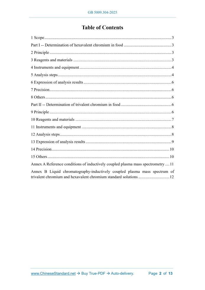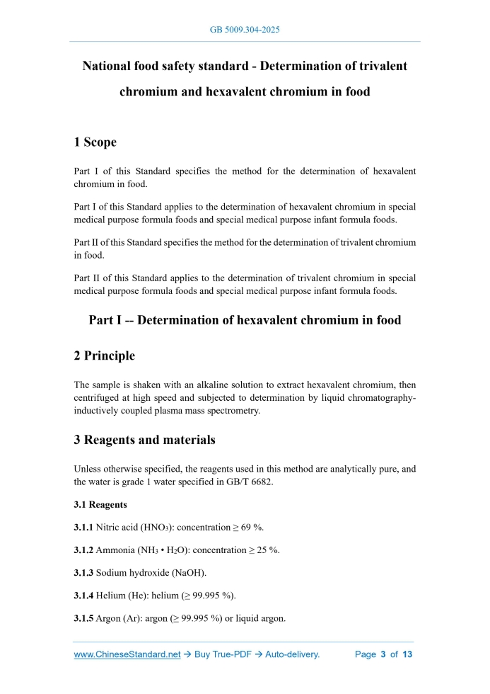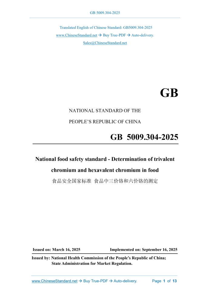 GB 5009.304-2025: National food safety standard - Determination of trivalent chromium and hexavalent chromium in foods Delivery: 9 seconds. True-PDF full-copy in English & invoice will be downloaded + auto-delivered via email. See step-by-step procedure Status: Valid