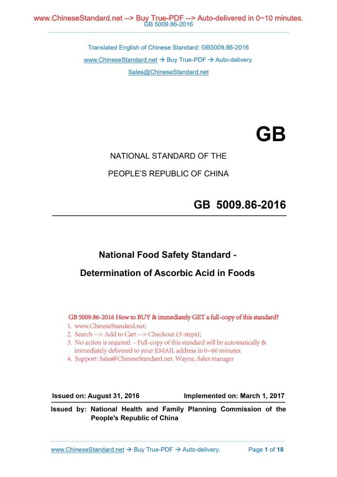 GB 5009.86-2016: National food safety standard - Determination of Ascorbic Acid in Foods Delivery: 9 seconds. True-PDF full-copy in English & invoice will be downloaded + auto-delivered via email. See step-by-step procedure Status: Valid GB 5009.86: Historical versions