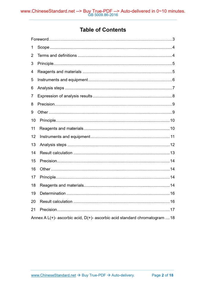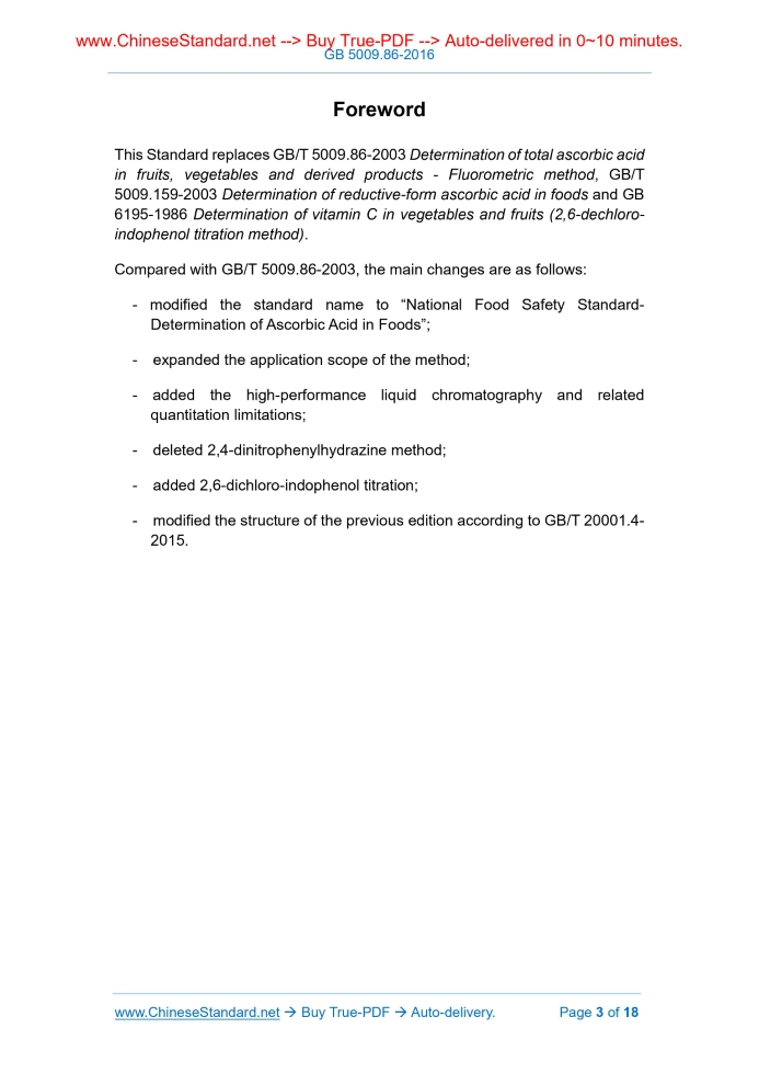 Similar standardsGB 5009.86-2016: National food safety standard - Determination of Ascorbic Acid in Foods---This is an excerpt. Full copy of true-PDF in English version (including equations, symbols, images, flow-chart, tables, and figures etc.), auto-downloaded/delivered in 9 seconds, can be purchased online: https://www.ChineseStandard.net/PDF.aspx/GB5009.86-2016GB NATIONAL STANDARD OF THE PEOPLE’S REPUBLIC OF CHINA National Food Safety Standard - Determination of Ascorbic Acid in Foods Issued on. AUGUST 31, 2016 Implemented on. MARCH 1, 2017 Issued by. National Health and Family Planning Commission of the People's Republic of China Table of ContentsForeword... 3 1 Scope... 4 2 Terms and definitions... 4 3 Principle... 5 4 Reagents and materials... 5 5 Instruments and equipment... 6 6 Analysis steps... 7 7 Expression of analysis results... 8 8 Precision... 9 9 Other... 9 10 Principle... 10 11 Reagents and materials... 10 12 Instruments and equipment... 11 13 Analysis steps... 12 14 Result calculation... 13 15 Precision... 14 16 Other... 14 17 Principle... 14 18 Reagents and materials... 14 19 Determination... 16 20 Result calculation... 16 21 Precision... 17 Annex A L(+)- ascorbic acid, D(+)- ascorbic acid standard chromatogram... 18ForewordThis Standard replaces GB/T 5009.86-2003 Determination of total ascorbic acid in fruits, vegetables and derived products - Fluorometric method, GB/T 5009.159-2003 Determination of reductive-form ascorbic acid in foods and GB 6195-1986 Determination of vitamin C in vegetables and fruits (2,6-dechloro- indophenol titration method). Compared with GB/T 5009.86-2003, the main changes are as follows. - modified the standard name to “National Food Safety Standard- Determination of Ascorbic Acid in Foods”; - expanded the application scope of the method; - added the high-performance liquid chromatography and related quantitation limitations; - deleted 2,4-dinitrophenylhydrazine method; - added 2,6-dichloro-indophenol titration; - modified the structure of the previous edition according to GB/T 20001.4- 2015. National Food Safety Standard - Determination of Ascorbic Acid in Foods1 ScopeThis Standard specifies the high-performance liquid chromatography, fluorescence method, 2,6-dichloro-indophenol titration method for the determination of ascorbic acid in food. Method One of this Standard applies to the determination of total amount of L(+)- ascorbic acid, D(+)- ascorbic acid and L(+)- ascorbic acid in milk powder, cereals, vegetables, fruits and their products, meat products, vitamin supplements, jellies, gummies, rice pudding, wine. Method Two is applicable to the determination of L(+)- total amount of ascorbic acid in milk powder, vegetables, fruits and their products. Method Three applies to the determination of L(+)- total amount of ascorbic acid in fruits, vegetables and their products.2 Terms and definitions2.1 Ascorbic acid. an organic compound with antioxidant properties. It is also known as "Vitamin C," one of the essential nutrients in human body. 2.2 L(+)- ascorbic acid. left-right rotation ascorbic acid that has a strong reduction. It has biological activity on the human body. 2.5 L(+)- total amount of ascorbic acid. total amount of ascorbic acid obtained when L(+)- dehydroascorbate in the sample is reduced to L(+)- ascorbic acid OR L(+)- dehydroascorbic acid is oxidized by L(+)- ascorbic acid in the sample. Method One -- High performance liquid chromatography3 PrincipleAfter ascorbic acid in the sample is dissolved with metaphosphoric acid and extracted by sonication, use ion-pair reagent as mobile phase. Separate it through reverse phase column. L(+)- ascorbic acid and D(+)- ascorbic acid are measured directly with a liquid chromatograph (wavelength of 245 nm) equipped with a UV detector.4 Reagents and materialsUnless otherwise specified, the reagents used in this method are of analytical grade pure, water is of grade one specified in GB/T 6682. 4.1 Reagents 4.1.1 Metaphosphoric acid (HPO3)n. content (calculated as HPO3) ≥38% 4.1.7 Methanol (CH3OH). chromatographically pure 4.2 Reagent preparation 4.2.1 Methanophosphoric acid solution (200 g/L). weigh 200 g (to the nearest of 0.1 g) of metaphosphoric acid (4.1.1), dissolve in water and dilute to 1 L; this solution can be stored in a 4°C environment for one month. 4.2.4 L-cysteine solution (40 g/L). weigh 4g of L-cysteine; dissolve in water and dilute to 100 ml. Prepare it when using. 4.3 Standard product 4.3.1 L(+)- ascorbic acid standard product (C6H8O6). purity ≥99% 4.4 Preparation of standard solution 4.4.1 L(+)- ascorbate standard stock solution (1.000 mg/mL). accurately weigh 0.01 g of L(+)- ascorbic acid standard product (to the nearest of 0.01 mg); use 20 g/L meta-phosphoric acid solution to set volume to 10 mL. 4.4.2 D(+)- ascorbate standard stock solution (1.000 mg/mL). accurately weigh 0.01 g of D(+)- ascorbate standard product (to the nearest of 0.01 mg); use 20 g/L metaphosphoric acid solution to set volume to 10 mL.5 Instruments and equipment5.1 Liquid chromatograph. equipped with a diode array detector or UV detector 5.2 pH meter. precision of 0.01 5.5 Centrifuge. speed ≥4000 r/min 5.6 Homogenizer 5.7 Filter membrane. 0.45 μm aqueous film6 Analysis stepsThe entire testing process is under the conditions as dark as possible. 6.1 Sample preparation 6.1.1 Liquid or solid powder sample. after well mixing, it shall be immediately used for testing. 6.2 Preparation of sample solution Weigh about 0.5g ~ 2g (to the nearest of 0.001 g) of uniformly mixed solid sample or homogenized sample with respect to the sample OR pipette 2mL ~ 10Ml of liquid sample [making that the sample contains about 0.03mg ~ 6mg of L(+)- ascorbic acid] into 50mL beaker. Transfer the sample to a 50-mL volumetric flask with 20 g/L metaphosphoric acid solution (4.2.2). 6.3 Sample solution reduction Accurately pipette 20 mL of supernatant that is through centrifugation in 50-mL centrifuge tube. Add into 10