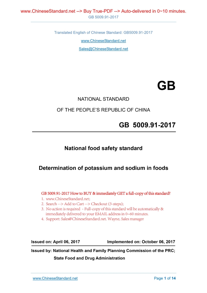 GB 5009.91-2017: National food safety standard - Determination of potassium and sodium in foods Delivery: 9 seconds. True-PDF full-copy in English & invoice will be downloaded + auto-delivered via email. See step-by-step procedure Status: Valid GB 5009.91: Historical versions