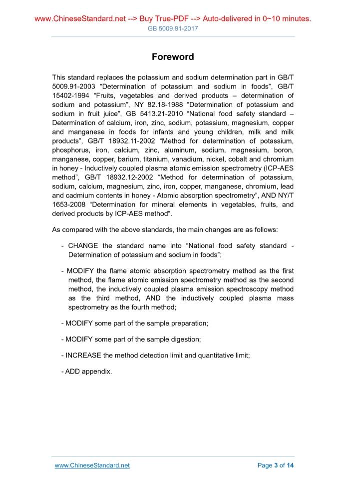 Similar standardsGB 5009.91-2017: National food safety standard - Determination of potassium and sodium in foods---This is an excerpt. Full copy of true-PDF in English version (including equations, symbols, images, flow-chart, tables, and figures etc.), auto-downloaded/delivered in 9 seconds, can be purchased online: https://www.ChineseStandard.net/PDF.aspx/GB5009.91-2017GB NATIONAL STANDARD National food safety standard Determination of potassium and sodium in foods Issued on. APRIL 06, 2017 Implemented on. OCTOBER 06, 2017 Issued by. National Health and Family Planning Commission of the PRC; State Food and Drug Administration Table of ContentsForeword... 3 1 Scope... 4 2 Principle... 4 3 Reagents and materials... 4 4 Instruments and equipment... 6 5 Analytical procedures... 6 6 Expression of analytical results... 9 7 Precision... 9 8 Others... 9 9 Principles... 10 10 Reagents and materials... 10 11 Instruments and equipment... 11 12 Analytical procedures... 12 13 Expression of analytical results... 12 14 Precision... 13 15 Others... 13 Appendix A Sample determination reference condition... 14ForewordThis standard replaces the potassium and sodium determination part in GB/T 5009.91-2003 “Determination of potassium and sodium in foods”, GB/T 15402-1994 “Fruits, vegetables and derived products – determination of sodium and potassium”, NY 82.18-1988 “Determination of potassium and sodium in fruit juice”, GB 5413.21-2010 “National food safety standard – Determination of calcium, iron, zinc, sodium, potassium, magnesium, copper and manganese in foods for infants and young children, milk and milk products”, GB/T 18932.11-2002 “Method for determination of potassium, phosphorus, iron, calcium, zinc, aluminum, sodium, magnesium, boron, manganese, copper, barium, titanium, vanadium, nickel, cobalt and chromium in honey - Inductively coupled plasma atomic emission spectrometry (ICP-AES method”, GB/T 18932.12-2002 “Method for determination of potassium, sodium, calcium, magnesium, zinc, iron, copper, manganese, chromium, lead and cadmium contents in honey - Atomic absorption spectrometry”, AND NY/T 1653-2008 “Determination for mineral elements in vegetables, fruits, and derived products by ICP-AES method”. As compared with the above standards, the main changes are as follows. - CHANGE the standard name into “National food safety standard - Determination of potassium and sodium in foods”; - MODIFY the flame atomic absorption spectrometry method as the first method, the flame atomic emission spectrometry method as the second method, the inductively coupled plasma emission spectroscopy method as the third method, AND the inductively coupled plasma mass spectrometry as the fourth method; - MODIFY some part of the sample preparation; - MODIFY some part of the sample digestion; - INCREASE the method detection limit and quantitative limit; - ADD appendix. National food safety standard Determination of potassium and sodium in foods1 ScopeThis standard specifies four methods for the determination of potassium and sodium in food. the flame atomic absorption spectrometry, the flame atomic emission spectrometry, the inductively coupled plasma emission spectroscopy, AND the inductively coupled plasma mass spectrometry. This standard applies to the determination of potassium and sodium in food. Method I. Flame atomic absorption spectrometry2 PrincipleAfter digestion, the sample is injected into the atomic absorption spectrometer. After the flame atomization, the potassium and sodium respectively absorb the 766.5 nm and 589.0 nm resonance line. AND within a concentration range, its absorption value is proportional to the contents of potassium and sodium, AND it is quantified through comparison with standard series.3 Reagents and materialsUnless otherwise specified, the reagents used in this method are excellent grade pure, AND the water is level II water as specified in GB/T 6682. 3.1 Reagents 3.2 Reagent preparation 3.3 Standard substance 3.3.1 Potassium chloride standard substance (KCl). its purity is greater than 99.99%. 3.3.2 Sodium chloride standard substance (NaCl). its purity is greater than 99.99%. 3.4 Preparation of standard solution 3.4.1 Potassium and sodium standard stock solution (1000 mg/L). PLACE the potassium chloride or sodium chloride in the oven at 110 °C ~ 120 °C to dry it for 2 h. Accurately WEIGH 1.9068 g of potassium chloride or 2.5421 g of sodium chloride; 3.4.2 Potassium and sodium standard working solution (100 mg/L). accurately PIPETTE 10.0 mL of potassium or sodium standard stock solution in a 100 mL volumetric flask; USE water to dilute it to the mark; STORE it in a polyethylene bottle; PRESERVE it at 4 °C. 3.4.3 Potassium and sodium standard series working solution. accurately PIPETTE 0 mL, 0.1 mL, 0.5 mL, 1.0 mL, 2.0 mL, and 4.0 mL of potassium standard working solution in 100 mL volumetric flask; ADD 4 mL of cesium chloride solution; USE water to make its volume reach to the mark;4 Instruments and equipment4.1 Atomic absorption spectrometer, with flame atomizer and potassium, sodium hollow cathode lamp. 4.2 Analytical balance. sensitivity of 0.1 mg and 1.0 mg. 4.5 Muffle furnace. 4.6 Adjustable temperature control heating plate. 4.7 Adjustable temperature control electric furnace. 4.8 Microwave digestion instrument, with a polytetrafluoroethylene digestion internal tank.5 Analytical procedures5.1 Preparation of sample 5.1.1 Solid samples 5.1.1.1 Dry sample As for the beans, cereals, fungi, tea, dried fruit, baked goods and other low water content samples, TAKE the edible part; USE high-speed grinder to crush it uniformly if necessary; AND as for the solid dairy products, protein powder, flour, and other uniform powdery sample, SHAKE it uniformly. 5.1.3 Semi-solid samples STIR it uniformly. 5.2 Sample digestion 5.2.1 Microwave digestion method WEIGH 0.2 g ~ 0.5 g (accurate to 0.001 g) of sample; PLACE it into the microwave digestion tank; as fo