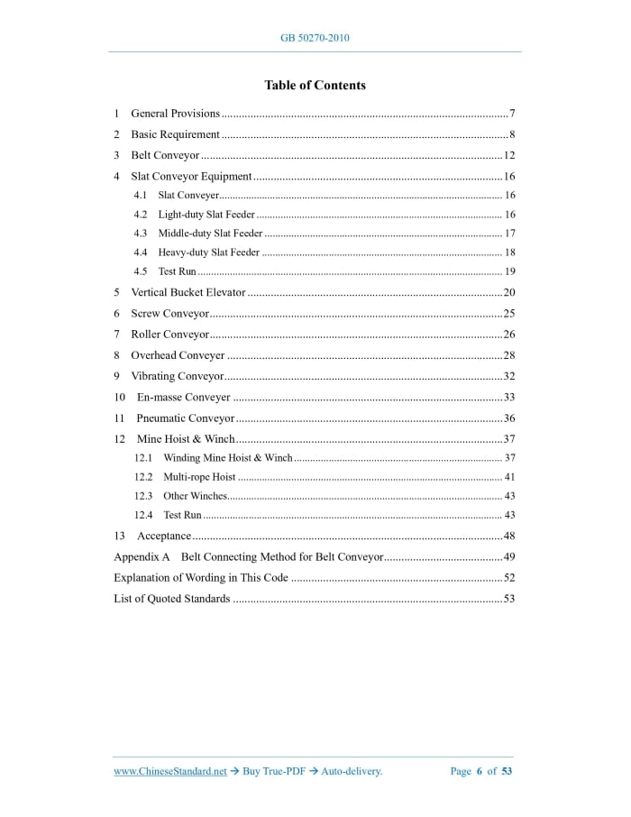 GB 50270-2010: Code for construction and acceptance of conveyor equipment installation engineering---This is an excerpt. Full copy of true-PDF in English version (including equations, symbols, images, flow-chart, tables, and figures etc.), auto-downloaded/delivered in 9 seconds, can be purchased online: https://www.ChineseStandard.net/PDF.aspx/GB50270-2010 GB NATIONAL STANDARD OF THE PEOPLE’S REPUBLIC OF CHINA UDC P GB 50270-2010 Code for Construction and Acceptance of Conveyor Equipment Installation Engineering Issued on: MAY 31, 2010 Implemented on: DECEMBER 1, 2010 Issued by. Ministry of Housing and Urban-Rural Construction of the People’s Republic of China; General Administration of Quality Supervision, Inspection and Quarantine of the People’s Republic of China. Table of Contents1 General Provisions... 7 2 Basic Requirement... 8 3 Belt Conveyor... 12 4 Slat Conveyor Equipment... 16 4.1 Slat Conveyer... 16 4.2 Light-duty Slat Feeder... 16 4.3 Middle-duty Slat Feeder... 17 4.4 Heavy-duty Slat Feeder... 18 4.5 Test Run... 19 5 Vertical Bucket Elevator... 20 6 Screw Conveyor... 25 7 Roller Conveyor... 26 8 Overhead Conveyer... 28 9 Vibrating Conveyor... 32 10 En-masse Conveyer... 33 11 Pneumatic Conveyor... 36 12 Mine Hoist & Winch... 37 12.1 Winding Mine Hoist & Winch... 37 12.2 Multi-rope Hoist... 41 12.3 Other Winches... 43 12.4 Test Run... 43 13 Acceptance... 48 Appendix A Belt Connecting Method for Belt Conveyor... 49 Explanation of Wording in This Code... 52 List of Quoted Standards... 531 General Provisions1.0.1 This code is developed in order to improve the construction level of the conveyor equipment installation engineering, promote the technological progress, ensure the engineering quality and safety and improve the economic performance. 1.0.2 This code applies to the construction and acceptance of the installation engineering of belt conveyor, slat conveyor equipment, vertical bucket elevator, screw conveyor, roller conveyor, overhead conveyor, vibrating conveyor, en-masse conveyer, pneumatic conveyor as well as mine hoist and winch. 1.0.3 In addition to this code, the construction and acceptance of conveyor equipment installation engineering still shall be in accordance with those specified in the current relevant national standards.4 Slat Conveyor Equipment4.1 Slat Conveyer 4.1.1 The assembling of frame shall meet the following provisions. 1 The deviation in the horizontal positions of the center line of frame and the longitudinal center line of conveyor shall not be larger than 2mm. 2 The straightness deviation of the center line of frame shall not be larger than 1/1000. 3 The difference in the length of these two diagonal lines of the cross section of frame shall not be larger than 1‰ of the average length of these two diagonal lines or 10mm. 4 The deviation in the verticality of the frame to the building floor shall not be larger than 2/1000. 4.1.2 The assembling of guide tracks shall meet the following provisions. 1 The deviation in the horizontal positions of longitudinal center line between guide tracks and the longitudinal center line of conveyor shall not be larger than 1mm. 2 The permissible deviation of the track gauge is ±2mm. 3 The joints of guide tracks shall be flat and smooth, their displacement towards right or left shall not be larger than 0.2mm, and the difference of their height shall not be larger than 1mm. 4 The gap at joint shall not be larger than 2mm. 5 The guide surface shall be smooth and its verticality deviation shall not be larger than 10/1000. 4.1.3 The assembling the tension apparatus of cast car type conveyor shall meet the following provisions. 1 The joint of the traveling rail with the trapped rail shall be flat and smooth, their offset towards right or left shall not be larger than 1mm, and the difference of height shall not be larger than 0.3mm. 2 The joint of the traveling guide track with the trapped guide track shall be flat and smooth, their displacement towards right or left shall not be larger than 0.2mm, and the difference of height shall not be larger than 1mm. 3 The sliding block of tension apparatus shall match with the slide track well, and their local gap shall not be larger than 1mm. 4.2 Light-duty Slat Feeder 4.2.1 The deviation in the longitudinal straightness of the main beam of frame shall not be larger than 1/1000; the difference in the diagonal lines of the frame shall not be larger than8 Overhead Conveyer8.0.1 The assembling of metal member shall meet the following provisions. 1 The verticality deviation of the hanger or upright column shall not be larger than 1/1000. 2 The levelness deviation of cantilever shall not be larger than 3/1000. 3 The deviation in the vertical and lateral levelness of the platform shall not be larger than 3/1000. 4 The offset of the longitudinal center line at the supporting point of track to the longitudinal center line of conveyor shall not be larger than 3mm. 8.0.2 When laying the track for universal overhead conveyors, the following provisions shall be met. 1 The straightness deviation of the track within the straight segment shall not be larger than 3mm within any length of 6000mm and shall not be larger than 7mm within the full length. 2 The distortion of track within the straight segment shall not be larger 1% of the orbit altitude within any length of 6000mm. 3 The distortion of vertical curved track shall not be larger than 2% of the orbit altitude. 4 The distortion of horizontal curved track shall not be larger than 1.5% of the orbit altitude. 5 The height difference and transverse misalignment of the seating face at joint of track shall not be larger than 0.5mm. 8.0.3 When laying the track for power and free overhead conveyors, the following provisions shall be met. 1 The straightness deviation of single straight track shall not be larger than 1.5mm within any length of 1000mm and shall not be larger than 5mm within the full length. 2 The deviation in the degree of symme