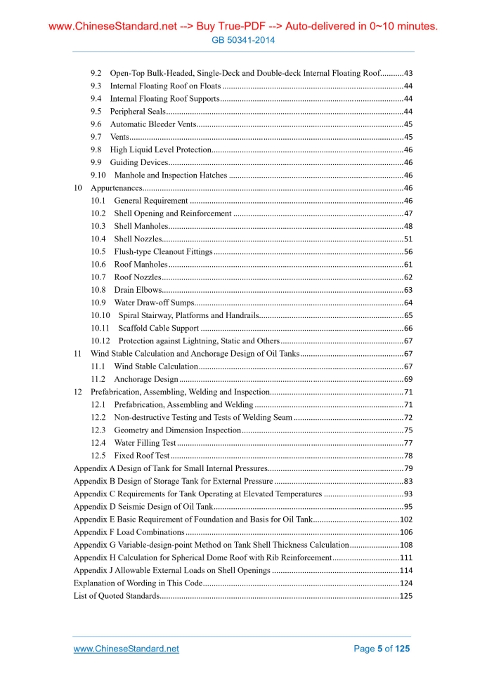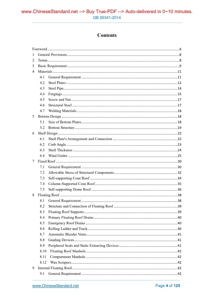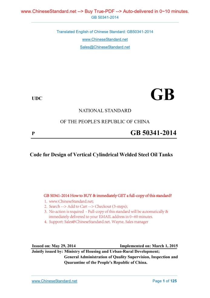 Similar standardsGB 50341-2014: Code for design of vertical cylindrical welded steel oil tanks---This is an excerpt. Full copy of true-PDF in English version (including equations, symbols, images, flow-chart, tables, and figures etc.), auto-downloaded/delivered in 9 seconds, can be purchased online: https://www.ChineseStandard.net/PDF.aspx/GB50341-2014UDC GB NATIONAL STANDARD OF THE PEOPLE'S REPUBLIC OF CHINA P GB 50341-2014 Code for Design of Vertical Cylindrical Welded Steel Oil Tanks Issued on: MAY 29, 2014 Implemented on: MARCH 1, 2015 Jointly issued by. Ministry of Housing and Urban-Rural Development; General Administration of Quality Supervision, Inspection and Quarantine of the People's Republic of China. 3.No action is required - Full-copy of this standard will be automatically & immediately delivered to your EMAIL address in 0~60 minutes. Table of ContentsForeword... 6 1 General Provisions... 8 2 Terms... 8 3 Basic Requirement... 9 4 Materials... 11 4.1 General Requirement... 11 4.2 Steel Plates... 12 4.3 Steel Pipe... 14 4.4 Forgings... 15 4.5 Screw and Nut... 17 4.6 Structural Steel... 17 4.7 Welding Materials... 18 5 Bottom Design... 18 5.1 Size of Bottom Plates... 18 5.2 Bottom Structure... 19 6 Shell Design... 22 6.1 Shell Plate's Arrangement and Connection... 22 6.2 Curb Angle... 23 6.3 Shell Thickness... 24 6.4 Wind Girder... 25 7 Fixed Roof... 30 7.1 General Requirement... 30 7.2 Allowable Stress of Structural Components... 32 7.3 Self-supporting Cone Roof... 34 7.4 Column-Supported Cone Roof... 35 7.5 Self-supporting Dome Roof... 36 8 Floating Roof... 38 8.1 General Requirement... 38 8.2 Structure and Connection of Floating Roof... 39 8.3 Floating Roof Supports... 39 8.4 Primary Floating Roof Drains... 40 8.5 Emergency Roof Drains... 40 8.6 Rolling Ladder and Track... 40 8.7 Automatic Bleeder Vents... 41 8.8 Guiding Devices... 41 8.9 Peripheral Seals and Static Extracting Devices... 41 8.10 Floating Roof Manhole... 42 8.11 Compartment Manhole... 42 8.12 Wax Scrapers... 42 9 Internal Floating Roof... 42 9.1 General Requirement... 42 9.2 Open-Top Bulk-Headed, Single-Deck and Double-deck Internal Floating Roof... 43 9.3 Internal Floating Roof on Floats... 44 9.4 Internal Floating Roof Supports... 44 9.5 Peripheral Seals... 44 9.6 Automatic Bleeder Vents... 45 9.7 Vents... 45 9.8 High Liquid Level Protection... 46 9.9 Guiding Devices... 46 9.10 Manhole and Inspection Hatches... 46 10 Appurtenances... 46 10.1 General Requirement... 46 10.2 Shell Opening and Reinforcement... 47 10.3 Shell Manholes... 48 10.4 Shell Nozzles... 51 10.5 Flush-type Cleanout Fittings... 56 10.6 Roof Manholes... 61 10.7 Roof Nozzles... 62 10.8 Drain Elbows... 63 10.9 Water Draw-off Sumps... 64 10.10 Spiral Stairway, Platforms and Handrails... 65 10.11 Scaffold Cable Support... 66 10.12 Protection against Lightning, Static and Others... 67 11 Wind Stable Calculation and Anchorage Design of Oil Tanks... 67 11.1 Wind Stable Calculation... 67 11.2 Anchorage Design... 69 12 Prefabrication, Assembling, Welding and Inspection... 71 12.1 Prefabrication, Assembling and Welding... 71 12.2 Non-destructive Testing and Tests of Welding Seam... 72 12.3 Geometry and Dimension Inspection... 75 12.4 Water Filling Test... 77 12.5 Fixed Roof Test... 78 Appendix A Design of Tank for Small Internal Pressures... 79 Appendix B Design of Storage Tank for External Pressure... 83 Appendix C Requirements for Tank Operating at Elevated Temperatures... 93 Appendix D Seismic Design of Oil Tank... 95 Appendix E Basic Requirement of Foundation and Basis for Oil Tank... 102 Appendix F Load Combinations... 106 Appendix G Variable-design-point Method on Tank Shell Thickness Calculation... 108 Appendix H Calculation for Spherical Dome Roof with Rib Reinforcement... 111 Appendix J Allowable External Loads on Shell Openings... 114 Explanation of Wording in This Code... 124 List of Quoted Standards... 125ForewordAccording to the requirements of Ministry of Housing and Urban-Rural Development in Notice on Printing Development and Revision Plan of National Engineering Construction Standards and Codes in 2011 (JIANBIAO [2011] No. 17), the code drafting group summarizes experience from GB 50341-2003 Code for Design of Vertical Cylindrical Welded Steel Oil Tanks, refers to relevant international and foreign advanced standards and revises this code based on extensive investigation and solicitation of opinions, discussion and modification. This code covers the design of vertical cylindrical welded steel oil tanks in following main technical aspects, including materials, bottom design, shell design, fixed roof, floating roof, internal floating roof, appurtenances, wind stable calculation and anchorage design of oil tank, tank for small internal pressures, design of storage tank for external pressure, requirements for tank operating at elevated temperatures, seismic design of oil tank, basic requirement of foundation and basis for oil tank, load combinations, variable-design-point method on tank shell thickness calculation, calculation for spherical dome roof with rib reinforcement, allowable external loads on shell openings. There have been some significant changes in this code in the following technical aspects. 1.Chapter 11 "Wind Stable Calculation and Anchorage Design of Oil Tank", Appendix B "Design of Storage Tank for External Pressure", Appendix F "Load Combinations", Appendix G "Variable-design-point Method on Tank Shell Thickness Calculation" and Appendix J "Allowable External Loads on Shell Opening" are added; 2.Design negative pressure of atmospheric pressure storage tank is revised; positive design pressure of fixed-roof oil tank is increased to 18kPa and the maximum design negative pressure is increased to 6.9kPa; 3.Allowable stress of materials is revised; materials of Q235-A.F, Q235-A, Q345-C, Q345-D, 15MnNbR, 07MnNiCrMoVDR are removed; 4.Minimum sketch bottom plate’s thickness and lap width limit between bottom plates are revise
