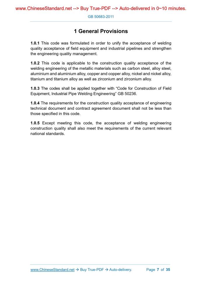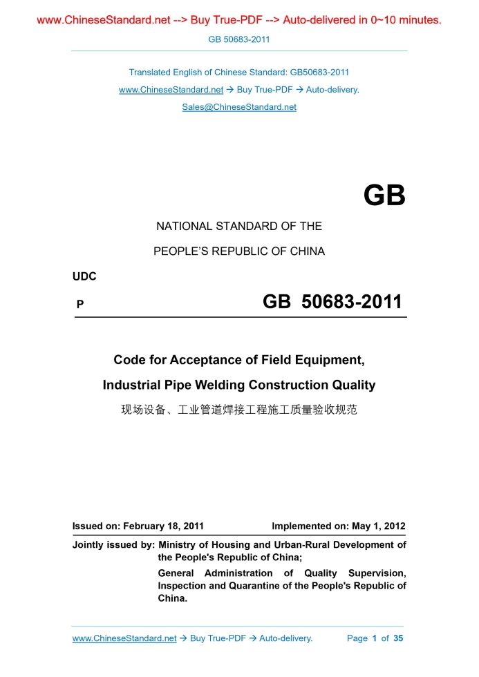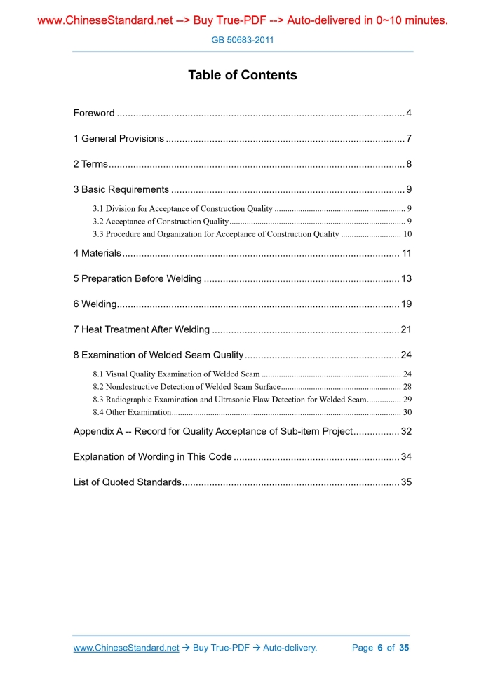 Similar standardsGB 50683-2011: Code for Acceptance of Field Equipment, Industrial Pipe Welding Construction Quality---This is an excerpt. Full copy of true-PDF in English version (including equations, symbols, images, flow-chart, tables, and figures etc.), auto-downloaded/delivered in 9 seconds, can be purchased online: https://www.ChineseStandard.net/PDF.aspx/GB50683-2011 NATIONAL STANDARD OF THE PEOPLE’S REPUBLIC OF CHINA UDC P GB 50683-2011 Code for Acceptance of Field Equipment, Industrial Pipe Welding Construction Quality Issued on. FEBRUARY 18, 2011 Implemented on. MAY 1, 2012 Jointly issued by. Ministry of Housing and Urban-Rural Development of the People's Republic of China; General Administration of Quality Supervision, Inspection and Quarantine of the People's Republic of China. National Standard of the People's Republic of China Code for Acceptance of Field Equipment, Industrial Pipe Welding Construction Quality Chief Development Department. China Association of Engineering Construction Standardization - Chemical Engineering Subcommittee Approval Department. Ministry of Housing and Urban-Rural Development of the People's Republic of China Implementation Date. May 1, 2012 2012 Beijing Announcement of the Ministry of Housing and Urban- Rural Development of the People's Republic of China No.939 Announcement on Publishing the National Standard of “Code for Acceptance of Field Equipment, Industrial Pipe Welding Construction Quality” “Code for Acceptance of Field Equipment, Industrial Pipe Welding Construction Quality” is hereby approved as national standard with the serial number as GB 50683-2011 and shall be implemented on May 1, 2012.Therein, Article (Item) 3.2.3 (4) is mandatory and must be enforced strictly. Authorized by the Standard Rating Research Institute of the Ministry of Housing and Urban-Rural Development of the People’s Republic of China, this code is published and distributed by China Planning Press. Ministry of Housing and Urban-Rural Development of the People's Republic of China February 18, 2011 Table of ContentsForeword... 4 1 General Provisions... 7 2 Terms... 8 3 Basic Requirements... 9 3.1 Division for Acceptance of Construction Quality... 9 3.2 Acceptance of Construction Quality... 9 3.3 Procedure and Organization for Acceptance of Construction Quality... 10 4 Materials... 11 5 Preparation Before Welding... 13 6 Welding... 19 7 Heat Treatment After Welding... 21 8 Examination of Welded Seam Quality... 24 8.1 Visual Quality Examination of Welded Seam... 24 8.2 Nondestructive Detection of Welded Seam Surface... 28 8.3 Radiographic Examination and Ultrasonic Flaw Detection for Welded Seam... 29 8.4 Other Examination... 30 Appendix A -- Record for Quality Acceptance of Sub-item Project... 32 Explanation of Wording in This Code... 34 List of Quoted Standards... 351 General Provisions1.0.1 This code was formulated in order to unify the acceptance of welding quality acceptance of field equipment and industrial pipelines and strengthen the engineering quality management. 1.0.2 This code is applicable to the construction quality acceptance of the welding engineering of the metallic materials such as carbon steel, alloy steel, aluminium and aluminium alloy, copper and copper alloy, nickel and nickel alloy, titanium and titanium alloy as well as zirconium and zirconium alloy. 1.0.3 The codes shall be applied together with “Code for Construction of Field Equipment, Industrial Pipe Welding Engineering” GB 50236. 1.0.4 The requirements for the construction quality acceptance of engineering technical document and contract agreement document shall not be less than those specified in this code. 1.0.5 Except meeting this code, the acceptance of welding engineering construction quality shall also meet the requirements of the current relevant national standards.2 Terms2.0.1 100 % examination The entire examination of a specific item in a specified examination batch 2.0.2 Random sampling examination The examination is conducted on a specific item by a certain proportion of random sampling. 2.0.3 Local sampling examination A specific part of examination is conducted for a specific item on every piece in a specific examination batch.3 Basic Requirements3.1 Division for Acceptance of Construction Quality 3.2 Acceptance of Construction Quality 3.2.1 The quality acceptance of sub-item project shall meet the following requirements. 3.2.3 Where the welding engineering does not meet the requirements of this code, it shall be processed according to the following requirements. 3.2.4 The weld engineering without acceptance qualification shall not be put into application 3.3 Procedure and Organization for Acceptance of Construction Quality 3.3.1 The sub-item project qualify acceptance shall be conducted based on the self-examination qualification of construction organization and quality acceptance records of sub-item project shall be filled by the project professional quality inspector of the construction organization. 4 Materials Dominant items 4.0.1 Before the application of base metal, the examination and acceptance shall be conducted according to the requirements of design document; the material, specification and appearance quality shall meet the requirements of the product standard and design document of base metal. The material marker shall be clear and complete and shall be traced back to the product quality certification. 4.0.2 Before the application of the welding materials, the visual quality, quality proof documents, external packing and packing mark shall be examined. 4.0.3 The welding material shall be baked according to the specification before application and shall be kept dry in application process and the baking conditions shall meet the requirements of welding materials directions and relevant technical document. 5 Preparation Before Welding I Dominant items 5.0.1 Where nondestructive testing is required for the groove face in the design document, magnetic