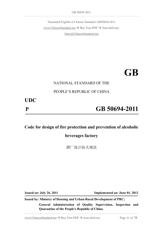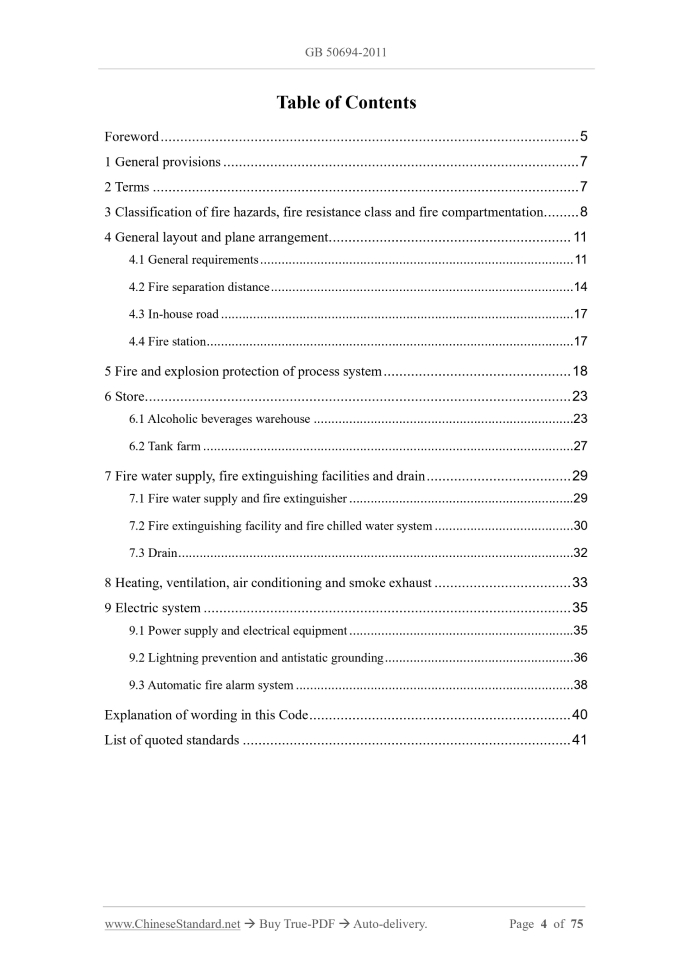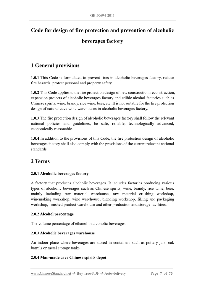 Similar standardsGB 50694-2011: Code for design of fire protection and prevention of alcoholic beverages factory---This is an excerpt. Full copy of true-PDF in English version (including equations, symbols, images, flow-chart, tables, and figures etc.), auto-downloaded/delivered in 9 seconds, can be purchased online: https://www.ChineseStandard.net/PDF.aspx/GB50694-2011GB NATIONAL STANDARD OF THE PEOPLE’S REPUBLIC OF CHINA UDC P GB 50694-2011 Code for design of fire protection and prevention of alcoholic beverages factory Issued on: JULY 26, 2011 Implemented on: JUNE 01, 2012 Issued by. Ministry of Housing and Urban-Rural Development of PRC; General Administration of Quality Supervision, Inspection and Quarantine of the People's Republic of China. Table of ContentsForeword... 5 1 General provisions... 7 2 Terms... 7 3 Classification of fire hazards, fire resistance class and fire compartmentation... 8 4 General layout and plane arrangement... 11 4.1 General requirements... 11 4.2 Fire separation distance... 14 4.3 In-house road... 17 4.4 Fire station... 17 5 Fire and explosion protection of process system... 18 6 Store... 23 6.1 Alcoholic beverages warehouse... 23 6.2 Tank farm... 27 7 Fire water supply, fire extinguishing facilities and drain... 29 7.1 Fire water supply and fire extinguisher... 29 7.2 Fire extinguishing facility and fire chilled water system... 30 7.3 Drain... 32 8 Heating, ventilation, air conditioning and smoke exhaust... 33 9 Electric system... 35 9.1 Power supply and electrical equipment... 35 9.2 Lightning prevention and antistatic grounding... 36 9.3 Automatic fire alarm system... 38 Explanation of wording in this Code... 40 List of quoted standards... 41 Code for design of fire protection and prevention of alcoholic beverages factory1 General provisions1.0.1 This Code is formulated to prevent fires in alcoholic beverages factory, reduce fire hazards, protect personal and property safety. 1.0.2 This Code applies to the fire protection design of new construction, reconstruction, expansion projects of alcoholic beverages factory and edible alcohol factories such as Chinese spirits, wine, brandy, rice wine, beer, etc. It is not suitable for the fire protection design of natural cave wine warehouses in alcoholic beverages factory. 1.0.3 The fire protection design of alcoholic beverages factory shall follow the relevant national policies and guidelines, be safe, reliable, technologically advanced, economically reasonable. 1.0.4 In addition to the provisions of this Code, the fire protection design of alcoholic beverages factory shall also comply with the provisions of the current relevant national standards.2 Terms2.0.1 Alcoholic beverages factory A factory that produces alcoholic beverages. It includes factories producing various types of alcoholic beverages such as Chinese spirits, wine, brandy, rice wine, beer, mainly including raw material warehouse, raw material crushing workshop, winemaking workshop, wine warehouse, blending workshop, filling and packaging workshop, finished product warehouse and other production and storage facilities. 2.0.2 Alcohol percentage The volume percentage of ethanol in alcoholic beverages. 2.0.3 Alcoholic beverages warehouse An indoor place where beverages are stored in containers such as pottery jars, oak barrels or metal storage tanks. 2.0.4 Man-made cave Chinese spirits depot 3.0.3 Unless otherwise specified in this Code, the fire resistance level, allowable number of floors and maximum allowable building area of each fire compartment of the factory building and warehouse shall comply with the relevant provisions of the current national standard "Code for fire protection design of buildings" GB 50016. 3.0.4 The production rooms for blending, filling, packaging, temporary storage of finished products, etc. in the joint factory building for the production of Chinese spirits and brandy shall be separated from other parts by fire separation measures; when the process conditions permit, they shall be separated by fire walls. When an automatic fire extinguishing system and an automatic fire alarm system are installed in the production joint plant, the maximum allowable building area of each fire compartment can be increased to 2.5 times the area specified in the current national standard "Code for fire protection design of buildings" GB 50016.4 General layout and plane arrangement4.1 General requirements 4.1.1 The site selection of the alcoholic beverages factory shall comply with the requirements of urban and rural planning; it should be located at the edge of the planning area or in a relatively independent safe area. The alcoholic beverages factory shall reasonably determine the layout of different functional areas and set up fire trucks and fire water sources, according to its production process, fire hazard and functional requirements, combined with terrain, meteorological and other conditions. 4.1.2 The Chinese spirits storage tank farm and edible alcohol storage tank farm should be located in a relatively independent safe area of the factory area; it should be located on the upwind side of the factory area's minimum frequency wind direction throughout the year. The site of the man-made cave Chinese spirits depot shall have good geological conditions; it shall not be selected in areas with geological disaster risks. 4.1.3 Chinese spirits warehouse, man-made cave Chinese spirits depot, edible alcohol warehouse, Chinese spirits tank farm, edible alcohol storage tank farm, brandy aging warehouse shall be arranged separately from other production areas and office, scientific research, living areas. 4.1.4 Except for man-made cave Chinese spirits depot and wine aging warehouse, other category A and category B production and storage places of the alcoholic beverages factory shall not be set up underground or semi-underground. 4.1.5 It is strictly prohibited to set up employee dormitories in the factory building; meanwhile it shall comply