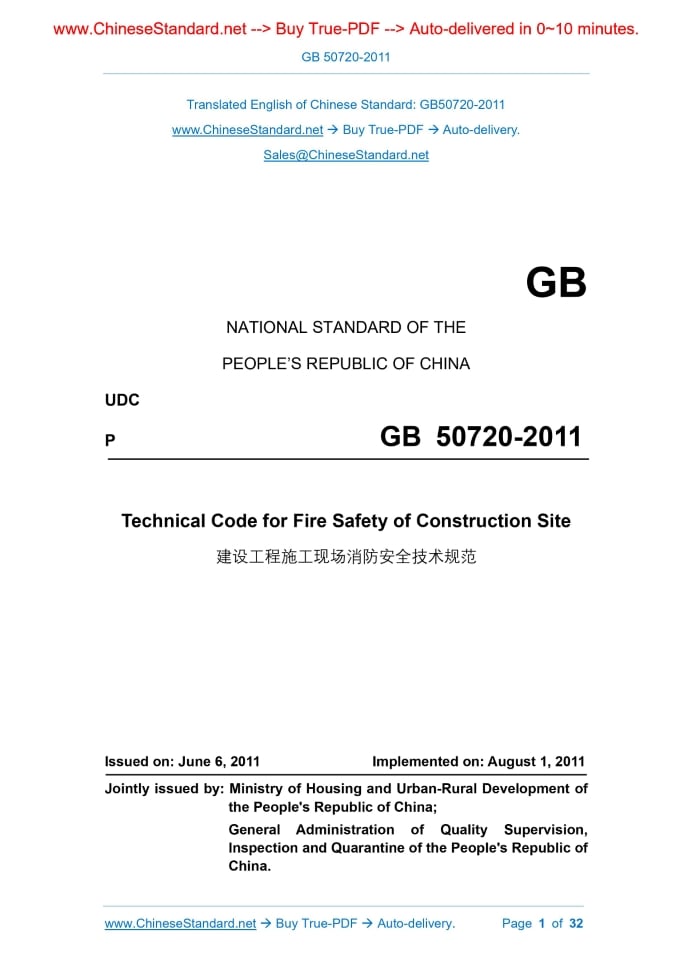GB 50720-2011: Technical Code for Fire Safety of Construction Site Delivery: 9 seconds. True-PDF full-copy in English & invoice will be downloaded + auto-delivered via email. See step-by-step procedure Status: Valid