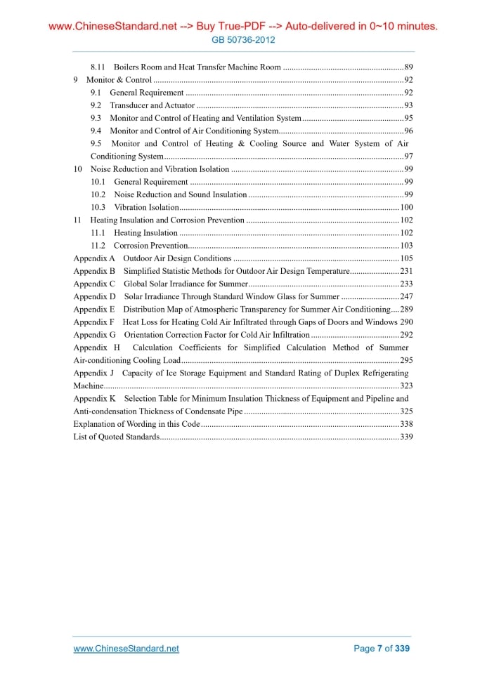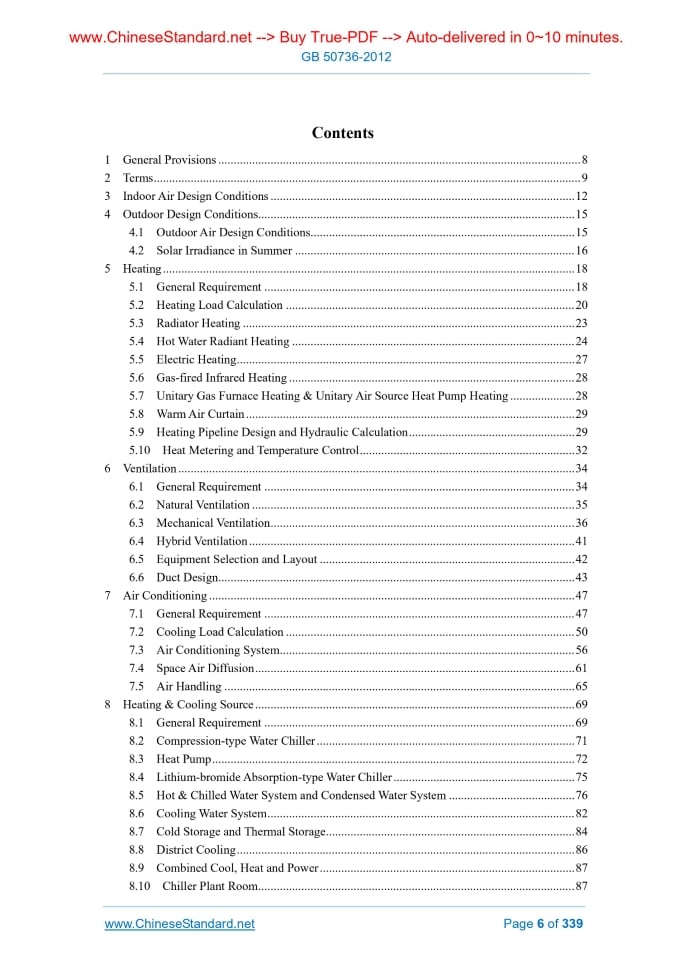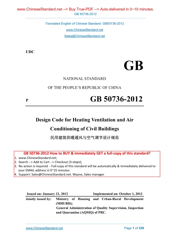 Similar standardsGB 50736-2012: Design code for heating ventilation and air conditioning of civil buildings---This is an excerpt. Full copy of true-PDF in English version (including equations, symbols, images, flow-chart, tables, and figures etc.), auto-downloaded/delivered in 9 seconds, can be purchased online: https://www.ChineseStandard.net/PDF.aspx/GB50736-2012UDC GB NATIONAL STANDARD P GB 50736-2012 Design Code for Heating Ventilation and Air Conditioning of Civil Buildings Issued on. JANUARY 21, 2012 Implemented on. OCTOBER 1, 2012 Jointly issued by. Ministry of Housing and Urban-Rural Development (MHURD); General Administration of Quality Supervision, Inspection and Quarantine (AQSIQ) of PRC. NATIONAL STANDARD Design Code for Heating Ventilation and Air Conditioning of Civil Buildings Chief Development Department. Ministry of Housing and Urban-Rural Development of the People's Republic of China Approval Department. Ministry of Housing and Urban-Rural Development of the People's Republic of China Implementation Date. October 1, 2012 China Architecture and Building Press 2012 Beijing Announcement of the Ministry of Housing and Urban-Rural Development of the People's Republic of China No. 1270 Table of Contents1 General Provisions... 8 2 Terms... 9 3 Indoor Air Design Conditions... 12 4 Outdoor Design Conditions... 15 5 Heating... 18 6 Ventilation... 34 7 Air Conditioning... 47 8 Heating & Cooling Source... 69 9 Monitor & Control... 92 10 Noise Reduction and Vibration Isolation... 99 11 Heating Insulation and Corrosion Prevention... 102 Appendix A Outdoor Air Design Conditions... 105 Appendix B Simplified Statistic Methods for Outdoor Air Design Temperature... 231 Appendix C Global Solar Irradiance for Summer... 233 Appendix D Solar Irradiance Through Standard Window Glass for Summer... 247 Appendix E Distribution Map of Atmospheric Transparency for Summer Air Conditioning... 289 Appendix F Heat Loss for Heating Cold Air Infiltrated through Gaps of Doors and Windows 290 Appendix G Orientation Correction Factor for Cold Air Infiltration... 292 Appendix H Calculation Coefficients for Simplified Calculation Method of Summer Air-conditioning Cooling Load... 295 Appendix J Capacity of Ice Storage Equipment and Standard Rating of Duplex Refrigerating Machine... 323 Appendix K Selection Table for Minimum Insulation Thickness of Equipment and Pipeline and Anti-condensation Thickness of Condensate Pipe... 325 Explanation of Wording in this Code... 338 List of Quoted Standards... 3391 General Provisions1.0.1 This code is formulated with a view to implementing the national technical and economic policies, rationally using resources and saving energy, protecting environment, promoting application of advanced technologies, and ensuring healthy and comfortable working and living environment during design for heating, ventilation and air conditioning of civil buildings. 1.0.2 This code is applicable to the design for heating, ventilation and air conditioning of constructed, renovated and extended civil buildings, not applicable to the design for the buildings and temporary buildings with special purposes or special purification and protection requirements. 1.0.3 Heating, ventilation and air conditioning design scheme shall be determined through economic and technical comparison according to service, function, application requirements, cooling/heating load features, environmental conditions and energy status of buildings, in combination with the national policies and guidelines with regard to safety, energy saving, environmental protection and hygiene. New technology, new process, new equipment and new material shall be adopted in priority during design. 1.0.4 Safety protection measures must be taken for the equipment and pipelines that may endanger human body during design of heating, ventilation and air conditioning. 1.0.5 Spaces necessary for installation, operation and maintenance of equipment, pipelines and accessories shall be provided during design of heating, ventilation and air conditioning system or holes for installation and maintenance shall be reserved during building design. Transportation and hoisting conditions shall be provided or transport channels and hoisting facilities shall be arranged for large equipment and pipelines. 1.0.6 During design of heating, ventilation and air conditioning, shockproof or other protective measures shall be taken into consideration according to the current national seismic fortification grade requirements. 1.0.7 Construction, debugging and acceptance requirements shall be taken into consideration for the design of heating, ventilation and air conditioning. Where there are special requirements in the design for construction, debugging and acceptance, they shall be stated in the design document. 1.0.8 Design for heating, ventilation and air conditioning of civil buildings shall not only meet the requirements of this code but also comply with those stipulated in the current relevant ones of the nation.2 Terms2.0.1 Predicted mean vote (PMV) PMV is one comprehensive evaluation index determined basing on the fundamental equation of thermal balance of human body and the grade of subjective thermal sensation in physiological psychology, in consideration of many relevant factors of the thermal comfort of human body. PMV means the average index number of votes of groups for 7 (+3~3) thermal sensation grades. 2.0.4 Central heating The heating system, also called central heating system, for supplying heat to several heat users from heating source, where heating source and heat sink device are arranged respectively and heating medium pipelines are connected. 2.0.5 Standby heating The heating arranged for keeping the required minimum room temperature in the buildings during non-operating time or service interruption time. 2.0.6 Capillary mat radiant system A kind of hot water radiant heating and cooling system whose radiant terminal is made of small pipe, machined i