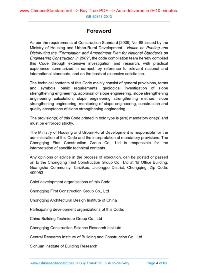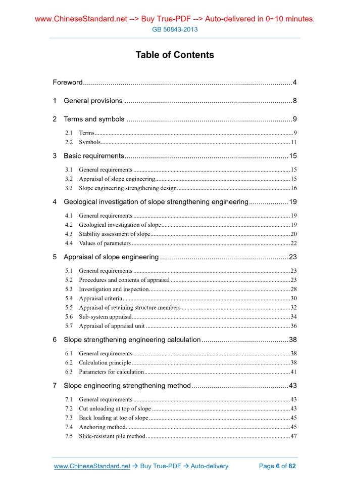 Similar standardsGB 50843-2013: Technical code for appraisal and reinforcement of building slope---This is an excerpt. Full copy of true-PDF in English version (including equations, symbols, images, flow-chart, tables, and figures etc.), auto-downloaded/delivered in 9 seconds, can be purchased online: https://www.ChineseStandard.net/PDF.aspx/GB50843-2013GB NATIONAL STANDARD OF THE PEOPLE’S REPUBLIC OF CHINA UDC Technical code for appraisal and reinforcement of building slope Issued on. DECEMBER 25, 2012 Implemented on. MAY 1, 2013 Jointly issued by. Ministry of Housing and Urban-Rural Development of the People’s Republic of China; General Administration of Quality Supervision, Inspection and Quarantine of the People’s Republic of China. NATIONAL STANDARD OF THE PEOPLE’S REPUBLIC OF CHINA Technical code for appraisal and reinforcement of building slope Chief development department. Chongqing Urban and Rural Construction Committee Approval department. Ministry of Housing and Urban-Rural Development of the People’s Republic of China Implementation date. May 1, 2013 2012 Beijing Ministry of Housing and Urban-Rural Development of the People’s Republic of China Table of ContentsForeword... 4 1 General provisions... 8 2 Terms and symbols... 9 3 Basic requirements... 15 4 Geological investigation of slope strengthening engineering... 19 5 Appraisal of slope engineering... 23 6 Slope strengthening engineering calculation... 38 7 Slope engineering strengthening method... 43 8 Slope strengthening engineering... 54 9 Monitoring of slope engineering... 61 10 Construction and quality acceptance of slope strengthening engineering ... 66 Annex A Slope stability calculation method with effective resistance of the original retaining structure... 70 Annex B Safety appraisal of retaining structure subgrade and foundation... 75 Annex C Stability appraisal of appraisal unit... 79 Explanation of wording in this Code... 81 List of quoted standards... 821 General provisions1.0.1 This Code is formulated with a view of implementing the national technical and economic policies, and achieving advanced technology, safety reliability, economic rationality, quality assurance and environmental protection in the appraisal and strengthening of existing building slope engineering. 1.0.2 This Code is applicable to the appraisal and strengthening of existing building slope engineering and rock excavation slope, with a rock slope height of 30m and below and a soil slope height of 15m and below. The slope strengthening engineering exceeding the above heights and that with complex geological and environmental conditions shall, in addition to the conformity with this Code, be specially designed. In addition, effective and reliable measures for strengthening shall be taken accordingly. 1.0.3 Not only the requirements stipulated in this Code, but also those stipulated in the corresponding current national professional standards shall be complied with, during the appraisal and strengthening of building slope engineering in soft soil, collapsible loess, frozen soil, expansive soil and other special geotechnical and erosive environments, and post-disaster building slope engineering in seismic areas. 1.0.4 Not only the requirements stipulated in this Code, but also those stipulated in the corresponding current national standards shall be complied with, during the appraisal and strengthening of existing building slope engineering.2 Terms and symbols2.1 Terms 2.1.1 Building slope Artificial slopes formed on or near the construction sites or due to excavation or filling of building engineering and municipal engineering; natural slopes that affect the safety or stability of buildings, hereinafter referred to as slope in this Code. 2.1.2 Existing building slope engineering The whole or part of the completed building slope engineering. 2.1.7 Target working life Expected years of use of the existing building slope engineering. 2.1.8 Inspection Checking, surveying, testing and verification activities for the assessment of construction quality or performance. 2.1.10 Sub-system Basic appraisal unit in the appraisal unit, subdivided in accordance with different composing forms of the retaining structure. 2.1.11 Member Basic stress unit that can be further subdivided in the retaining structure. 2.2 Symbols 2.2.5 Appraisal As, Bs, Cs - Normal usability grade of the sub-systems; Ass, Bss, Css - Normal usability grade of the appraisal units; Asu, Bsu, Csu, Dsu - Safety grade of the appraisal units; Au, Bu, Cu, Du - Safety grade of the sub-systems; as, bs, cs - Normal usability grade of the members; au, bu, cu, du - Safety grade of the members.3 Basic requirements3.1 General requirements 3.1.1 The design of the strengthening of existing building slope engineering shall adopt the method of information design, and shall meet the relevant requirements of the current national standard GB 50330 Technical code for building slope engineering. 3.2 Appraisal of slope engineering 3.2.1 The appraisal of slope engineering is applicable to the appraisal on safety, normal usability, durability and construction quality of the building slope engineering. 3.3 Slope engineering strengthening design 3.3.1 The slope engineering in the following cases shall be conducted with strengthening design. 3.3.2 During the design of slope strengthening engineering, the following information shall be obtained.4 Geological investigation of slope strengthening engineering4.1 General requirements 4.1.1 Before strengthening, the existing building slope engineering shall be conducted with geological investigation of slope strengthening engineering. 4.1.4 The existing slope strengthening engineering may be directly conducted with detailed stages of investigation. 4.1.5 The geological investigation report of the slope strengthening engineering shall include the following contents. 4.2 Geological investigation of slope 4.2.2 In addition to be consistent with the relevant requir