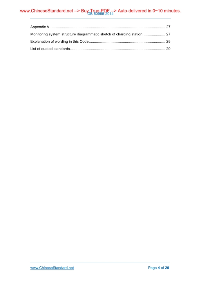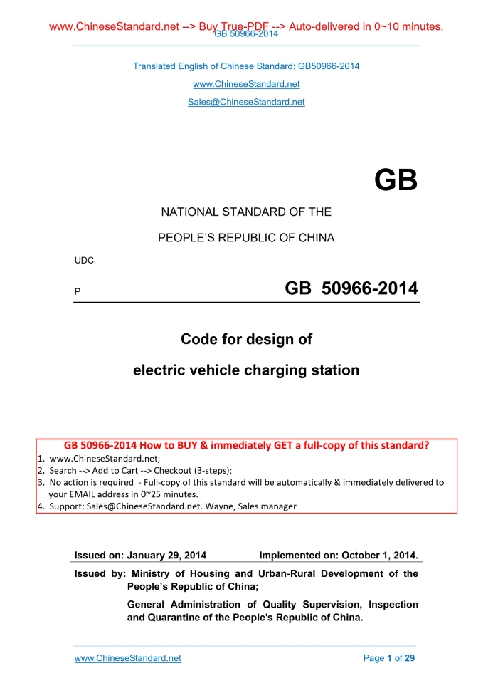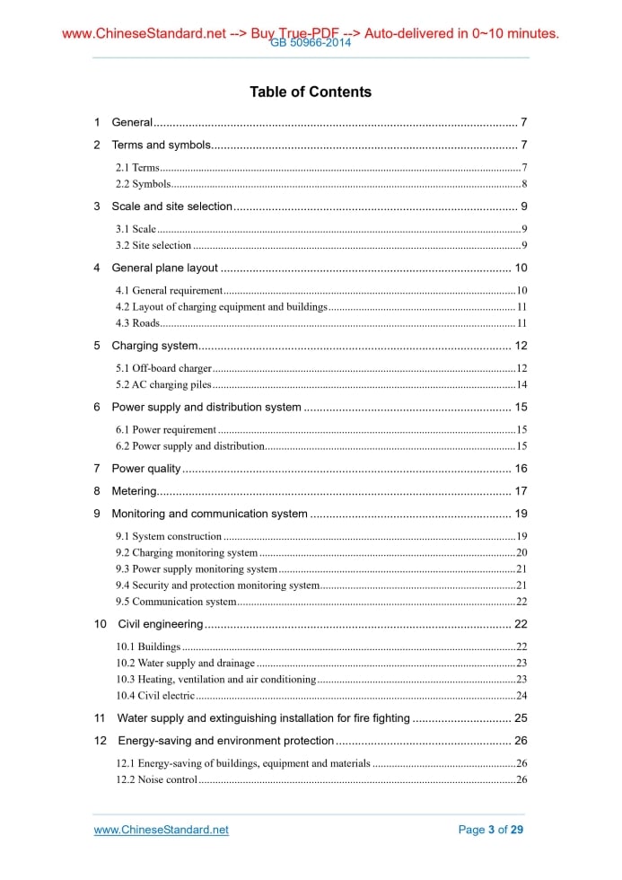 Similar standardsGB 50966-2014: Code for design of electric vehicle charging station---This is an excerpt. Full copy of true-PDF in English version (including equations, symbols, images, flow-chart, tables, and figures etc.), auto-downloaded/delivered in 9 seconds, can be purchased online: https://www.ChineseStandard.net/PDF.aspx/GB50966-2014GB NATIONAL STANDARD OF THE PEOPLE’S REPUBLIC OF CHINA UDC P GB 50966-2014 Code for design of electric vehicle charging station Issued by. Ministry of Housing and Urban-Rural Development of the People’s Republic of China; General Administration of Quality Supervision, Inspection and Quarantine of the People's Republic of China. Issued on: JANUARY 29, 2014 Implemented on: OCTOBER 1, 2014. Table of Contents1 General... 7 2 Terms and symbols... 7 2.1 Terms... 7 2.2 Symbols... 8 3 Scale and site selection... 9 3.1 Scale... 9 3.2 Site selection... 9 4 General plane layout... 10 4.1 General requirement... 10 4.2 Layout of charging equipment and buildings... 11 4.3 Roads... 11 5 Charging system... 12 5.1 Off-board charger... 12 5.2 AC charging piles... 14 6 Power supply and distribution system... 15 6.1 Power requirement... 15 6.2 Power supply and distribution... 15 7 Power quality... 16 8 Metering... 17 9 Monitoring and communication system... 19 9.1 System construction... 19 9.2 Charging monitoring system... 20 9.3 Power supply monitoring system... 21 9.4 Security and protection monitoring system... 21 9.5 Communication system... 22 10 Civil engineering... 22 10.1 Buildings... 22 10.2 Water supply and drainage... 23 10.3 Heating, ventilation and air conditioning... 23 10.4 Civil electric... 24 11 Water supply and extinguishing installation for fire fighting... 25 12 Energy-saving and environment protection... 26 12.1 Energy-saving of buildings, equipment and materials... 26 12.2 Noise control... 26 Appendix A... 27 Monitoring system structure diagrammatic sketch of charging station... 27 Explanation of wording in this Code... 28 List of quoted standards... 29ForewordThis Code is based on the requirements of Announcement on Issuing < 2010 Code for the Formulation and Revision Plan of the Engineering Construction Standard > (JB (2010) No.43) issued by the Ministry of Housing and Urban-Rural Development of the People’s Republic of China. It was jointly formulated by State Grid Corporation of China and China Electricity Council, as well as the relevant organizations. During the formulation of this Code, the drafting team conducts in-depth investigation, seriously summarizes the experience of EV charging station in China, draws lessons from the existing standards of related enterprises in China and relevant standards of foreign developed industrial countries, takes advices extensively, discusses for many times, and finally reviews and finalizes. This Code is divided into 12 chapters and 1 appendix, which mainly includes the following technical contents. General provisions, terms and symbols, scale and site selection, general plane layout, charging system, power supply and distribution system, power quality, metering, monitoring and communication system, civil engineering, water supply and extinguishing installation for fire-fighting, energy saving and environment protection, etc. The articles in bold-face marked in this Code are mandatory, which shall be executed strictly. Ministry of Housing and Urban-Rural Development of the People’s Republic of China is responsible for the management and interpretation of the mandatory provisions; the China Electricity Council is responsible for daily management; and the State Grid Corporation of China is responsible for the interpretation of the specific technical contents. If the specification needs to be revised and supplemented during the enforcement, please mail the opinions and suggestions to the State Grid Corporation of China (Address. No.86, West Chang’an Road, Xicheng District, Beijing, Postal code. 100031) for the reference of future revision. Chief drafting organizations, participating drafting organizations, main drafters and main examiners of this Code. Chief drafting organizations. State Grid Corporation of China China Electricity Council Participating drafting organizations. Beijing Economic and Technological Institute of Electric Power Code for design of electric vehicle charging station1 General1.0.1 In order to make the design of electric vehicle charging stations implement the relevant national policies and guidelines, unify the technical requirements, and to be safe and reliable, technologically advanced and economic reasonable, hereby this Code is formulated. 1.0.2 This specification applies to the design of electric vehicle charging stations using vehicle charging mode. 1.0.3 The design of electric vehicle charging stations shall comply with the following principles. 1 Implementing national laws and regulations, and complying with the requirements of regional and national economy and social development planning. 2 Coordinating with the local regional master plan and the town planning. 3 Complying with the requirements of fire safety, electrical safety and environmental protection. 4 Actively and steadily using new technology, new equipment and new materials to promote technological innovation. 1.0.4 In addition to complying with this Code, the design of the electric vehicle charging stations shall comply with the provisions of existing national standards.2 Terms and symbols2.1 Terms 2.1.1 Vehicle charging mode The manner of directly connecting the electric vehicle to the charging equipment through connection set for charging. 2.1.2 EV charging station Sites where provide electric energy to electric vehicle using vehicle charging mode shall include the charging equipment for 3 sets and more electric vehicles (at least one off-board charger), related power supply units, monitoring equipment and other support equipment. Hereinafter referred to as charging station. 2.1.3 Charging system System t