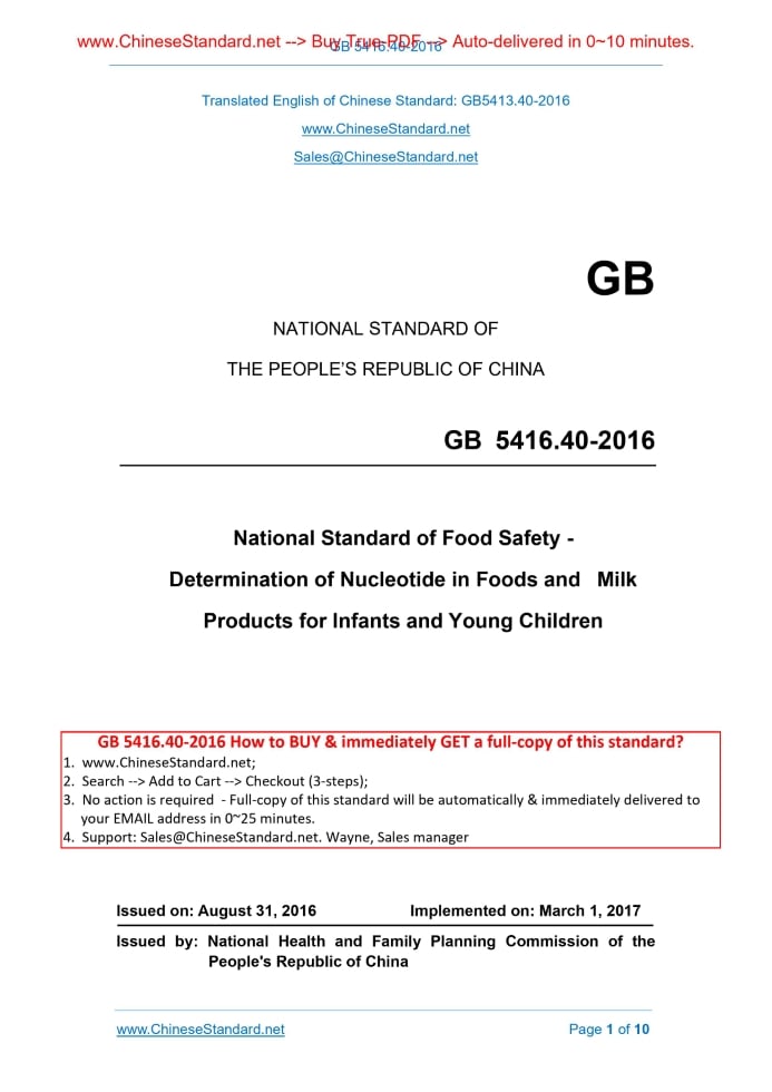 GB 5413.40-2016: National Standard of Food Safety - Determination of Nucleotide in Foods and Milk Products for Infants and Young Children Delivery: 9 seconds. True-PDF full-copy in English & invoice will be downloaded + auto-delivered via email. See step-by-step procedure Status: Valid