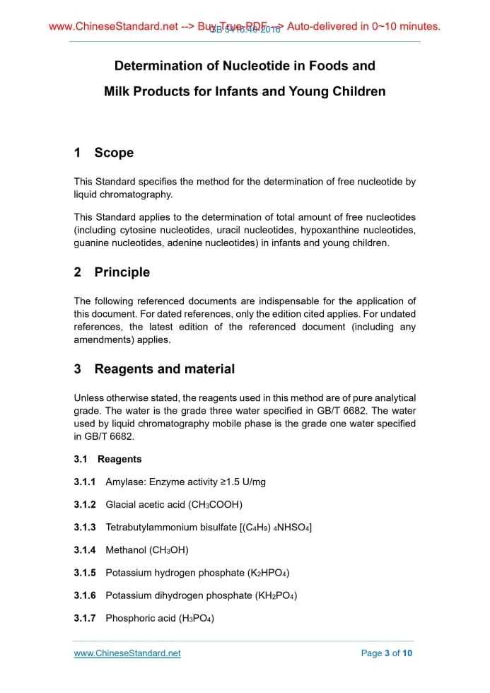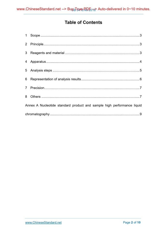 Similar standardsGB 5413.40-2016: National Standard of Food Safety - Determination of Nucleotide in Foods and Milk Products for Infants and Young Children---This is an excerpt. Full copy of true-PDF in English version (including equations, symbols, images, flow-chart, tables, and figures etc.), auto-downloaded/delivered in 9 seconds, can be purchased online: https://www.ChineseStandard.net/PDF.aspx/GB5413.40-2016 GB NATIONAL STANDARD OF THE PEOPLE’S REPUBLIC OF CHINA National Standard of Food Safety - Determination of Nucleotide in Foods and Milk Products for Infants and Young Children Issued on. AUGUST 31, 2016 Implemented on. MARCH 1, 2017 Issued by. National Health and Family Planning Commission of the People's Republic of China Table of Contents1 Scope... 3 2 Principle... 3 3 Reagents and material... 3 4 Apparatus... 4 5 Analysis steps... 5 6 Representation of analysis results... 6 7 Precision... 7 8 Others... 7 Annex A Nucleotide standard product and sample high performance liquid chromatography... 9 Determination of Nucleotide in Foods and Milk Products for Infants and Young Children1 ScopeThis Standard specifies the method for the determination of free nucleotide by liquid chromatography. This Standard applies to the determination of total amount of free nucleotides (including cytosine nucleotides, uracil nucleotides, hypoxanthine nucleotides, guanine nucleotides, adenine nucleotides) in infants and young children.2 PrincipleThe following referenced documents are indispensable for the application of this document.3 Reagents and materialUnless otherwise stated, the reagents used in this method are of pure analytical grade. 3.1 Reagents 3.1.1 Amylase. Enzyme activity ≥1.5 U/mg 3.1.2 Glacial acetic acid (CH3COOH) 3.1.7 Phosphoric acid (H3PO4) 3.2 Preparation of reagents 3.2.1 Acetic acid solution (100 mL/L). PIPET 10 mL of glacial acetic acid; ADD water to a volume of 100 mL. 3.3 Nucleotide standard products 3.3.1 Cytidine (CMP) (C9H14N3O8P). purity ≥ 99% 3.3.2 Adenine nucleotide (AMP) (C10H14N5O7P). purity ≥ 99% 3.3.3 Uracil (UMP) (C9H13N2O9P). purity ≥ 99% 3.3.4 Guanine nucleotide (GMP) (C10H14N5O8P). purity ≥ 99% 3.3.5 Hypoxanthine (IMP) (C10H13N4O8P). purity ≥ 99% 3.4 Preparation of standard solution Nucleotide standard mixture (should be configured that day). respectively WEIGH 10 mg of nucleotide standard products CMP, AMP, UMP, 5 mg of GMP and IMP (to the nearest of 0.1 mg); USE ultra-pure water to dissolve into the same 100 mL volumetric flask; USE water to set the volume to 100 mL.4 Apparatus4.1 High performance liquid chromatograph. equipped with UV detector or diode array detector 4.4 Constant temperature incubator. ±2°C5 Analysis steps5.1 Sample preparation 5.1.1 Sample pre-treatment 5.1.2 Preparation of test solution USE acid solution to adjust pH of sample solution to 4.1.MOVE it to a 50 mL measuring flask. SET volume. USE filter paper to filter. USE 0.45 μm micro- membrane to filter the obtained filtrate for use. 5.2 Reference chromatographic conditions 5.2.1 Mobile phase. phosphate buffer + methanol = 1000 + 40 5.2.2 Chromatographic column. C18-T reversed-phase column (250 mm × 4.6 mm, 5 μm) or equivalent column 5.2.3 Flow rate. 1 mL/min 5.2.4 Wavelength. 254 nm 5.3 Standard curve drawing Respectively PIPET 2 mL, 4 mL, 6 mL, 8 mL, 10 mL of standard mixed solution. ADD ultra-pure water to set the volume to 50 mL to prepare nucleotide series of standard working fluid, as shown in Table 1. 5.4 Determination of sample solution Inject the prepared sample solution into the high performance liquid chromatography. Determine the corresponding peak area or peak height.6 Representation of analysis results6.1 Results calculation Calculate the content of the free nucleotides in the sample Xi (CMP, UMP, GMP, IMP, AMP) according to equation (1). 6.2 Results representation The arithmetic results are expressed as the arithmetic mean of two independent determinations obtained under repeatability conditions. The results shall be reserved for two digits after the decimal point.7 PrecisionThe absolute difference between the two independent determinations obtained under repeatability shall not exceed 10% of the arithmetic mean.8 OthersThe high performance liquid chromatography ultraviolet standard and the sample nucleotide chromatogram are shown in Annex A.Annex ANucleotide standard product and sample high performance liquid chromatography A.1 Nucleotide standard chromatogram The nucleotide standard chromatogram is shown as Figure A.1. A.2 Sample chromatogram The sample chromatogram is shown as Figure A.2. ......Source: Above contents are excerpted from the full-copy PDF -- translated/reviewed by: www.ChineseStandard.net / Wayne Zheng et al. Tips & Frequently Asked Questions:Question 1: How long will the true-PDF of English version of GB 5413.40-2016 be delivered?Answer: The full copy PDF of English version of GB 5413.40-2016 can be downloaded in 9 seconds, and it will also be emailed to you in 9 seconds (double mechanisms to ensure the delivery reliably), with PDF-invoice.Question 2: Can I share the purchased PDF of GB 5413.40-2016_English with my colleagues?Answer: Yes. The purchased PDF of GB 5413.40-2016_English will be deemed to be sold to your employer/organization who actually paid for it, including your colleagues and your employer's intranet.Question 3: Does the price include tax/VAT?Answer: Yes. Our tax invoice, downloaded/delivered in 9 seconds, includes all tax/VAT and complies with 100+ countries' tax regulations (tax exempted in 100+ countries) -- See Avoidance of Double Taxation Agreements (DTAs): List of DTAs signed between Singapore and 100+ countriesQuestion 4: Do you accept my currency other than USD?Answer: Yes. www.ChineseStandard.us -- GB 5413.40-2016 -- Click this link and select your country/currency to pay, the exact amount in your currency will be printed on the invoice. Full PDF will also be downloaded/emailed in 9 seconds.How to buy and downlo