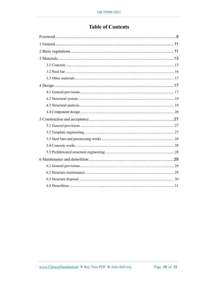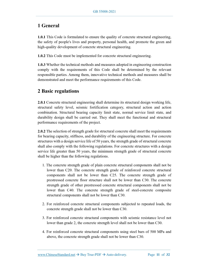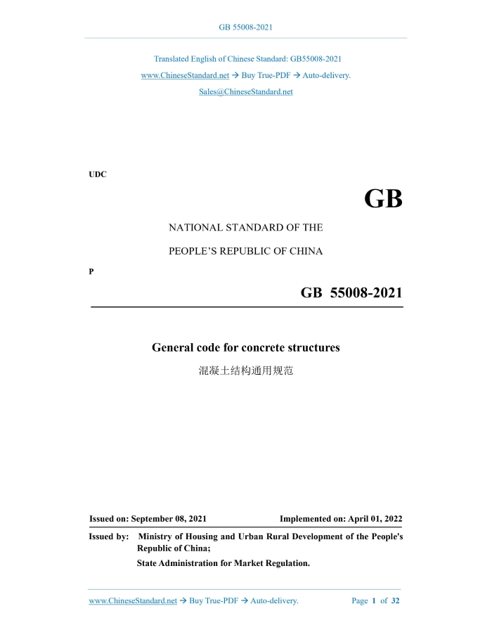 Similar standardsGB 55008-2021: Code for design of concrete structures---This is an excerpt. Full copy of true-PDF in English version (including equations, symbols, images, flow-chart, tables, and figures etc.), auto-downloaded/delivered in 9 seconds, can be purchased online: https://www.ChineseStandard.net/PDF.aspx/GB55008-2021UDC GB NATIONAL STANDARD OF THE PEOPLE’S REPUBLIC OF CHINA General code for concrete structures Issued on. SEPTEMBER 08, 2021 Implemented on. APRIL 01, 2022 Issued by. Ministry of Housing and Urban Rural Development of the People's Republic of China; State Administration for Market Regulation. National Standard of the People's Republic of China General code for concrete structures Main drafter. Ministry of Housing and Urban Rural Development of the People's Republic of China Approved by. Ministry of Housing and Urban Rural Development of the People's Republic of China Implemented on. APRIL 1, 2022 China Architecture & Building Press 2021 Beijing Table of ContentsForeword... 8 1 General... 11 2 Basic regulations... 11 3 Materials... 13 3.1 Concrete... 13 3.2 Steel bar... 16 3.3 Other materials... 17 4 Design... 17 4.1 General provisions... 17 4.2 Structural system... 19 4.3 Structural analysis... 19 4.4 Component design... 20 5 Construction and acceptance... 27 5.1 General provisions... 27 5.2 Template engineering... 27 5.3 Steel bars and prestressing works... 28 5.4 Concrete works... 28 5.5 Prefabricated structural engineering... 28 6 Maintenance and demolition... 29 6.1 General provisions... 29 6.2 Structure maintenance... 29 6.3 Structure disposal... 30 6.4 Demolition... 311 General1.0.1 This Code is formulated to ensure the quality of concrete structural engineering, the safety of people's lives and property, personal health, and promote the green and high-quality development of concrete structural engineering. 1.0.2 This Code must be implemented for concrete structural engineering. 1.0.3 Whether the technical methods and measures adopted in engineering construction comply with the requirements of this Code shall be determined by the relevant responsible parties. Among them, innovative technical methods and measures shall be demonstrated and meet the performance requirements of this Code.2 Basic regulations2.0.1 Concrete structural engineering shall determine its structural design working life, structural safety level, seismic fortification category, structural action and action combination. Structural bearing capacity limit state, normal service limit state, and durability design shall be carried out. They shall meet the functional and structural performance requirements of the project. 2.0.2 The selection of strength grade for structural concrete shall meet the requirements for bearing capacity, stiffness, and durability of the engineering structure. For concrete structures with a design service life of 50 years, the strength grade of structural concrete shall also comply with the following regulations. For concrete structures with a design service life greater than 50 years, the minimum strength grade of structural concrete shall be higher than the following regulations. 2.0.3 Ordinary steel bars and prestressed steel bars used in concrete structures shall have strength and elongation that meet the requirements of engineering structures in the ultimate bearing capacity and normal service limit states.3 Materials3.1 Concrete 3.1.1 The main control indicators of cement used in structural concrete shall include cementation time, stability, mortar strength and chloride ion content. The type and quantity of mixed materials used in cement shall be clearly stated in the exit-factory documents. 3.1.2 The sand used for structural concrete shall meet the following requirements. 3.1.3 The firmness indicator of coarse aggregate for structural concrete shall not be greater than 12%. For concrete with impermeability, frost resistance, corrosion resistance, wear resistance or other special requirements, the mud content and mud block content in the coarse aggregate shall not exceed 1.0% and 0.5% respectively. The firmness indicator shall not be greater than 8%. The mud content and mud block content of coarse aggregate for high-strength concrete shall not be greater than 0.5% and 0.2% respectively. 3.1.4 Admixtures for structural concrete shall meet the following requirements. 3.1.5 Concrete mixing water shall control pH, sulfate ion content, chloride ion content, insoluble content, soluble content. When the concrete aggregate has alkali activity, the alkali content shall also be controlled. Surface water, ground water, and reclaimed water shall be tested for radioactivity before first use.4 Design4.1 General provisions 4.1.1 The action on the concrete structure and the calculation of its action effect shall meet the following requirements. 4.1.2 The seismic fortification objectives and anti-seismic measures of concrete structures shall be determined according to the seismic fortification intensity of the project location, site category, design earthquake grouping, project's seismic fortification category, and seismic performance requirements. 4.1.3 When the stress expression is used to calculate the limit state of the bearing capacity of concrete structural components, the following requirements shall be met. 4.1.4 The prefabricated concrete structure shall determine the connection structure method and carry out connection and node design according to the structural performance and the convenience requirements of component production and installation construction. 4.1.5 The connection between concrete structural components and between non- structural components and structural components shall comply with the following requirements. 4.2 Structural system 4.2.1 The concrete structural system shall meet the load-bearing capacity, stiffness and ductility performance requirements of the project. 4.2.2 The design of the concrete structure system shall meet the following require