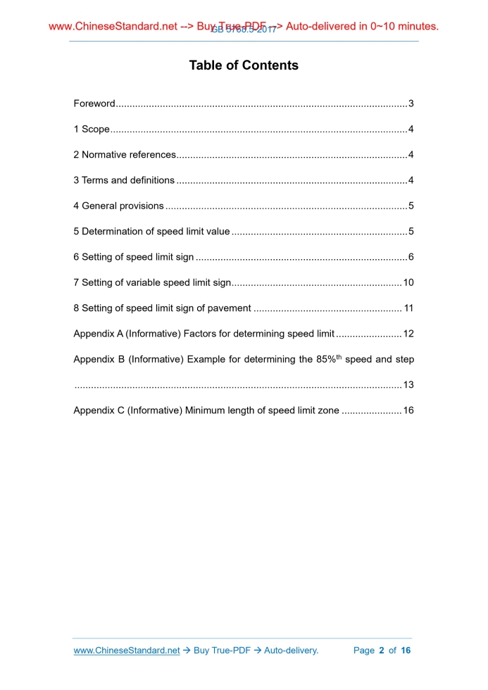 GB 5768.5-2017: Road traffic signs and markings - Part 5: Speed limit---This is an excerpt. Full copy of true-PDF in English version (including equations, symbols, images, flow-chart, tables, and figures etc.), auto-downloaded/delivered in 9 seconds, can be purchased online: https://www.ChineseStandard.net/PDF.aspx/GB5768.5-2017GB NATIONAL STANDARD OF THE PEOPLE’S REPUBLIC OF CHINA ICS 03.220.20 R 80 Partially replacing GB 5768-1999 Road traffic signs and markings - Part 5.Speed limit Issued on. JULY 31, 2017 Implemented on. FEBRUARY 01, 2018 Issued by. General Administration of Quality Supervision, Inspection and Quarantine; Standardization Administration of PRC. Table of ContentsForeword... 3 1 Scope... 4 2 Normative references... 4 3 Terms and definitions... 4 4 General provisions... 5 5 Determination of speed limit value... 5 6 Setting of speed limit sign... 6 7 Setting of variable speed limit sign... 10 8 Setting of speed limit sign of pavement... 11 Appendix A (Informative) Factors for determining speed limit... 12 Appendix B (Informative) Example for determining the 85%th speed and step ... 13 Appendix C (Informative) Minimum length of speed limit zone... 16ForewordAll technical contents of this part of GB 5768 are mandatory. GB 5768 “Road traffic signs and markings” is divided into eight parts. - Part 1.General; - Part 2.Road traffic signs; - Part 3.Road traffic markings; - Part 4.Work zone; - Part 5.Speed limit; - Part 6.Highway railway grade crossing; - Part 7.Non-motorized vehicles and pedestrians; - Part 8.School area. This part is the part 5 of GB 5768. This part was drafted in accordance with the rules given in GB/T 1.1-2009. This part was proposed by the Ministry of Transport of the People’s Republic of China. This part shall under the jurisdiction of the National Traffic Engineering Facilities (Highway) Standardization Technical Committee (SAC/TC 223). Drafting organization of this part. Highway Science Research Institute of the Ministry of Transport. The main drafters of this part. Tang Zhengzheng, Liu Xingwang, He Yong, Gao Hailong, Zhang Fan, Wu Jingmei, Wang Dan, Guo Yan. This standard replaces the standard previously issued as follows. - GB 5768-1986, GB 5768-1999. Road traffic signs and markings - Part 5.Speed limit1 ScopeThis part of GB 5768 specifies the general requirements and use of speed limit for road traffic signs and markings. This part applies to the setting of the speed limit signs and markings on all kinds of roads including highway, urban roads, places which is under the jurisdiction of the unit but allows social vehicles to pass, squares, public parking lots, other places which are used for public access. The speed limit signs and markings which are set in other places where motor vehicles pass, parking lots, etc. can make reference to this standard.2 Normative referencesThe following documents are essential to the application of this document. For the dated documents, only the versions with the dates indicated are applicable to this document; for the undated documents, only the latest version (including all the amendments) are applicable to this standard. GB 5768.2-2009 Road traffic signs and markings - Part 2.Road traffic signs GB 5768.3 Road traffic signs and markings - Part 3.Road traffic markings3 Terms and definitionsThe following terms and definitions apply to this document. 3.1 Speed limit The maximum speed at which a motor vehicle is allowed to travel on a specific segment of the road. 3.2 Design speed The speed which is used in the geometric design of the road. 3.4 Advisory speed The drive speed of a vehicle as recommended for a road segment according to the design, traffic characteristics and environmental conditions of the road. 3.5 Speed zone A road segment or a road network to which a certain speed limit sign applies.4 General provisions4.1 The speed limit sign shall be set at the starting point where the speed change is limited. 4.2 The speed limit value on the speed limit sign shall be the speed limit which is specified by laws and regulations, or the speed limit which is demonstrated by traffic engineering and approved by the competent authority. 4.4 At a specific location, after analysis and demonstration, it may use the recommended speed sign below the limit speed value, together with the relevant warning signs, to remind the driver to decelerate.5 Determination of speed limit value5.1 Consider road function, operating speed, road environment, historical accidents, etc., as shown in Appendix A. 5.2 The speed limit value is based on the design speed value of the road, it may take the design speed value or the value less than the design speed. Under the premise of complying with the law, the speed limit value can also be increased by 10 km/h ~ 20 km/h, but not higher than 120 km/h. 5.3 Observe or predict some representative sections in the speed limit zone, to determine the 85%th speed, as shown in Appendix B. Based on the 85%th speed value, take the value in the range 5 km/h ~ 10 km/h above and below it. When selecting the representative section, it shall avoid the influence of the intersection under the signal control. 5.6 In the road segment where the environment is complex and there is lateral interference, the limit speed should not be higher than the design speed. 5.7 The speed limit value is an integral multiple of 10 km/h. 5.8 When the road function or environment changes greatly, it should evaluate the speed limit value and adjust the speed limit value as needed. 5.9 See Appendix C for the minimum length of the speed limit zone.6 Setting of speed limit sign6.1 The speed limit sign should be set at the starting point of the speed limit zone. 6.2 It can be set repeatedly at such positions at the entry and behind the level crossing of the expressway, the primary road as the trunk line, the urban highway, or the positions where the driver needs to be reminded. 6.5 For the road of 3 lanes and above in the same direction, it
