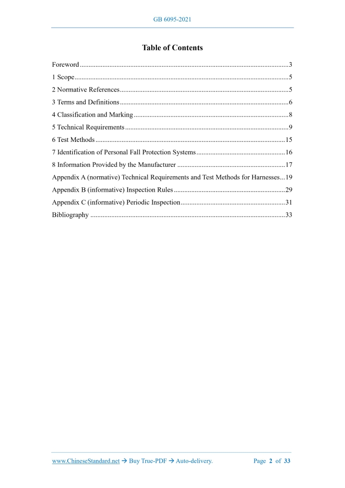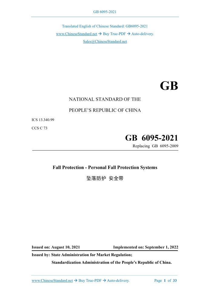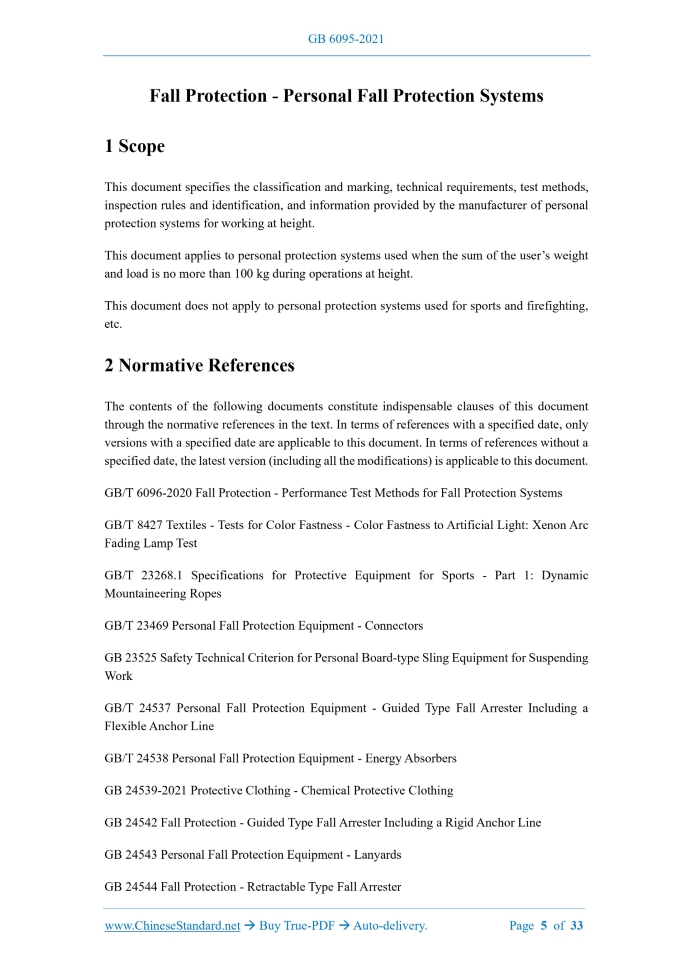 GB 6095-2021: Fall protection - Personal fall protection systems---This is an excerpt. Full copy of true-PDF in English version (including equations, symbols, images, flow-chart, tables, and figures etc.), auto-downloaded/delivered in 9 seconds, can be purchased online: https://www.ChineseStandard.net/PDF.aspx/GB6095-2021GB NATIONAL STANDARD OF THE PEOPLE’S REPUBLIC OF CHINA ICS 13.340.99 CCS C 73 Replacing GB 6095-2009 Fall Protection - Personal Fall Protection Systems ISSUED ON: AUGUST 10, 2021 IMPLEMENTED ON: SEPTEMBER 1, 2022 Issued by: State Administration for Market Regulation; Standardization Administration of the People’s Republic of China. Table of ContentsForeword ... 3 1 Scope ... 5 2 Normative References ... 5 3 Terms and Definitions ... 6 4 Classification and Marking ... 8 5 Technical Requirements ... 9 6 Test Methods ... 15 7 Identification of Personal Fall Protection Systems ... 16 8 Information Provided by the Manufacturer ... 17 Appendix A (normative) Technical Requirements and Test Methods for Harnesses ... 19 Appendix B (informative) Inspection Rules ... 29 Appendix C (informative) Periodic Inspection ... 31 Bibliography ... 33 Fall Protection - Personal Fall Protection Systems1 ScopeThis document specifies the classification and marking, technical requirements, test methods, inspection rules and identification, and information provided by the manufacturer of personal protection systems for working at height. This document applies to personal protection systems used when the sum of the user’s weight and load is no more than 100 kg during operations at height. This document does not apply to personal protection systems used for sports and firefighting, etc.2 Normative ReferencesThe contents of the following documents constitute indispensable clauses of this document through the normative references in the text. In terms of references with a specified date, only versions with a specified date are applicable to this document. In terms of references without a specified date, the latest version (including all the modifications) is applicable to this document. GB/T 6096-2020 Fall Protection - Performance Test Methods for Fall Protection Systems GB/T 8427 Textiles - Tests for Color Fastness - Color Fastness to Artificial Light: Xenon Arc Fading Lamp Test GB/T 23268.1 Specifications for Protective Equipment for Sports - Part 1: Dynamic Mountaineering Ropes GB/T 23469 Personal Fall Protection Equipment - Connectors GB 23525 Safety Technical Criterion for Personal Board-type Sling Equipment for Suspending Work GB/T 24537 Personal Fall Protection Equipment - Guided Type Fall Arrester Including a Flexible Anchor Line GB/T 24538 Personal Fall Protection Equipment - Energy Absorbers GB 24539-2021 Protective Clothing - Chemical Protective Clothing GB 24542 Fall Protection - Guided Type Fall Arrester Including a Rigid Anchor Line GB 24543 Personal Fall Protection Equipment - Lanyards GB 24544 Fall Protection - Retractable Type Fall Arrester GB 30862 Personal Fall Protection Equipment - Anchor Devices GB/T 38230 Personal Fall Protection Equipment - Descender Devices GB 38454 Personal Fall Protection Equipment - Horizontal Lifeline Device3 Terms and DefinitionsThe following terms and definitions are applicable to this document. 3.1 personal fall protection systems A system of individual fall protection equipment that secures operating personnels’ positions during operations at height, climbing and suspension operations, prevents them from falling, or safely suspends them after a fall. 3.2 work positioning systems An individual fall protection system that uses ropes or belts wrapped around a fixed structure to bind the human body to the vicinity of a fixed structure to prevent the person from slipping and allow the operating personnels’ both hands to perform other operations. 3.3 restraint systems Individual fall protection systems that restrain the range of movement of operating personnels to prevent them from reaching areas where a fall may occur. 3.4 fall arrest systems When an operating personnel falls, individual fall protection systems that will safely suspend the operating personnel through braking. 3.5 lanyard A rope or strap that connects the harnesses to the anchor in the personal protection systems. NOTE: lanyard generally serves to expand or restrain the wearer’s range of movement and absorb the impact energy. 3.6 energy absorber A component connected in series between the harnesses and the anchor to absorb part of the impact energy and reduce the impact force when a fall occurs. 3.7 retractable type fall arrester A component connected in series between the harnesses and the anchor, equipped with a rope or belt that can be extended or retracted as the personnel moves, and can trigger a locking and braking effect due to speed changes when a fall occurs. 3.8 guided type fall arrester A component attached to the anchor line that triggers the braking action when falling. 3.9 harnesses A component that attaches the personal protection systems to the human body, and supports and controls the human body, and disperses the impact force when falling. NOTE: the harnesses are made of webbing, buckles and other metal components. There are generally full-body harnesses, single waist harnesses and half-body harnesses. 3.10 primary strap The webbing in the harnesses that directly bears the impact force. 3.11 secondary strap The webbing in the harnesses that does not directly bear the impact force. 3.12 deploy distance During the test, when the fall stops, the vertical distance from the test anchor to the lowest point of the torso test mass in the suspended state. 3.13 fall distance The maximum vertical distance from the starting point of the fall or the operating surface to the lowest point of the body that wears the personal protection systems. 3.14 safety space A three-dimensional space located below the operating surface, without objects can cause collision damage to the fall