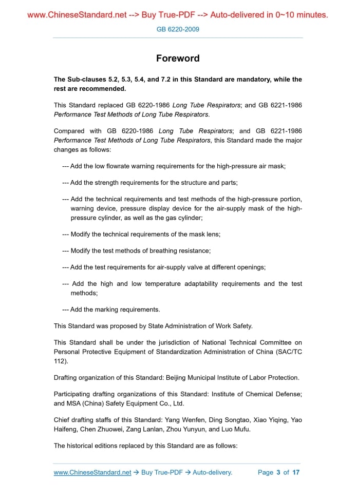 GB 6220-2009: Respiratory Protection - Long Tube Breathing Apparatus---This is an excerpt. Full copy of true-PDF in English version (including equations, symbols, images, flow-chart, tables, and figures etc.), auto-downloaded/delivered in 9 seconds, can be purchased online: https://www.ChineseStandard.net/PDF.aspx/GB6220-2009NATIONAL STANDARD OF THE PEOPLE’S REPUBLIC OF CHINA ICS 13.340.30 C 73 Replacing GB 6220-1986, GB 6221-1986 Respiratory Protection - Long Tube Breathing Apparatus Issued on: APRIL 13, 2009 Implemented on: DECEMBER 01, 2009 Issued by. General Administration of Quality Supervision, Inspection and Quarantine; Standardization Administration of PRC. Table of ContentsForeword... 3 1 Scope... 5 2 Normative References... 5 3 Terms and Definitions... 5 4 Product Classification and Composition... 8 5 Technical Requirements... 8 6 Test Methods... 14 7 Marking... 17ForewordThe Sub-clauses 5.2, 5.3, 5.4, and 7.2 in this Standard are mandatory, while the rest are recommended. This Standard replaced GB 6220-1986 Long Tube Respirators; and GB 6221-1986 Performance Test Methods of Long Tube Respirators. Compared with GB 6220-1986 Long Tube Respirators; and GB 6221-1986 Performance Test Methods of Long Tube Respirators, this Standard made the major changes as follows. --- Add the low flowrate warning requirements for the high-pressure air mask; --- Add the strength requirements for the structure and parts; --- Add the technical requirements and test methods of the high-pressure portion, warning device, pressure display device for the air-supply mask of the high- pressure cylinder, as well as the gas cylinder; --- Modify the technical requirements of the mask lens; --- Modify the test methods of breathing resistance; --- Add the test requirements for air-supply valve at different openings; --- Add the high and low temperature adaptability requirements and the test methods; --- Add the marking requirements. This Standard was proposed by State Administration of Work Safety. This Standard shall be under the jurisdiction of National Technical Committee on Personal Protective Equipment of Standardization Administration of China (SAC/TC 112). Drafting organization of this Standard. Beijing Municipal Institute of Labor Protection. Participating drafting organizations of this Standard. Institute of Chemical Defense; and MSA (China) Safety Equipment Co., Ltd. Chief drafting staffs of this Standard. Yang Wenfen, Ding Songtao, Xiao Yiqing, Yao Haifeng, Chen Zhuowei, Zang Lanlan, Zhou Yunyun, and Luo Mufu. The historical editions replaced by this Standard are as follows. --- GB 6220-1986; --- GB 6221-1986. Respiratory Protection - Long Tube Breathing Apparatus1 ScopeThis Standard specifies the product classification and composition, technical requirements, test methods and marking of long tube breathing apparatus. The products specified in this Standard are not suitable for fire-fighting and rescue sites.2 Normative ReferencesThe provisions in following documents become the provisions of this Standard through reference in this Standard. For dated references, the subsequent amendments (excluding corrigendum) or revisions do not apply to this Standard, however, parties who reach an agreement based on this Standard are encouraged to study if the latest versions of these documents are applicable. For undated references, the latest edition of the referenced document applies. GB/T 1226 General Pressure Gauge GB 2890-2009 Respiratory Protection - Non-Powered Air-Purifying Respirators GB 5099 Seamless Steel Gas Cylinders GB/T 16556-2007 Self-Contained Open-Circuit Compressed Air Breathing Apparatus DOT-CFFC Basic Requirements for Fully Wrapped Carbon-Fiber Reinforced Aluminum Lined Cylinders3 Terms and DefinitionsFor the purposes of this Document, the following terms and definitions apply. 3.1 Long tube breathing apparatus The protective article that protects the wearer's respiratory organs from the surrounding air and transports clean air for breathing through long tubes. NOTE. Long tube breathing apparatus is divided into. self-inhalation long tube breathing apparatus, powered long tube breathing apparatus, and long tube breathing apparatus with high pressure. 3.1.1 Self-inhalation long tube breathing apparatus The long tube breathing apparatus that allows the wearer to breathe spontaneously to get fresh, clean air. 3.1.2 Powered long tube breathing apparatus The long tube breathing apparatus that uses a fan or air compressor to deliver fresh, clean air to the wearer. 3.1.3 Long tube breathing apparatus with high pressure The long tube breathing apparatus that uses compressed air or high-pressure gas cylinders to deliver clean air to the wearer. NOTE 1.Also known as pressure demand long tube breathing apparatus. NOTE 2.The long tube is a pressure-bearing component during gas transmission. 3.2 Breathing tube The flexible and air-tight tube for connecting masks with long tube. 3.3 Straps A ring or sleeve to secure a long tube to the waist of the wearer. NOTE. The straps include a belt and a hanging ring. 3.4 Long tube Air-tight, flexible and long breathing tube for conveying clean air. 3.5 Tight-fitting face masks A mask that can cover the nose, mouth, and face, or a mask that can cover the eyes, nose, and mouth, and close to the head and face. NOTE 1.The tight-fitting face mask is used to ensure the isolation of the working environment by the tight-fitting frame. NOTE 2.Tight-fitting face mask are divided into full mask and half mask. 3.5.1 Full mask A tight-fitting face mask that is tight-fitting the head, and covers the eyes, face, nose, mouth, and jaw. 3.5.2 Half mask A tight-fitting face mask that is tight-fitting the head, and covers the mouth and nose, or covers the mouth, nose, and jaw. 3.6 Loose-fitting facepiece The air introduction device for positive pressure breathing protection equipment covers only the eyes, nose and mouth, and tight-fitting the face. 3.7 Continuous flow valve In an air-s