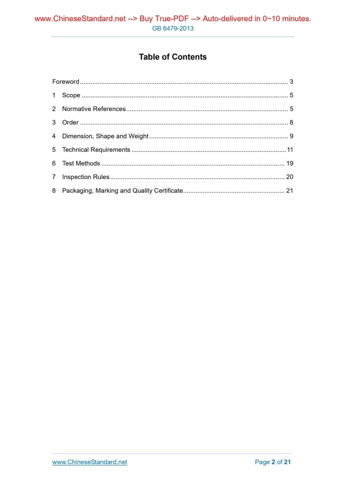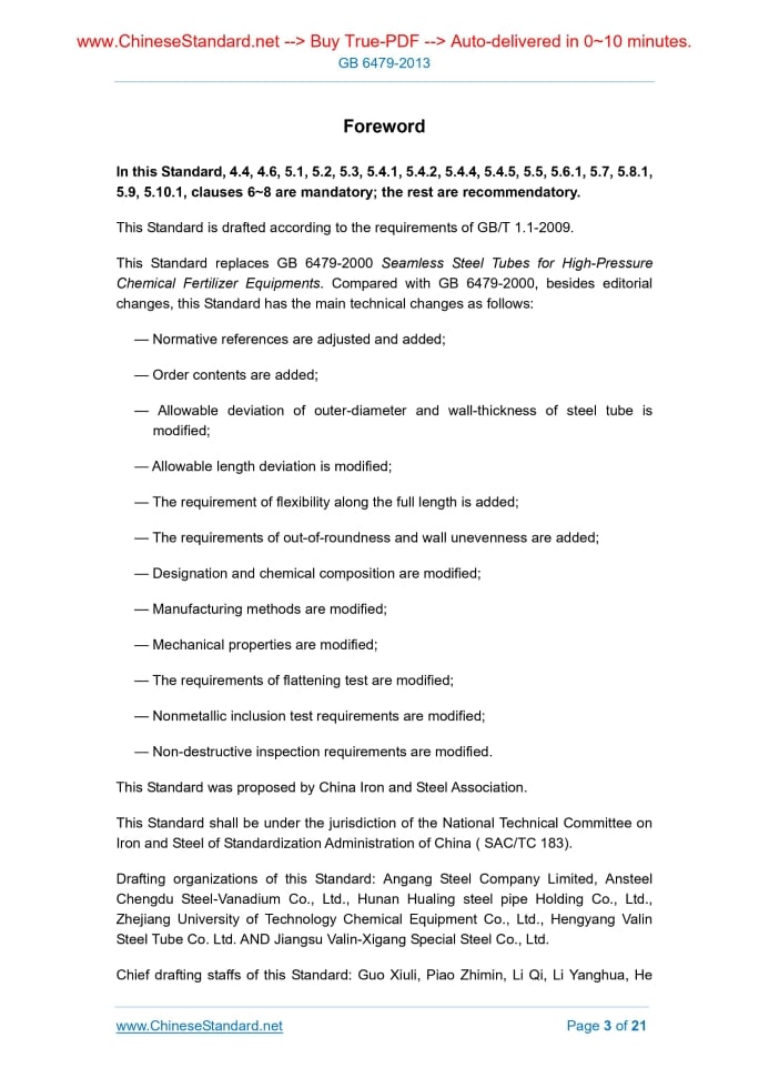 GB 6479-2013: [GB/T 6479-2013] Seamless steel tubes for high-pressure chemical fertilizer equipment---This is an excerpt. Full copy of true-PDF in English version (including equations, symbols, images, flow-chart, tables, and figures etc.), auto-downloaded/delivered in 9 seconds, can be purchased online: https://www.ChineseStandard.net/PDF.aspx/GB6479-2013 GB NATIONAL STANDARD OF THE PEOPLE’S REPUBLIC OF CHINA ICS 77.140.75 H 48 Replacing GB 6479-2000 Seamless Steel Tubes for High-Pressure Chemical Fertilizer Equipments Issued on. SEPTEMBER 18, 2013 Implemented on. JULY 1, 2014 Issued by. General Administration of Quality Supervision, Inspection and Quarantine; Standardization Administration of the People's Republic of China. Table of ContentsForeword... 3 1 Scope... 5 2 Normative References... 5 3 Order... 8 4 Dimension, Shape and Weight... 9 5 Technical Requirements... 11 6 Test Methods... 19 7 Inspection Rules... 20 8 Packaging, Marking and Quality Certificate... 21ForewordIn this Standard, 4.4, 4.6, 5.1, 5.2, 5.3, 5.4.1, 5.4.2, 5.4.4, 5.4.5, 5.5, 5.6.1, 5.7, 5.8.1, 5.9, 5.10.1, clauses 6~8 are mandatory; the rest are recommendatory. This Standard is drafted according to the requirements of GB/T 1.1-2009. This Standard replaces GB 6479-2000 Seamless Steel Tubes for High-Pressure Chemical Fertilizer Equipments. Compared with GB 6479-2000, besides editorial changes, this Standard has the main technical changes as follows. — Normative references are adjusted and added; — Order contents are added; — Allowable deviation of outer-diameter and wall-thickness of steel tube is modified; — Allowable length deviation is modified; — The requirement of flexibility along the full length is added; — The requirements of out-of-roundness and wall unevenness are added; — Designation and chemical composition are modified; — Manufacturing methods are modified; — Mechanical properties are modified; — The requirements of flattening test are modified; — Nonmetallic inclusion test requirements are modified; — Non-destructive inspection requirements are modified. This Standard was proposed by China Iron and Steel Association. This Standard shall be under the jurisdiction of the National Technical Committee on Iron and Steel of Standardization Administration of China (SAC/TC 183). Drafting organizations of this Standard. Angang Steel Company Limited, Ansteel Chengdu Steel-Vanadium Co., Ltd., Hunan Hualing steel pipe Holding Co., Ltd., Zhejiang University of Technology Chemical Equipment Co., Ltd., Hengyang Valin Steel Tube Co. Ltd. AND Jiangsu Valin-Xigang Special Steel Co., Ltd. Chief drafting staffs of this Standard. Guo Xiuli, Piao Zhimin, Li Qi, Li Yanghua, He Zhengyan, Di Liping, Chen Zhongyou, Zhao Bin, Chen Shaolin and Li Yingxiong. The previous editions replaced by this Standard are as follows. — GB6479-1986 and GB6479-2000. Seamless Steel Tubes for High-Pressure Chemical Fertilizer Equipments1 ScopeThis Standard specifies seamless steel tubes for high-pressure for chemical fertilizer equipment in terms of dimension, shape, weight, technical requirements, test methods, inspection rules, packaging, marking and quality certificate, etc. This Standard is applicable to seamless steel tube for high-pressure chemical fertilizers equipment and pipeline or the ones for other chemical equipment.2 Normative ReferencesThe following referenced documents are indispensable for the application of this document. For dated reference, only the edition cited applies. For undated reference, the latest edition of the normative document (including any amendments) applies. GB/T 222 Permissible Tolerances for Chemical Composition of Steel Products GB/T 223.3 Methods for Chemical Analysis of Iron, Steel and Alloy - The Diantipyrylmethane Phosphomolybdate Gravimetric Method for the Determination of Phosphorus Content GB/T 223.5 Steel and Iron - Determination of Acid-soluble Silicon and Total Silicon Content - Reduced Molybdosilicate Spectrophotometric Method GB/T 223.11 Iron Steel and Alloy - Determination of Chromium Content - Visual Titration or Potentiometric Titration Method GB/T 223.12 Methods for Chemical Analysis of Iron, Steel and Alloy - The Sodium Carbonate Separation-Diphenyl Carbazide Photometric Method for the Determination of Chromium Content3 OrderFor the purpose of this Standard, the order contract or order form shall include the following information.4 Dimension, Shape and Weight4.1 Outer-diameter and wall-thickness 4.1.1 The nominal outer-diameter (D) and nominal wall-thickness (S) of steel tubes shall meet those specified in GB/T 17395. 4.2 Allowable deviation of outer-diameter and wall-thickness 4.2.1 Allowable deviation of outer-diameter and wall-thickness of hot rolled (squeezed and extended) steel tubes shall be in accordance with those specified in Table 1. 4.2.2 Allowable deviation of outer-diameter and wall-thickness of cold-drawn (rolled) steel tube shall meet those specified in Table 2. 4.3 Length 4.3.1 General length General length of steel tubes is 4000mm ~12000 mm. Based on the agreement of both Seller and Buyer, the steel tubes longer than 12000mm and the ones with length between 3000mm and 4000mm may be delivered if indicated in the contract; the quantity shall not exceed 5% of the total quantity delivered at this batch. 4.3.2 Specified length and multiple length 4.4 Curvature 4.4.1 Curvature per meter of steel tubes shall meet those specified in Table 3. 4.5 Out-of-roundness and wall unevenness As required by the Buyer, based on the agreement of both Seller and Buyer and also indicated in the contract, the out-of-roundness and wall unevenness of steel tubes shall not exceed 80% of the tolerance of outer-diameter and wall-thickness respectively. 4.6 End shape The surface of both ends of steel tube shall be vertical to the axis and the cutting burrs shall be cleared away. 4.7 Delivery weight5 Technical Requirements5.1 Designation and chemical composition 5.1.1 Designat