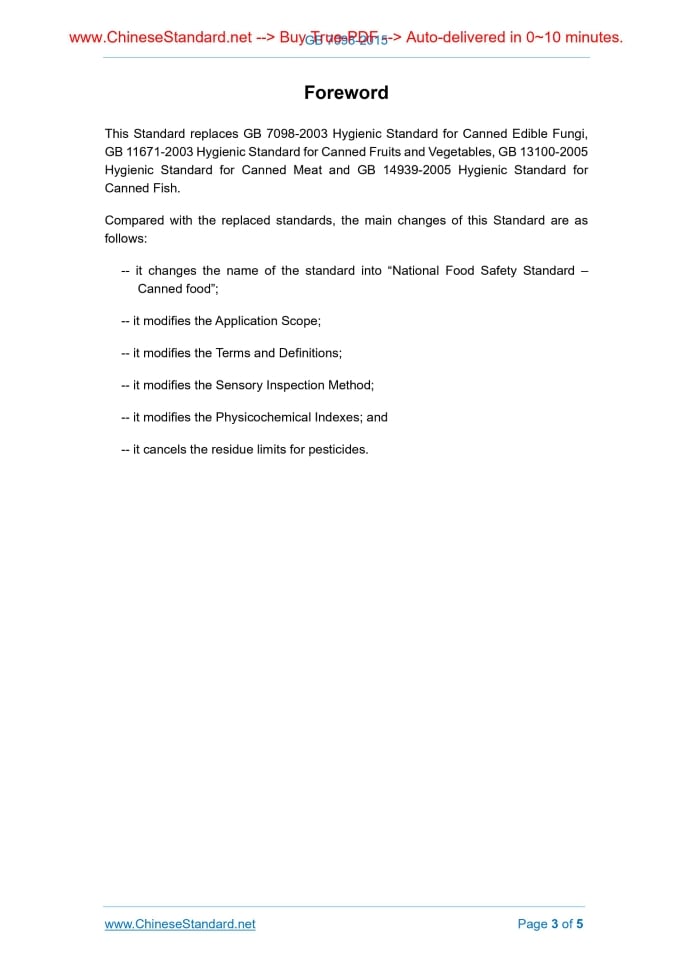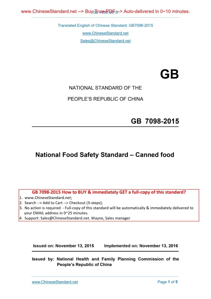 GB 7098-2015: Hygienic standard for canned edible fungi---This is an excerpt. Full copy of true-PDF in English version (including equations, symbols, images, flow-chart, tables, and figures etc.), auto-downloaded/delivered in 9 seconds, can be purchased online: https://www.ChineseStandard.net/PDF.aspx/GB7098-2015GB NATIONAL STANDARD OF THE PEOPLE’S REPUBLIC OF CHINA National Food Safety Standard – Canned food Issued on: NOVEMBER 13, 2015 Implemented on: NOVEMBER 13, 2016 Issued by. National Health and Family Planning Commission of the People’s Republic of China Table of ContentsForeword... 3 1 Scope... 4 2 Terms and Definitions... 4 3 Technical Requirements... 4ForewordThis Standard replaces GB 7098-2003 Hygienic Standard for Canned Edible Fungi, GB 11671-2003 Hygienic Standard for Canned Fruits and Vegetables, GB 13100-2005 Hygienic Standard for Canned Meat and GB 14939-2005 Hygienic Standard for Canned Fish. Compared with the replaced standards, the main changes of this Standard are as follows. -- it changes the name of the standard into “National Food Safety Standard – Canned food”; -- it modifies the Application Scope; -- it modifies the Terms and Definitions; -- it modifies the Sensory Inspection Method; -- it modifies the Physicochemical Indexes; and -- it cancels the residue limits for pesticides. ......Source: Above contents are excerpted from the full-copy PDF -- translated/reviewed by: www.ChineseStandard.net / Wayne Zheng et al. |