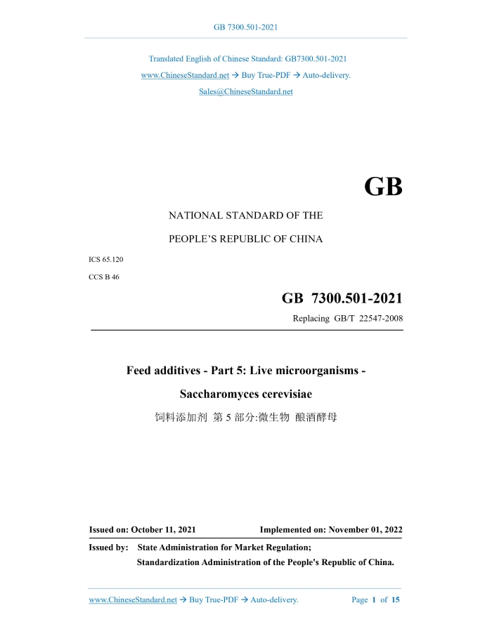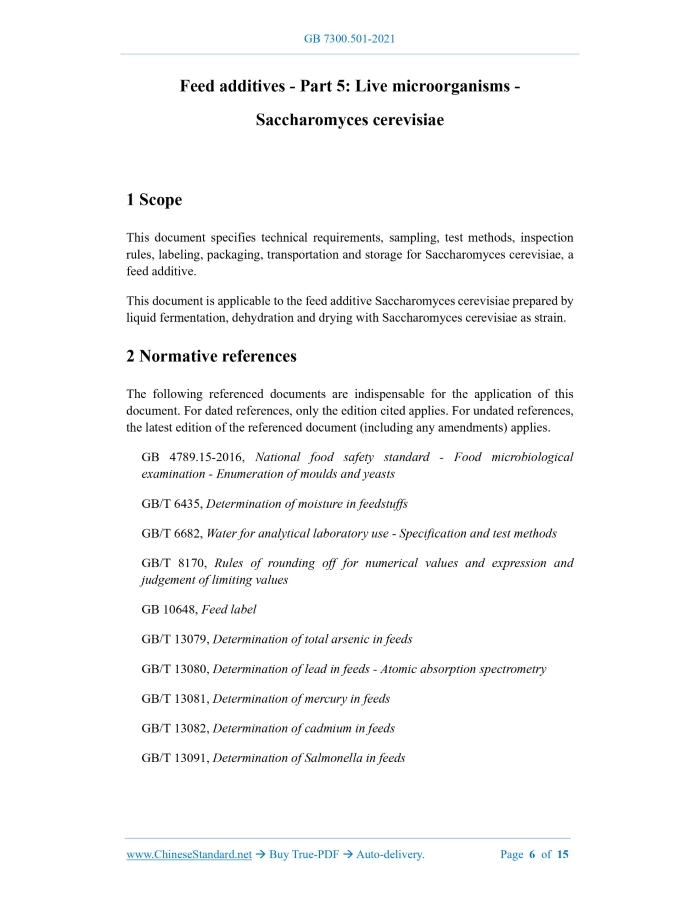 GB 7300.501-2021: Feed Additives - Part 5: Live microorganisms - Saccharomyces cerevisiae Delivery: 9 seconds. True-PDF full-copy in English & invoice will be downloaded + auto-delivered via email. See step-by-step procedure Status: Valid