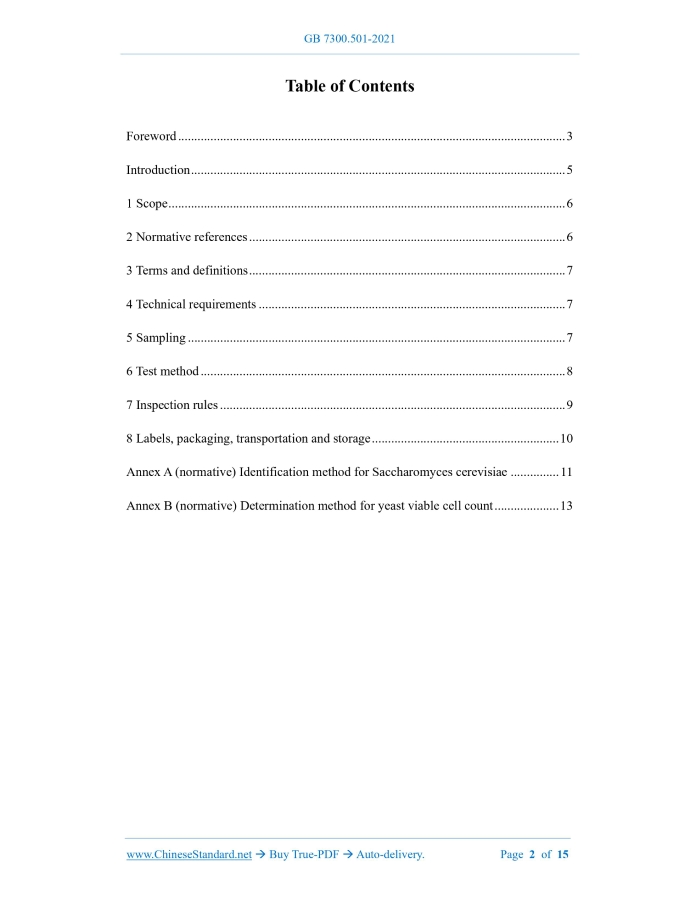 Similar standardsGB 7300.501-2021: Feed Additives - Part 5: Live microorganisms - Saccharomyces cerevisiae---This is an excerpt. Full copy of true-PDF in English version (including equations, symbols, images, flow-chart, tables, and figures etc.), auto-downloaded/delivered in 9 seconds, can be purchased online: https://www.ChineseStandard.net/PDF.aspx/GB7300.501-2021GB NATIONAL STANDARD OF THE PEOPLE’S REPUBLIC OF CHINA ICS 65.120 CCS B 46 Replacing GB/T 22547-2008 Feed additives - Part 5: Live microorganisms - Saccharomyces cerevisiae ISSUED ON: OCTOBER 11, 2021 IMPLEMENTED ON: NOVEMBER 01, 2022 Issued by: State Administration for Market Regulation; Standardization Administration of the People's Republic of China. Table of ContentsForeword ... 3 Introduction ... 5 1 Scope ... 6 2 Normative references ... 6 3 Terms and definitions ... 7 4 Technical requirements ... 7 5 Sampling ... 7 6 Test method ... 8 7 Inspection rules ... 9 8 Labels, packaging, transportation and storage ... 10 Annex A (normative) Identification method for Saccharomyces cerevisiae ... 11 Annex B (normative) Determination method for yeast viable cell count ... 13 Feed additives - Part 5: Live microorganisms - Saccharomyces cerevisiae1 ScopeThis document specifies technical requirements, sampling, test methods, inspection rules, labeling, packaging, transportation and storage for Saccharomyces cerevisiae, a feed additive. This document is applicable to the feed additive Saccharomyces cerevisiae prepared by liquid fermentation, dehydration and drying with Saccharomyces cerevisiae as strain.2 Normative referencesThe following referenced documents are indispensable for the application of this document. For dated references, only the edition cited applies. For undated references, the latest edition of the referenced document (including any amendments) applies. GB 4789.15-2016, National food safety standard - Food microbiological examination - Enumeration of moulds and yeasts GB/T 6435, Determination of moisture in feedstuffs GB/T 6682, Water for analytical laboratory use - Specification and test methods GB/T 8170, Rules of rounding off for numerical values and expression and judgement of limiting values GB 10648, Feed label GB/T 13079, Determination of total arsenic in feeds GB/T 13080, Determination of lead in feeds - Atomic absorption spectrometry GB/T 13081, Determination of mercury in feeds GB/T 13082, Determination of cadmium in feeds GB/T 13091, Determination of Salmonella in feeds possible foreign contamination. 5.2 Sampling method 5.2.1 Samples shall be collected in the same batch. The sampling amount of each sample shall meet the requirements of microbiological indicator inspection. Generally, it is not less than 500g. 5.2.2 For products with independent packaging less than or equal to 500g, take the complete package. 5.2.3 For products larger than 500g individually packaged, a sterile sampler shall be used to take appropriate samples from different parts of the same package. Place them in the same sterile sampling container as one sample. 5.3 Storage and transportation of collected samples 5.3.1 Samples shall be sent to the laboratory for inspection as soon as possible. 5.3.2 Samples shall be kept intact during transportation. 5.3.3 Samples shall be stored close to their original storage temperature. Or take necessary measures to prevent changes in the number of microorganisms in the sample.6 Test methodUnless otherwise specified, only the reagents confirmed as analytically pure are used in the analysis, and the water meets the requirements of grade 3 water in GB/T 6682. 6.1 Sensory inspection Take an appropriate amount of specimen. Place on a clean white piece of paper. Observe its shape, color, presence or absence of impurities under natural light. Smell its odor. 6.2 Strain identification Carry out in accordance with Annex A. Use panel method as the arbitration method. 6.3 Yeast viable cell count Carry out in accordance with Annex B. 6.4 Moisture Carry out in accordance with GB/T 6435. 6.5 Total arsenic Carry out in accordance with GB/T 13079. 6.6 Lead Carry out in accordance with graphite furnace atomic absorption spectrometry in GB/T 13080. 6.7 Mercury Carry out in accordance with GB/T 13081. 6.8 Cadmium Carry out in accordance with GB/T 13082. 6.9 Salmonella Carry out in accordance with GB/T 13091.7 Inspection rules7.1 Batching A batch of products refer to the products of the same specification produced in the same material and in the same production process through continuous production or in the same shift. But each batch of products shall not exceed 50t. 7.2 Exit-factory inspection Appearance and properties, yeast live cell count, and moisture are the inspection items of the exit-factory inspection. 7.3 Type inspection Type inspection items are all items specified in Chapter 4 of this document. Under normal production conditions, type inspection shall be carried out at least once a year. Type inspection shall also be carried out in one of the following situations: a) When the product is stereotyped and put into production; b) When there is a major change in the production process, formula or source of main raw materials, which may affect the quality of the product; c) When production is stopped for more than 3 months and production is resumed; d) When there is a significant difference between the exit-factory inspection results and the last type inspection results;Annex A(normative) Identification method for Saccharomyces cerevisiae A.1 Morphological identification A.1.1 Culture medium A.1.1.1 Wort liquid medium: The wort is diluted with water to 10°Bx~15°Bx (Bahrain Brix Meter). Sterilize by autoclaving at 115°C for 15min. A.1.1.2 Wort agar medium: The wort is diluted with water to 10°Bx~15°Bx (Bahrain Brix Meter). Add 2% agar powder. Sterilize by autoclaving at 115°C for 15min. A.1.1.3 Sporulation medium: 0.1% of glucose, 0.18% of potassium chloride, 0.25% of yeast juice, 0.82% of sodium acetat