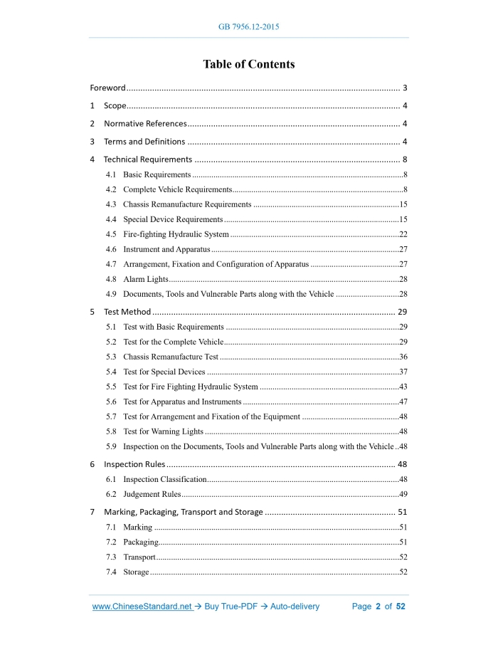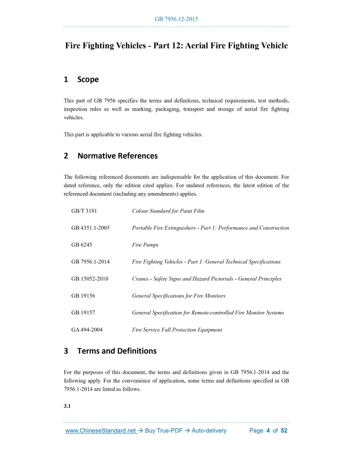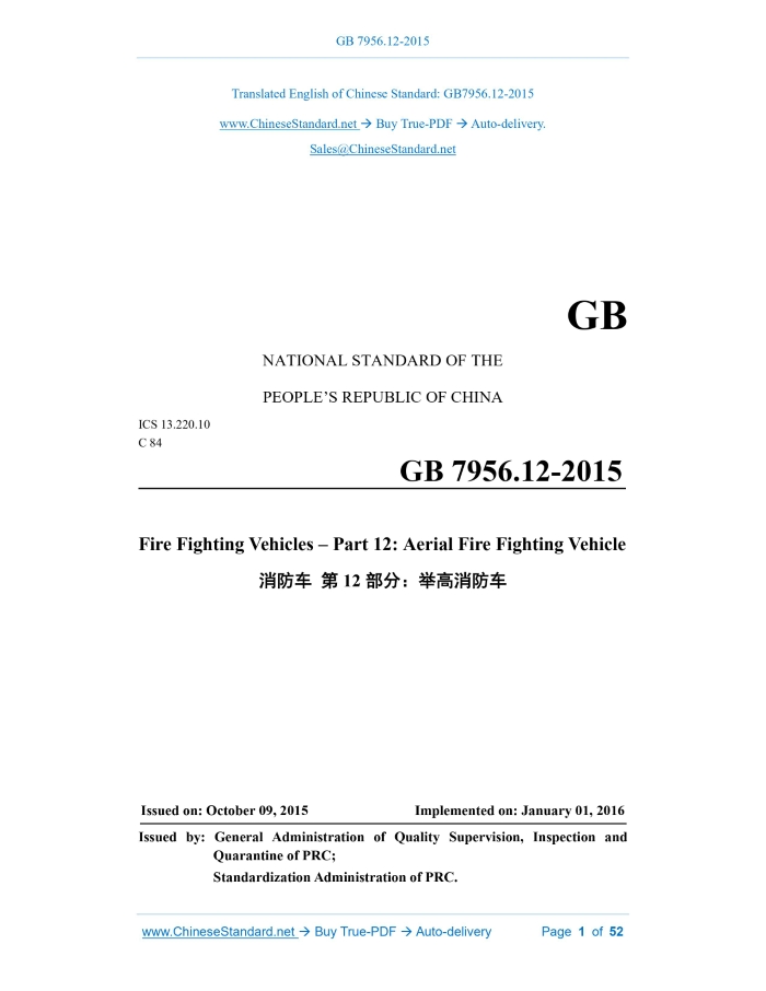 GB 7956.12-2015: Fire fighting vehicles -- Part 12: Aerial firefighting vehicle---This is an excerpt. Full copy of true-PDF in English version (including equations, symbols, images, flow-chart, tables, and figures etc.), auto-downloaded/delivered in 9 seconds, can be purchased online: https://www.ChineseStandard.net/PDF.aspx/GB7956.12-2015GB NATIONAL STANDARD OF THE PEOPLE’S REPUBLIC OF CHINA ICS 13.220.10 C 84 Fire Fighting Vehicles – Part 12.Aerial Fire Fighting Vehicle Issued on. OCTOBER 09, 2015 Implemented on. JANUARY 01, 2016 Issued by. General Administration of Quality Supervision, Inspection and Quarantine of PRC; Standardization Administration of PRC. Table of ContentsForeword... 3 1 Scope... 4 2 Normative References... 4 3 Terms and Definitions... 4 4 Technical Requirements... 8 4.1 Basic Requirements...8 4.2 Complete Vehicle Requirements...8 4.3 Chassis Remanufacture Requirements... 15 4.4 Special Device Requirements... 15 4.5 Fire-fighting Hydraulic System... 22 4.6 Instrument and Apparatus... 27 4.7 Arrangement, Fixation and Configuration of Apparatus... 27 4.8 Alarm Lights... 28 4.9 Documents, Tools and Vulnerable Parts along with the Vehicle... 28 5 Test Method... 29 5.1 Test with Basic Requirements... 29 5.2 Test for the Complete Vehicle... 29 5.3 Chassis Remanufacture Test... 36 5.4 Test for Special Devices... 37 5.5 Test for Fire Fighting Hydraulic System... 43 5.6 Test for Apparatus and Instruments... 47 5.7 Test for Arrangement and Fixation of the Equipment... 48 5.8 Test for Warning Lights... 48 5.9 Inspection on the Documents, Tools and Vulnerable Parts along with the Vehicle.. 48 6 Inspection Rules... 48 6.1 Inspection Classification... 48 6.2 Judgement Rules... 49 7 Marking, Packaging, Transport and Storage... 51 7.1 Marking... 51 7.2 Packaging... 51 7.3 Transport... 52 7.4 Storage... 521 ScopeThis part of GB 7956 specifies the terms and definitions, technical requirements, test methods, inspection rules as well as marking, packaging, transport and storage of aerial fire fighting vehicles. This part is applicable to various aerial fire fighting vehicles.2 Normative ReferencesThe following referenced documents are indispensable for the application of this document. For dated reference, only the edition cited applies. For undated references, the latest edition of the referenced document (including any amendments) applies. GB/T 3181 Colour Standard for Paint Film GB 4351.1-2005 Portable Fire Extinguishers - Part 1.Performance and Construction GB 6245 Fire Pumps GB 7956.1-2014 Fire Fighting Vehicles - Part 1.General Technical Specifications GB 15052-2010 Cranes - Safety Signs and Hazard Pictorials - General Principles GB 19156 General Specifications for Fire Monitors GB 19157 General Specification for Remote-controlled Fire Monitor Systems GA 494-2004 Fire Service Fall Protection Equipment3 Terms and DefinitionsFor the purposes of this document, the terms and definitions given in GB 7956.1-2014 and the following apply. For the convenience of application, some terms and definitions specified in GB 7956.1-2014 are listed as follows. 3.1 aerial fire fighting vehicle The fire fighting vehicle that is mainly equipped with elevating boom, slewing mechanism, etc. and used for high-altitude fire fighting and rescue as well as goods, materials and fire fighter transmission. Generally, it is classified into platform fire fighting vehicle, aerial ladder fire fighting vehicle and water tower fire fighting vehicle. 3.2 platform fire fighting vehicle The fire fighting vehicle that is mainly equipped with crank arm, straight-crank arm and rescue cage, and able to transmit fire fighter and fire extinguishing goods and materials to high altitude, rescue trapped person or spray fire extinguishing agent. [definition 3.2.1 in GB 7956.1-2014] 3.4 water tower fire fighting vehicle The fire fighting vehicle that is mainly equipped with straight arm, crank arm, straight-crank arm and liquid feed pipe, with fire monitor or forcible entry device installed at top, able to spray fire extinguishing agent at high altitude or carry out forcible entry. [definition 3.2.3 in GB 7956.1-2014]4 Technical Requirements4.1 Basic Requirements Aerial fire fighting vehicle (hereafter abbreviated as aerial fire fighting vehicle) shall comply with the requirements of this part, except the general technical requirements in GB 7956.1-2014. 4.2 Complete Vehicle Requirements 4.2.1 General requirements 4.2.2 Operating instructions and mark 4.2.2.1 Detailed illustration or literal operating instructions and warning specifications shall be arranged at operating platform of stabilizer, rescue cage and turntable of aerial fire fighting vehicle visible for the operation personnel. 4.2.3 Hydraulic system 4.2.3.1 Hydraulic oil tank volume of aerial fire fighting vehicle shall ensure the aerial fire fighting vehicle is able to continuously complete 50 operation cycles, and the temperature of hydraulic oil in the oil tank shall not be greater than 90℃. There shall be no boom (ladder) quiver, creeping or blocking due to overhigh oil temperature, and the hydraulic elements and components shall be free from oil leakage, oil penetration or damage. 4.2.4 Safety requirements 4.2.4.1 Aerial fire fighting vehicle shall possess the function of interlocking of lower- and upper-vehicles; the boom (ladder) cannot move before the stabilizer is extended and leveled and supported reliably; before boom (ladder) retracts to the support bracket, the stabilizer of lower-vehicle cannot retract. Interlock function of lower- and upper-vehicles shall be realized automatically. 4.2.4.7 The safety coefficient for pulling the rigging like steel cable, chain, etc. of boom (ladder) shall not be less than 5, and that for other rigging shall not be less than 2. 4.2.4.8 Operating platform of aerial fire fighting vehicle shall not be equipped with device that directly adjust the parameters of hydraulic or electrical system. The places for parameter ad